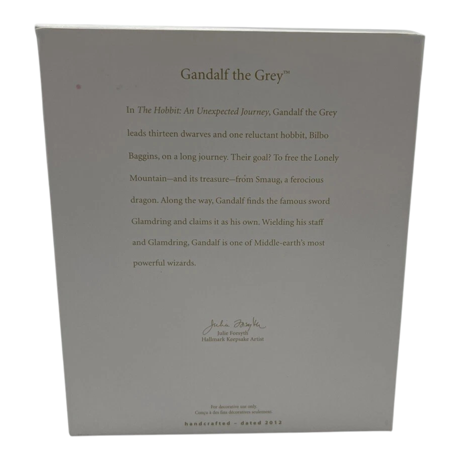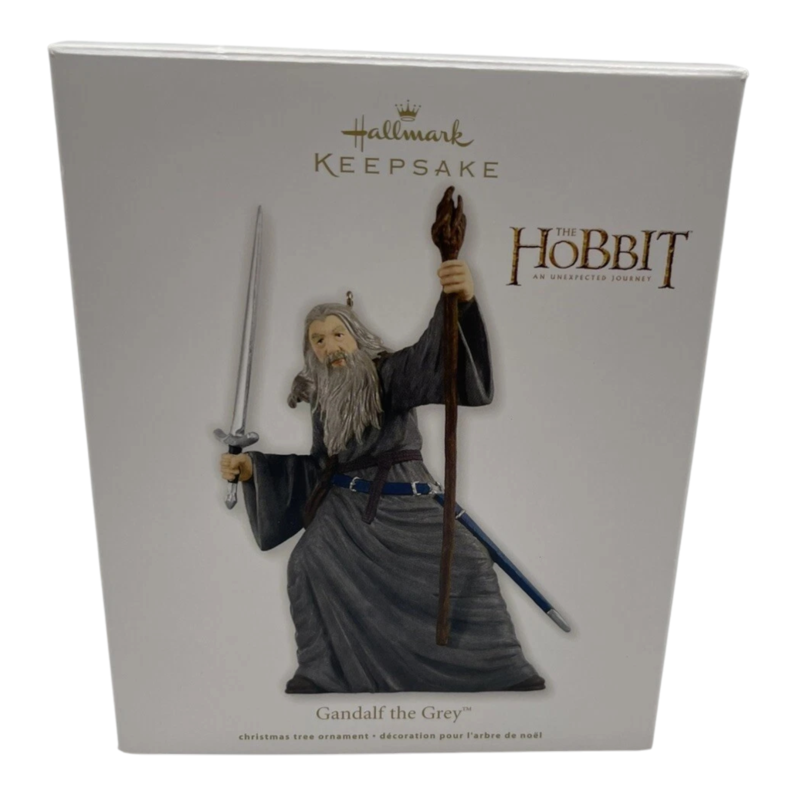 Celebrate the epic adventure of Middle-earth with this stunning ornament: Gandalf the Grey (The Hobbit). This beautifully crafted 2012 release by Hallmark captures the wizard in his iconic pose, wielding his staff and sword Glamdring in readiness for battle. Designed by artist Julie Forsyth, the ornament stands approximately 5″ tall and comes in its original box — a must for collectors or fans of the saga. No batteries, cords, or adapters are required — simply hang and enjoy the craftsmanship and detail.