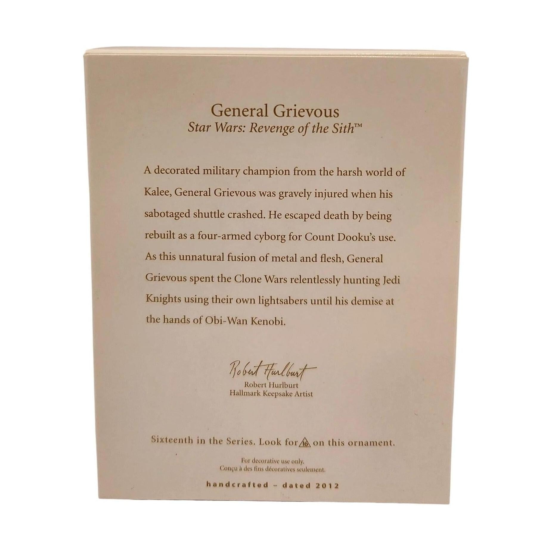 Bring the menacing power of the Separatist leader to your holiday décor with this 2012 Hallmark Collector’s ornament (#16 in the series). General Grievous is poised mid-stride, wielding his glowing green lightsaber and flowing crimson cloak—capturing his fierce pursuit on Kashyyyk. This static, detailed keepsake arrives mint-in-box with original tags and requires no batteries, cords, or power—just hang and let the dark side preside.