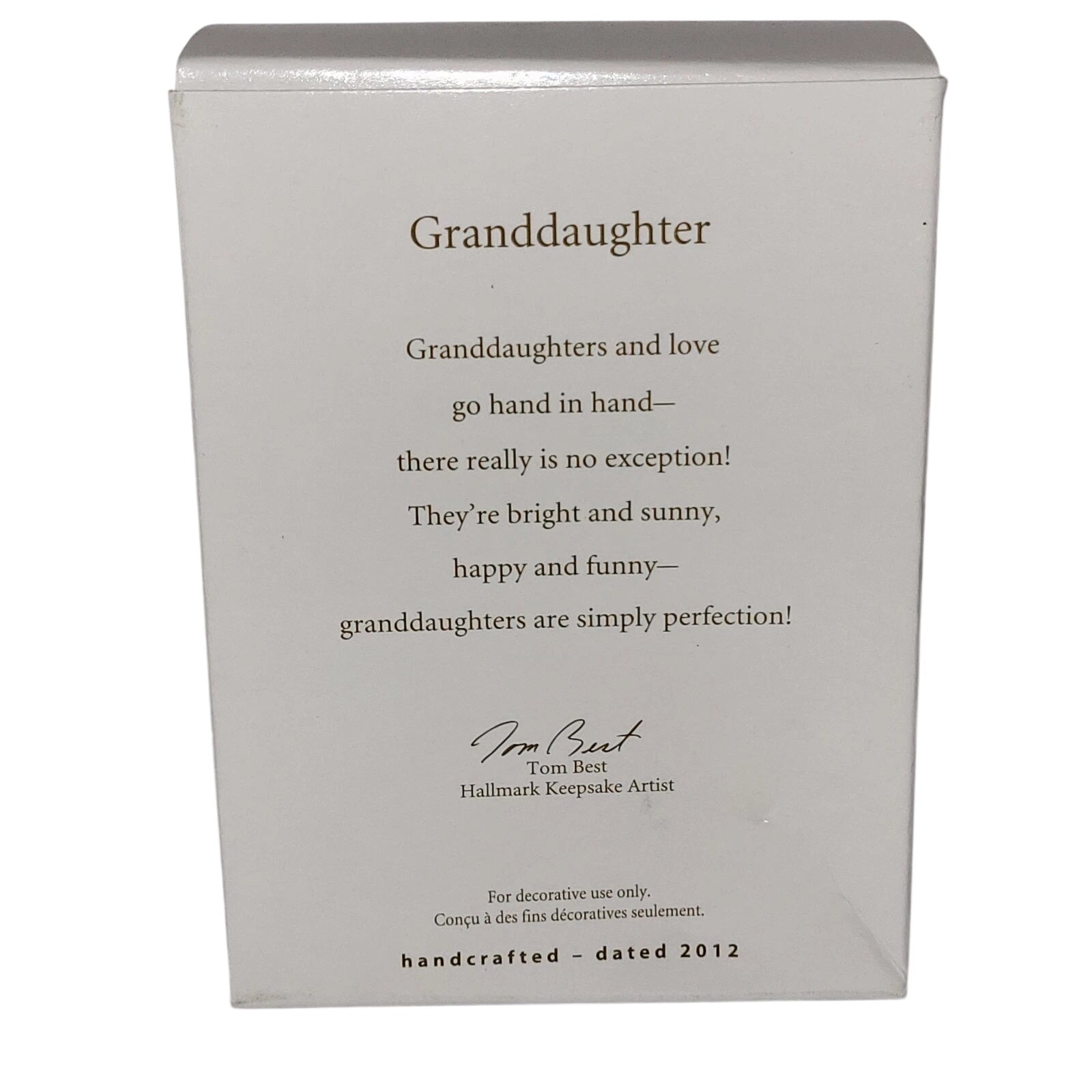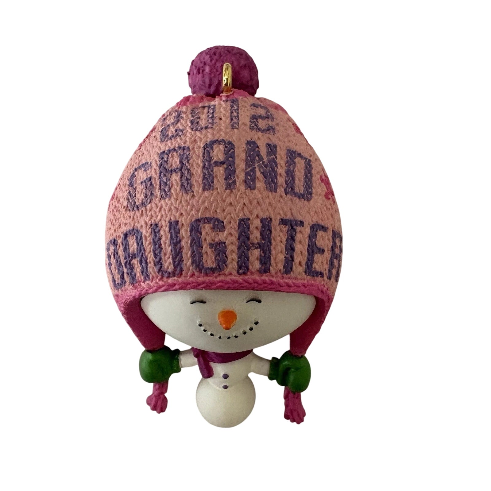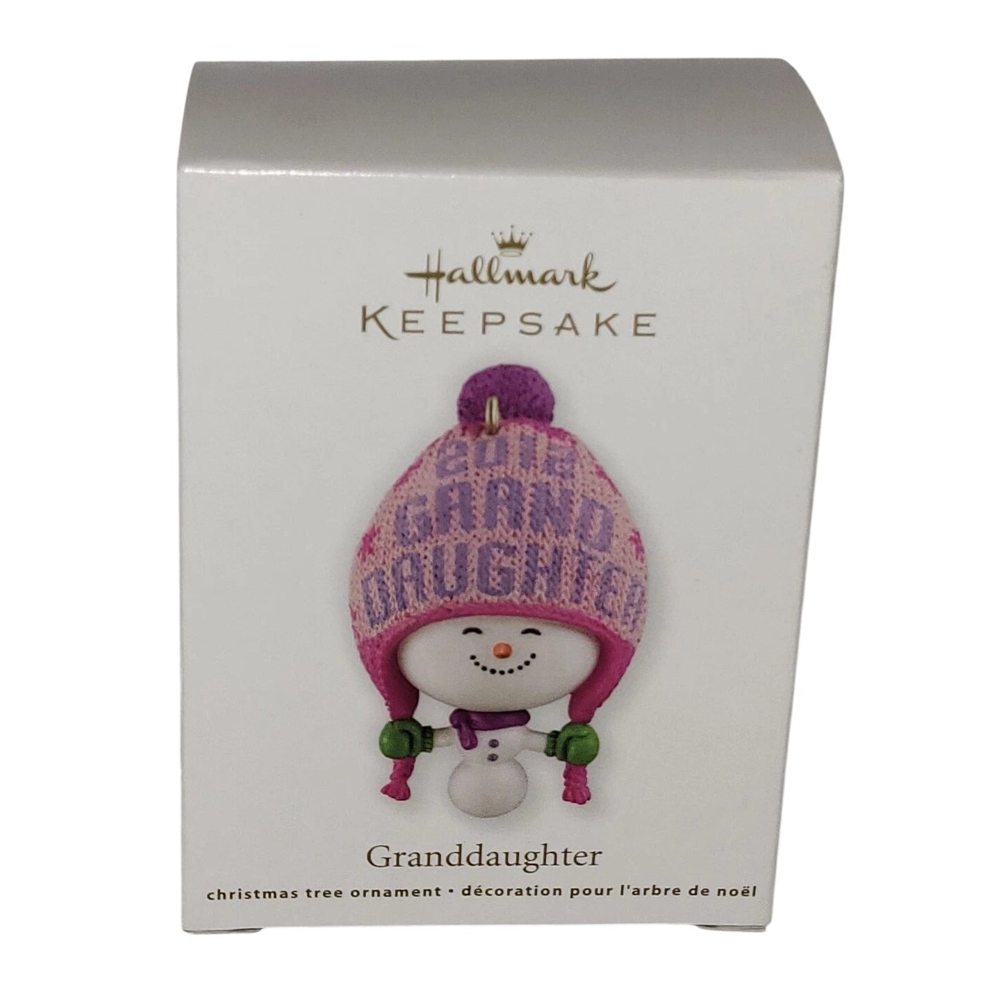 This 2012 keepsake ornament from Hallmark features a cheerful snowman wearing a pink and purple knit hat and scarf, designed to commemorate a granddaughter. The piece is dated “2012” and is part of the Family & Friends theme, making it a meaningful gift or collectible for families wishing to honour a granddaughter milestone. The charming winter-snowman design with its knit-hat detail conveys warmth, holiday spirit and personal sentiment.
