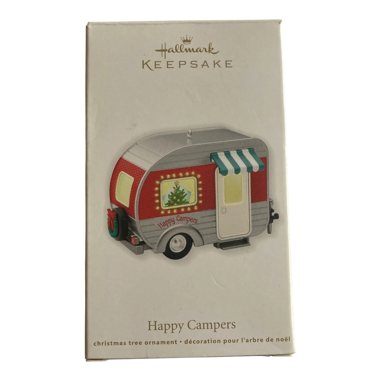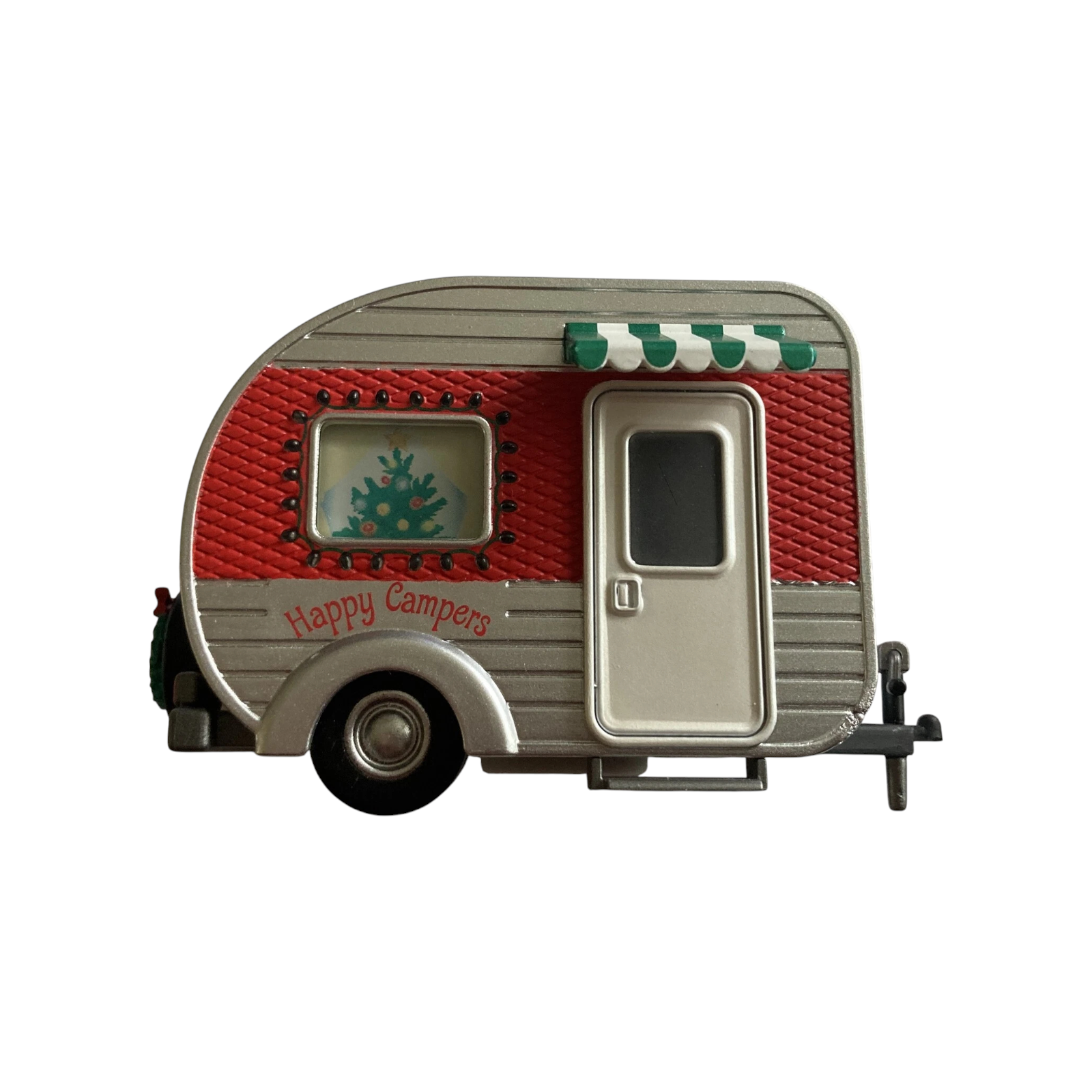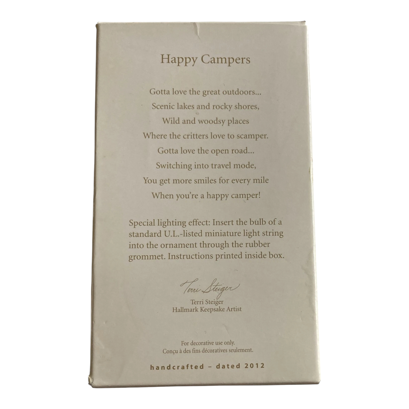 Hit the holiday trail with the fun and festive “Happy Campers” ornament from Hallmark’s 2012 collection (Item # QXG4324). This eye-catching piece features a vintage-style campground scene: a cozy trailer decorated for Christmas, complete with a wreath on the spare tire and a little tree visible through the window. Designed by artist Terri Steiger, this ornament brings a sense of outdoor adventure to your holiday décor. It comes in its original box, ready to hang. No batteries, cords, or power sources are required.