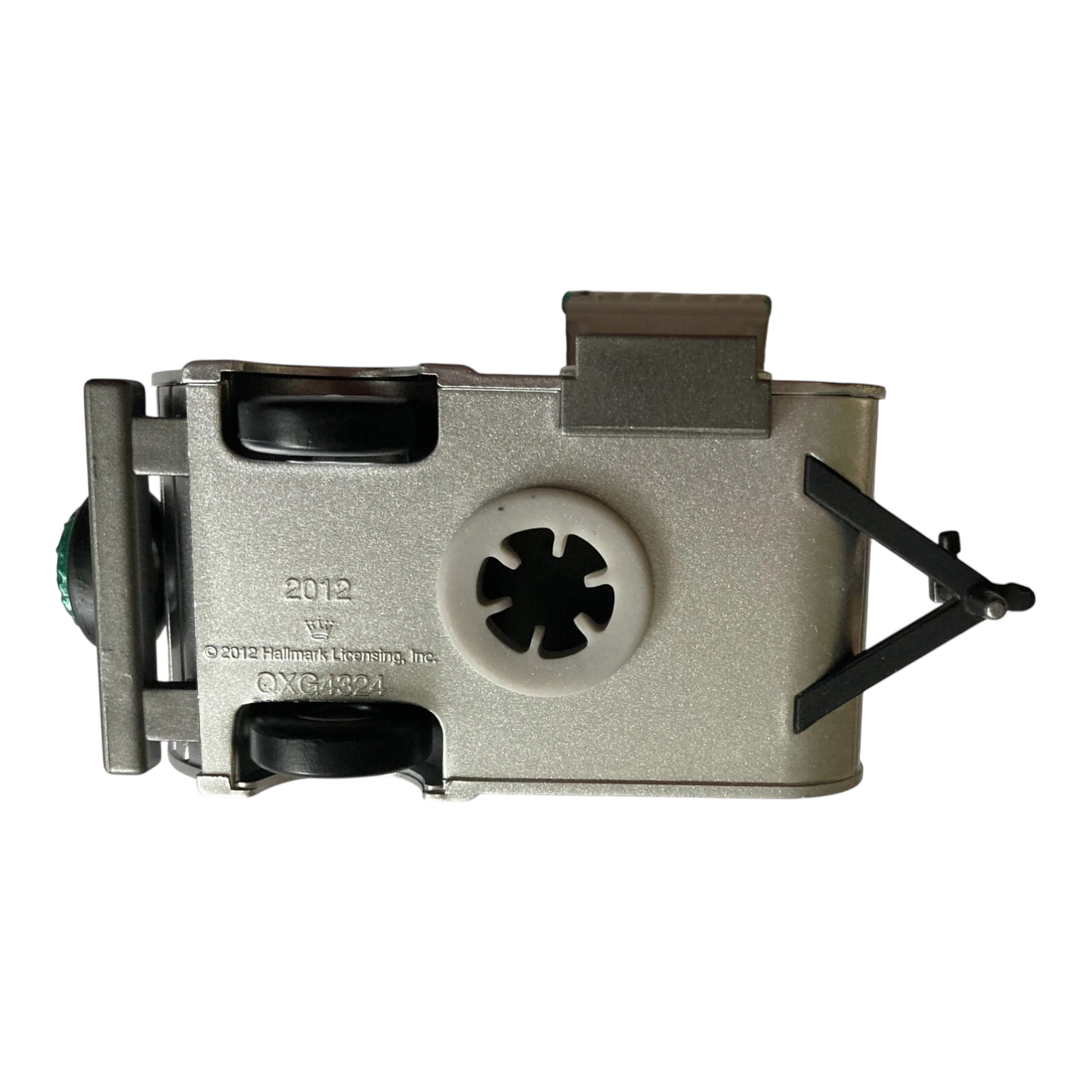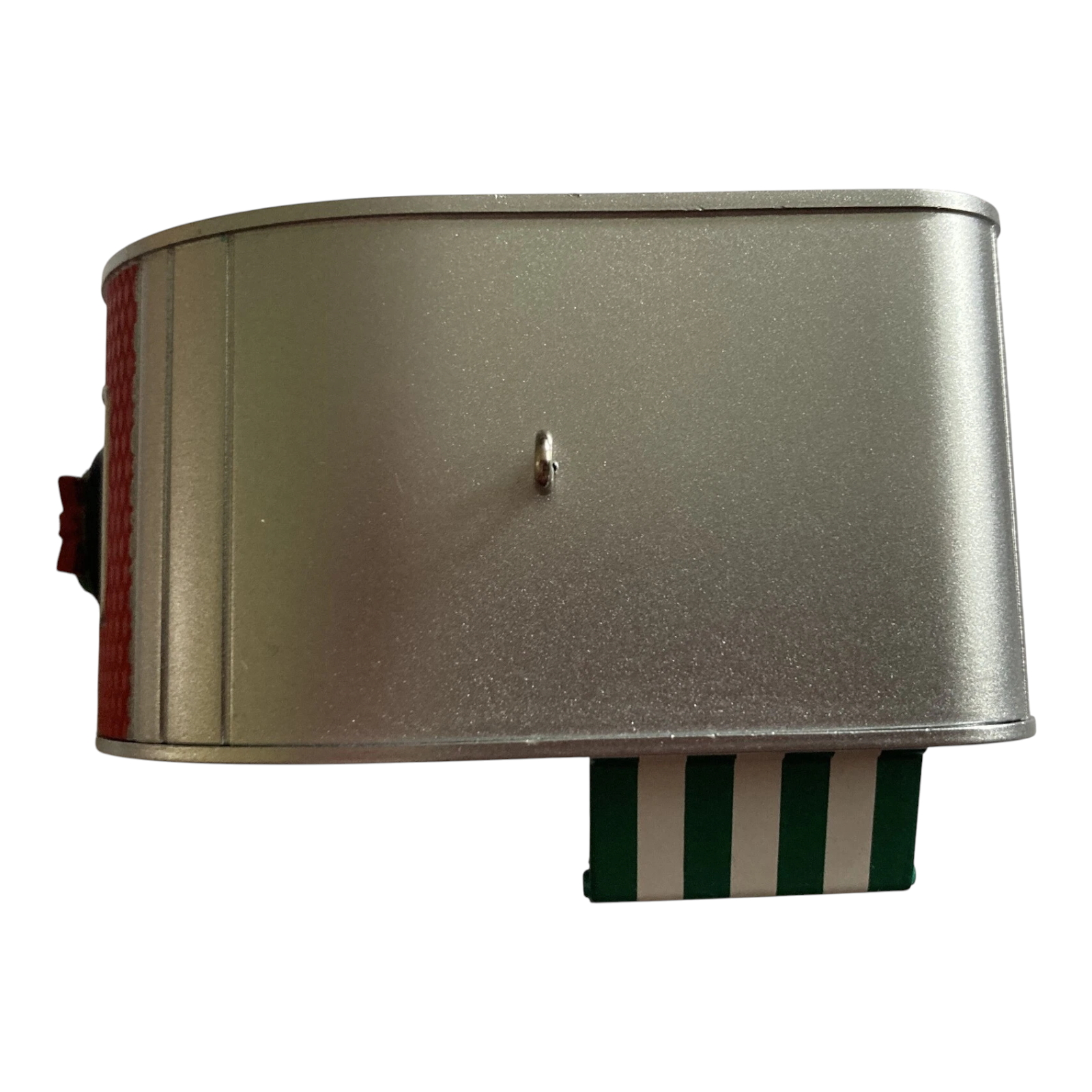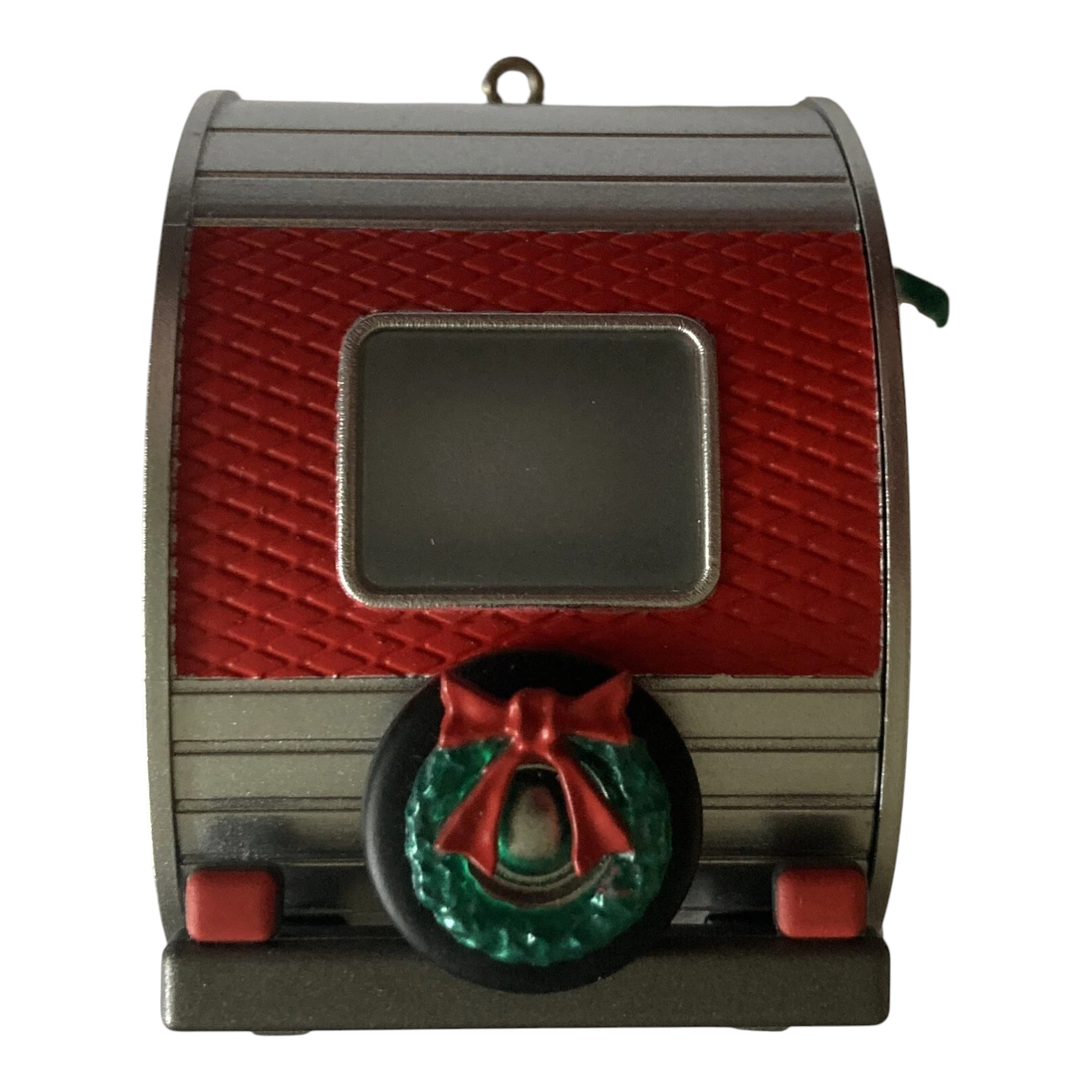 Hit the holiday trail with the fun and festive “Happy Campers” ornament from Hallmark’s 2012 collection (Item # QXG4324). This eye-catching piece features a vintage-style campground scene: a cozy trailer decorated for Christmas, complete with a wreath on the spare tire and a little tree visible through the window. Designed by artist Terri Steiger, this ornament brings a sense of outdoor adventure to your holiday décor. It comes in its original box, ready to hang. No batteries, cords, or power sources are required.