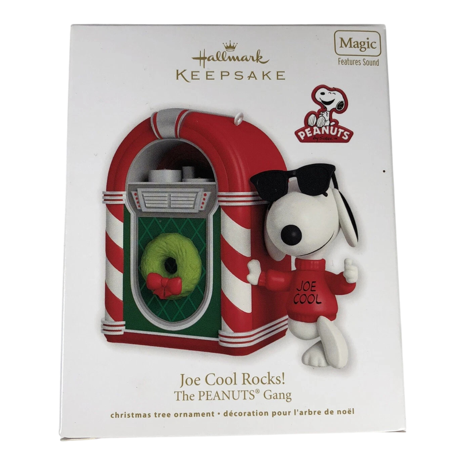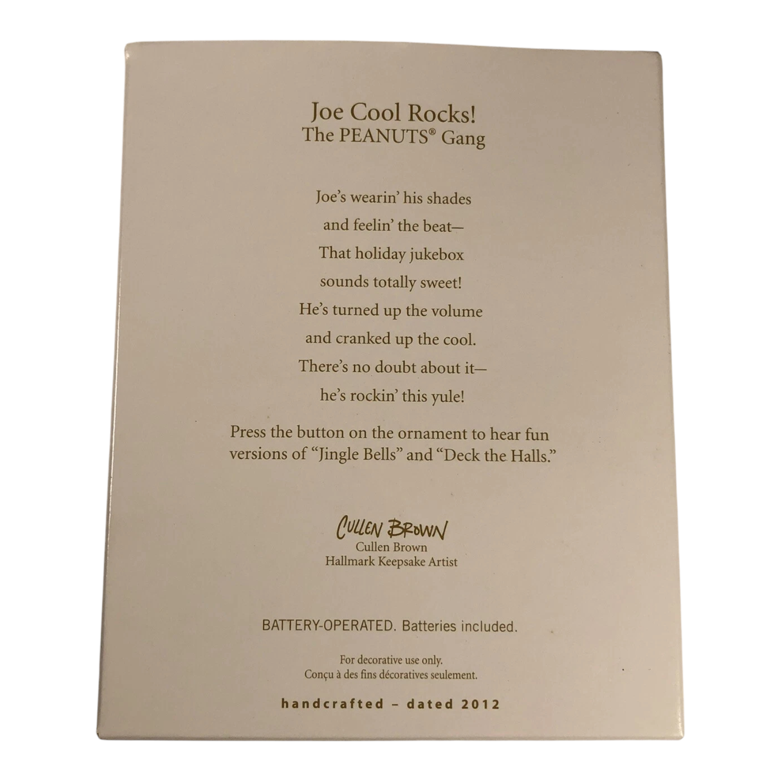 Let Snoopy's coolest alter-ego take center stage with this 2012 Joe Cool Rocks! magic ornament. Snoopy, sporting his signature shades and "Joe Cool" sweater, leans casually against a festive jukebox that plays "Jingle Bells" and "Deck the Halls" at the flick of a switch. Plug in three included LR44 batteries, and watch the lights and music bring your tree to life. Mint-in-box with original Hallmark tags and collector insert.