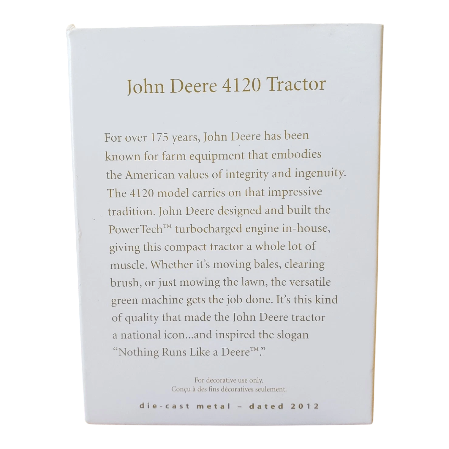 This ornament from the 2012 Hallmark Keepsake series features a detailed representation of the iconic green and yellow tractor model — the John Deere 4120 — crafted in die-cast metal with turnable wheels. The piece highlights the long heritage of John Deere farm equipment by combining the durability of metal with a festive hanging-ornament format. The design appeals both to tractor/farming enthusiasts and those building a themed tree of transportation or farm-equipment décor.