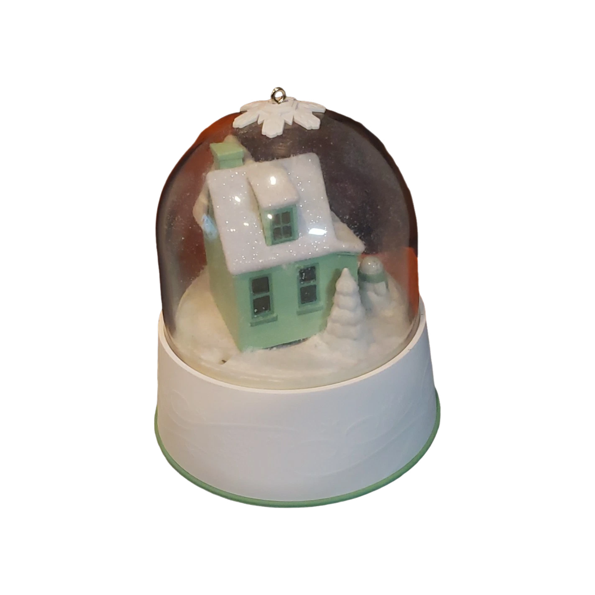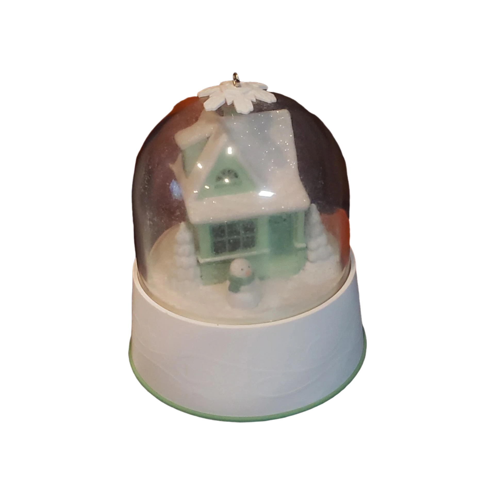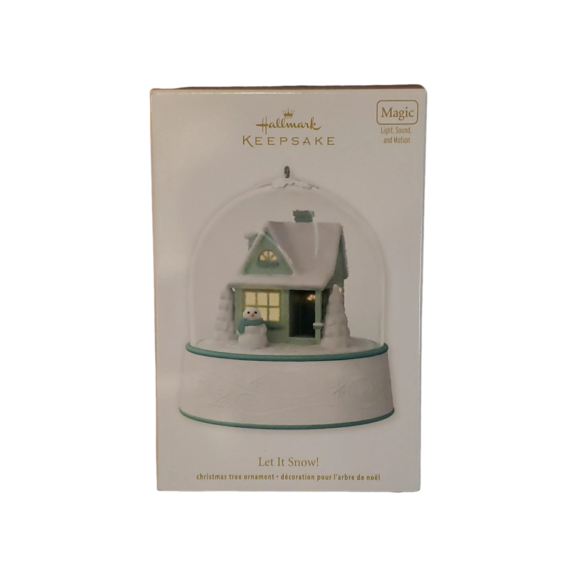 This 2012 “Let It Snow!” ornament is a festive Magic-ornament from Hallmark, designed to evoke a cozy winter night. The ornament depicts a little green cottage with a front yard featuring a snowman and evergreen trees. When you press the activation button, the scene lights up and ethereal “snowflakes” swirl around inside — simulating a gentle snowfall — while the classic holiday song “Let It Snow! Let It Snow! Let It Snow!” (as sung by Dean Martin) plays, creating a warm and nostalgic holiday ambiance. It’s a full décor piece: a snow-covered house, snowman, gently swaying trees, and ambient lights all combine to capture a cozy, wintry holiday moment.