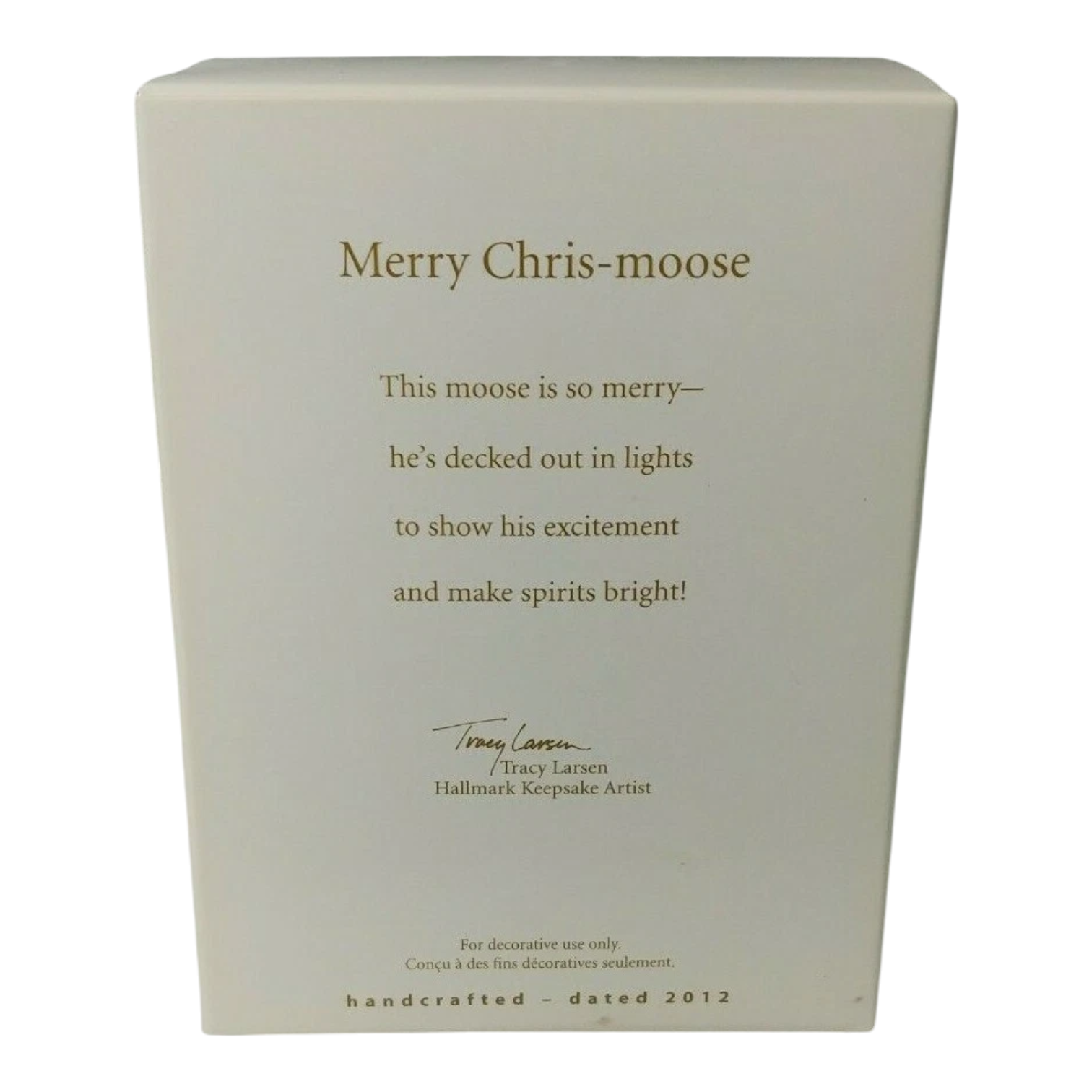 This festive 2012 edition of the Hallmark Keepsake Ornament features a cheerful moose dressed in holiday attire: donning a red Santa cap, green scarf, and strands of Christmas lights woven through its antlers. The design was co-created with fan input and released as a Gold Crown Exclusive, adding to its collectibility. The compact size and delightful animal motif make it a fun holiday décor piece, ideal for both general tree use and ornament collecting.