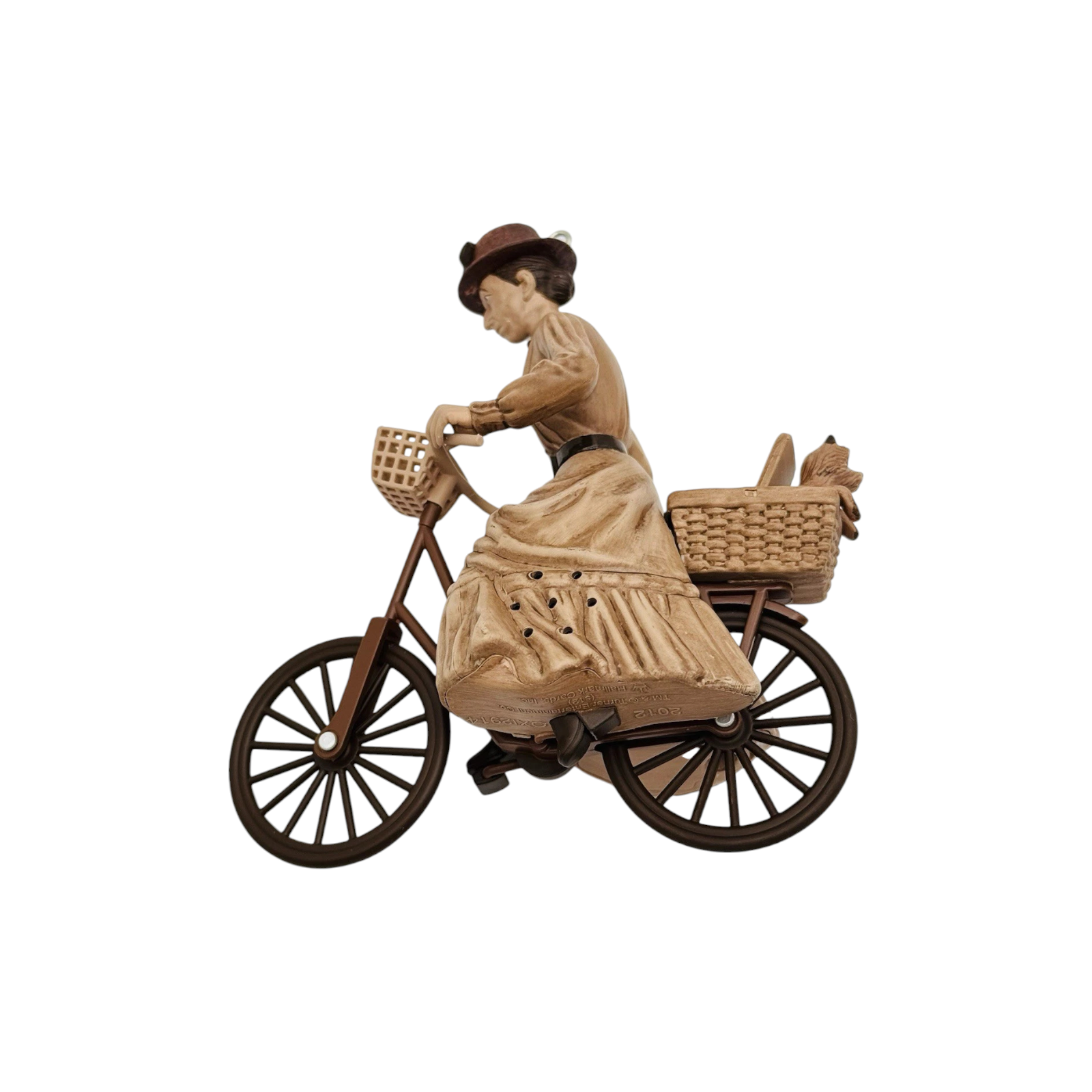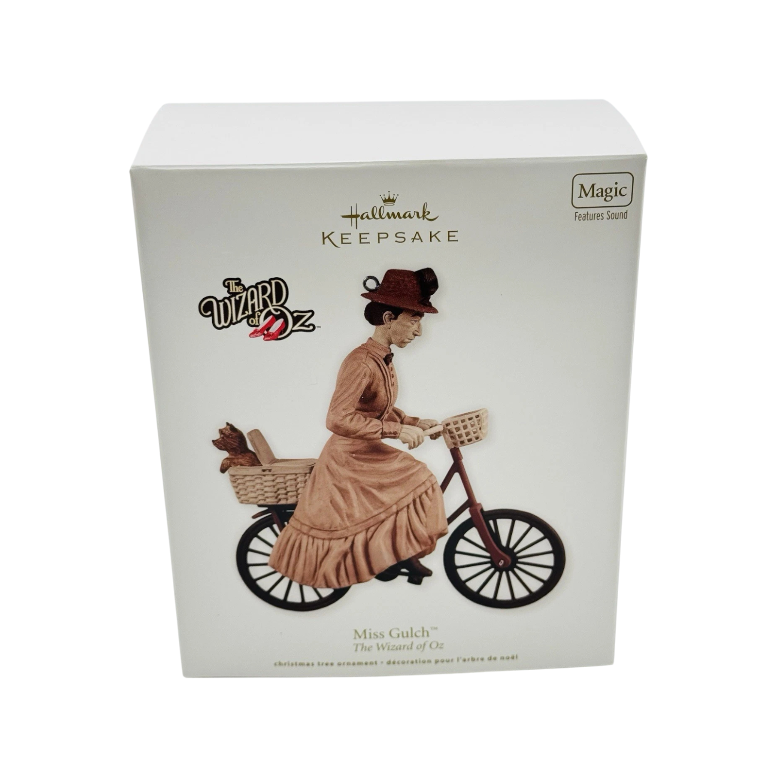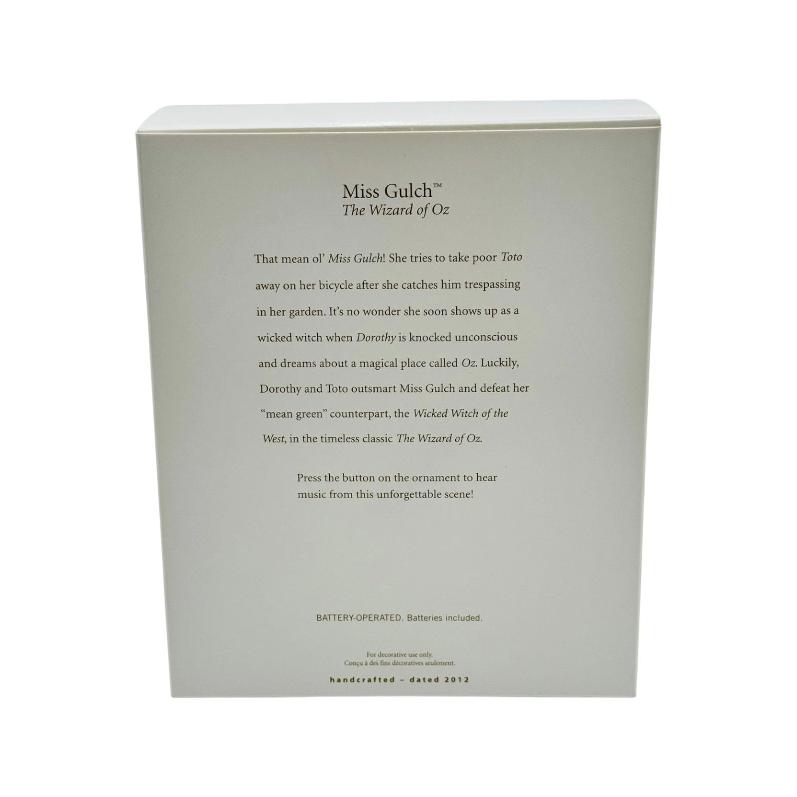 Revisit the looming menace of The Wizard of Oz with this 2012 “Miss Gulch” Magic Keepsake ornament. The scene shows Miss Gulch riding her bicycle with Toto in a basket, as she attempts to reel him in—Toto ready for his daring escape. Spin the bike’s wheels, then press the button on the left side of her dress (just below her hand on the handlebar) to activate the music from this classic scene.
