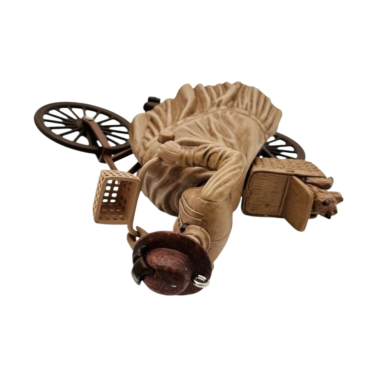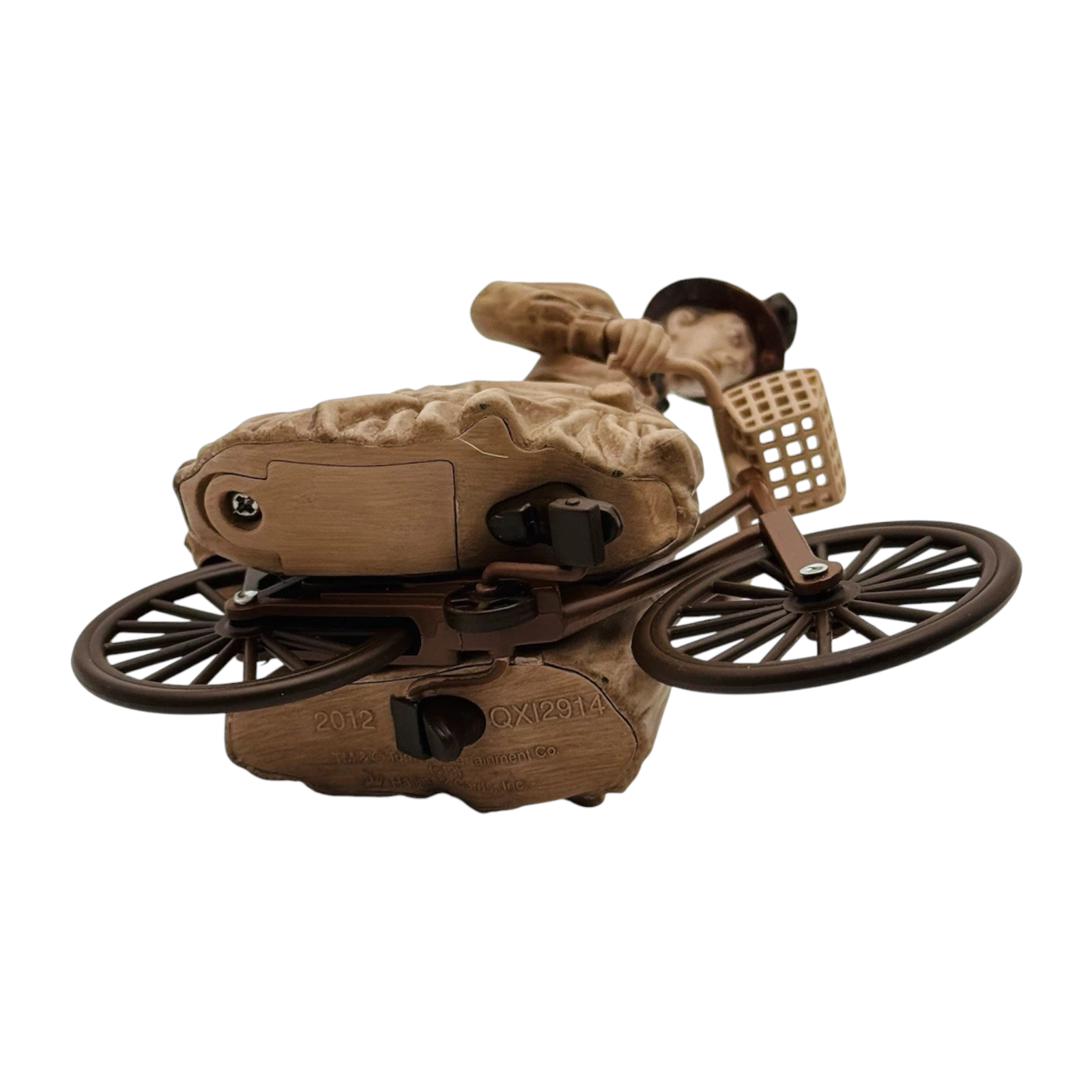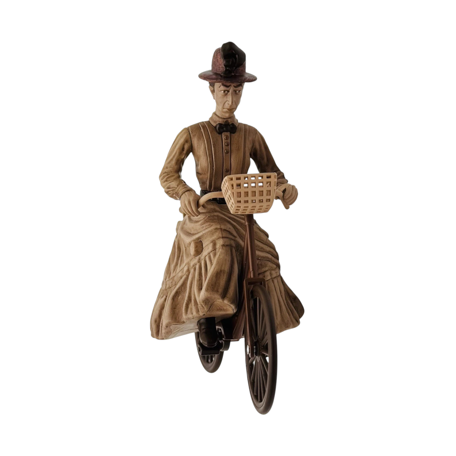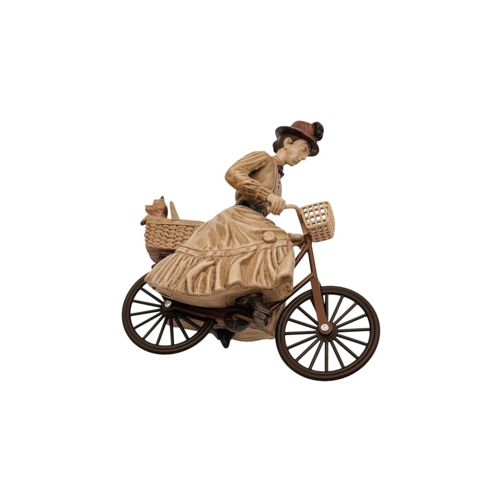 Revisit the looming menace of The Wizard of Oz with this 2012 “Miss Gulch” Magic Keepsake ornament. The scene shows Miss Gulch riding her bicycle with Toto in a basket, as she attempts to reel him in—Toto ready for his daring escape. Spin the bike’s wheels, then press the button on the left side of her dress (just below her hand on the handlebar) to activate the music from this classic scene.