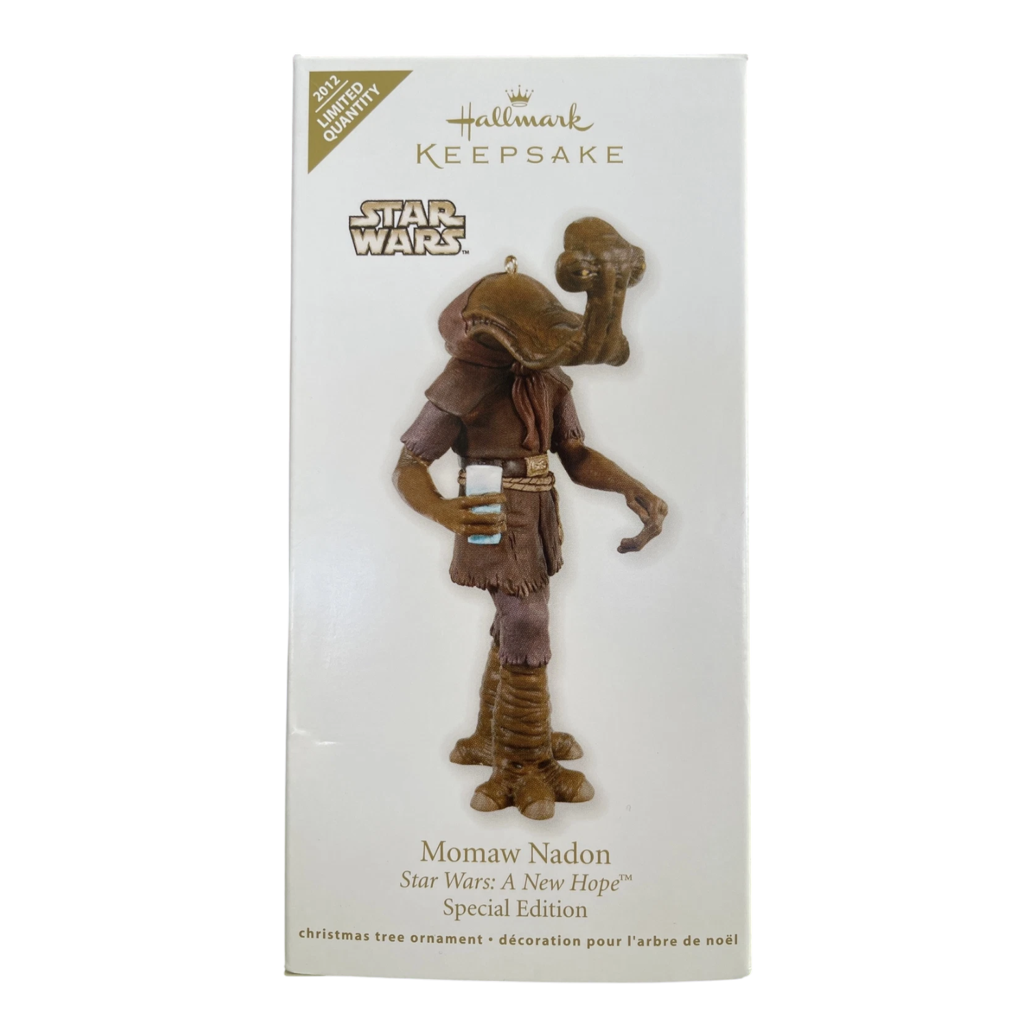 Bring a Tatooine exotic flavor to your collection with this 2012 Hallmark Keepsake Limited-Quantity ornament featuring Momaw Nadon—also known as “Hammerhead”—portrayed with his signature long neck holding a refreshing cup, just as seen in the Mos Eisley Cantina. Sculpted in durable plastic/resin blend, arrives mint-in-box with original tags, and requires no batteries or cords—just hang and let Hammerhead greet your guests.