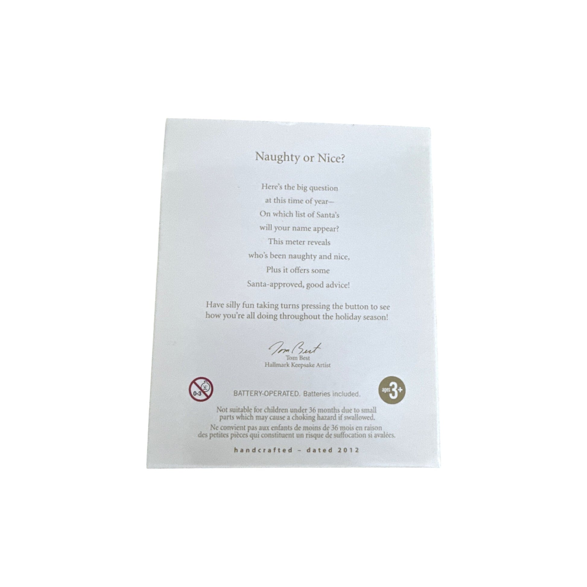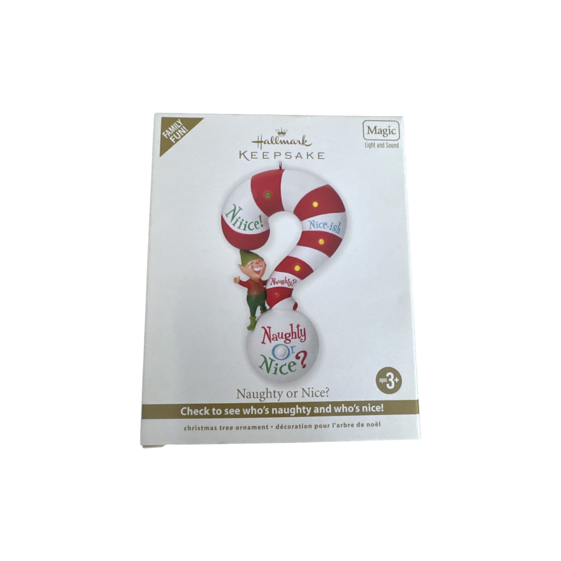Do you land on Santa’s naughty list or the nice column this year? This playful 2012 Magic ornament gives you—quite literally—a reading. Press the button and watch the candy-cane striped question-mark shape illuminate, all while hearing a cheery elf declare “Naughty,” “Nice-ish,” or “Nice!”. It’s a fun, interactive piece that adds whimsy to your tree. This edition was a Gold Crown Exclusive and includes the original box and hang tag. It comes with batteries included—no cords or external light strings are required.