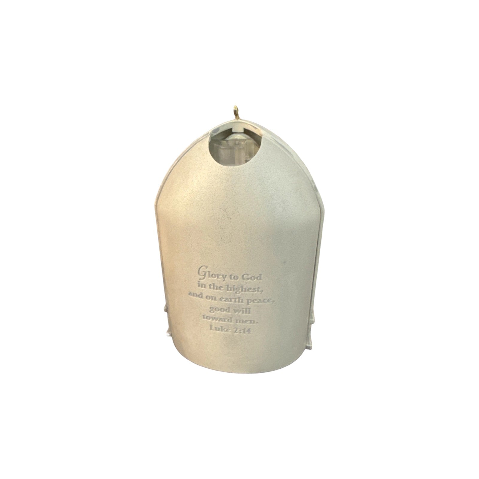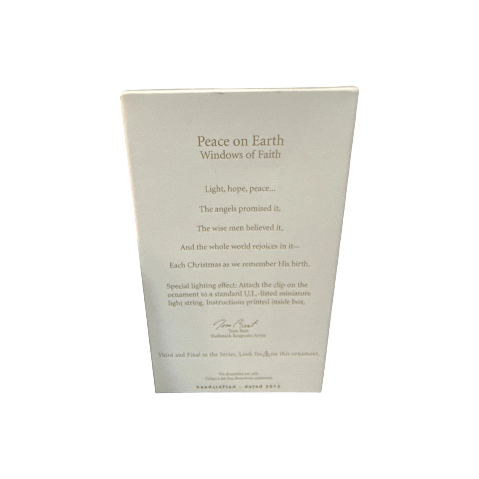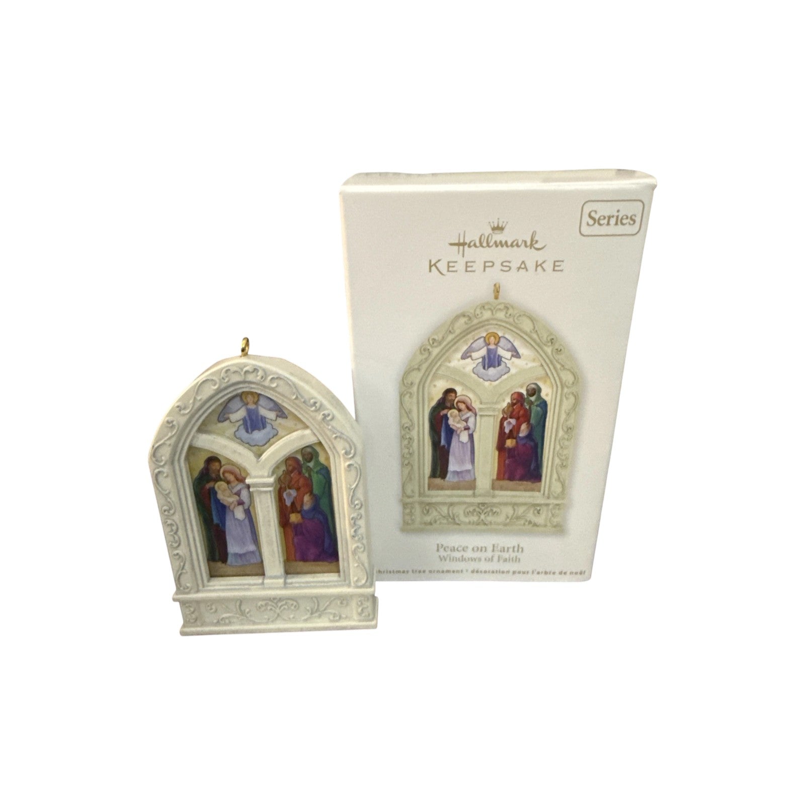 This is the third and final ornament in the Windows of Faith series: 2012 Peace on Earth. The design is a delicate stained-glass-style window that features an angel, Mary, Joseph, and the Wise Men in reverent scenes framed by ornate white tracery. When clipped over a miniature light bulb, the translucent panels glow with a faux stained-glass effect. The package typically includes the ornament, its clip to attach to a miniature light string, and the original box with insert.