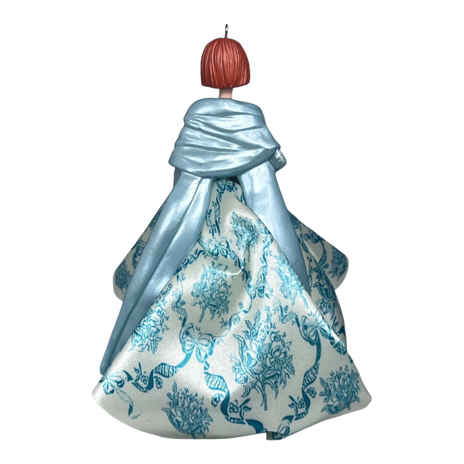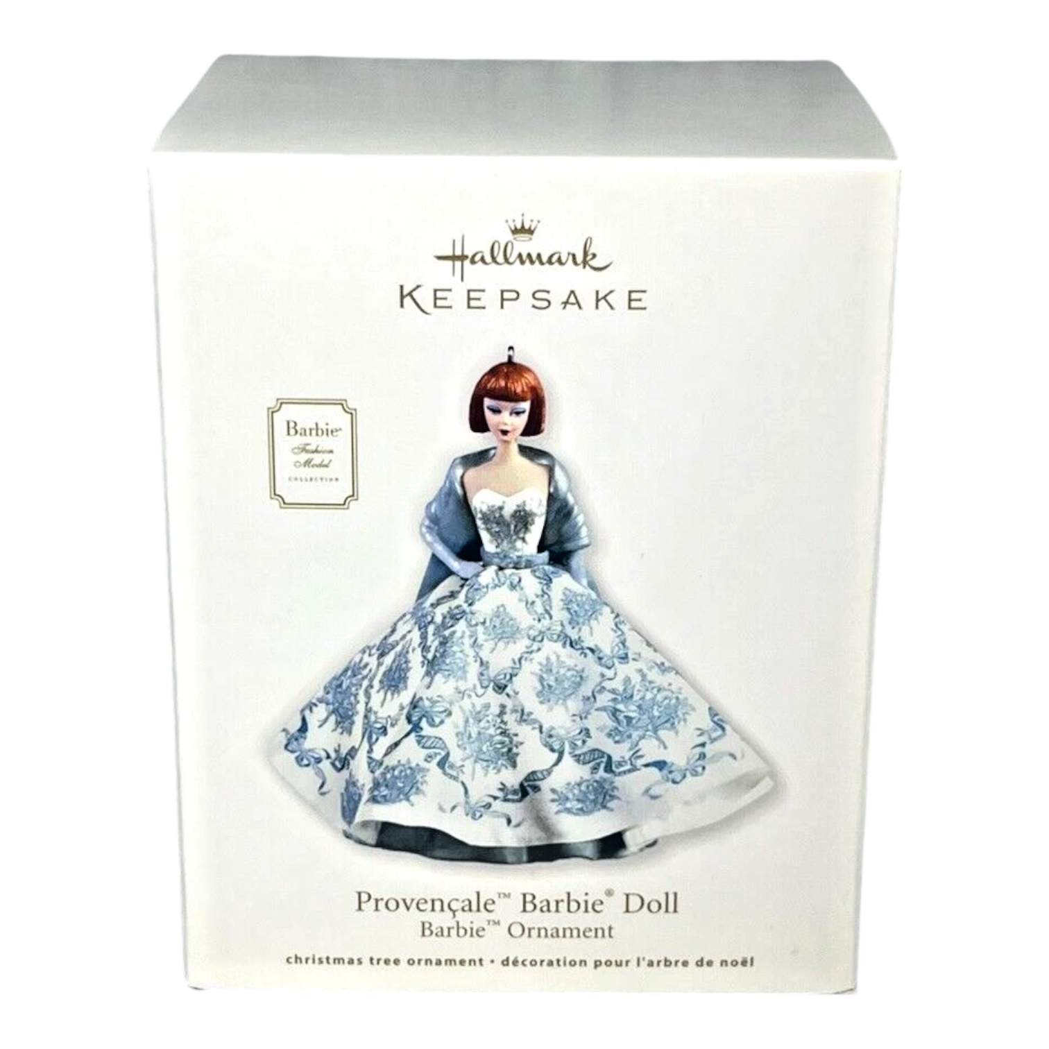 Elevate holiday elegance with the 2012 Provencale (Barbie) ornament from the Fashion Model Collection. Barbie radiates vintage charm in a white floral-patterned gown adorned with subtle blue accents and exquisite fabric detailing. Her look is completed with a coordinating satin stole and long gloves, offering couture-level elegance in miniature form. Handcrafted from mixed materials including fabric, this ornament arrives in its original Keepsake box with the official Hallmark tag, and requires no power—purely decorative and delightfully refined.