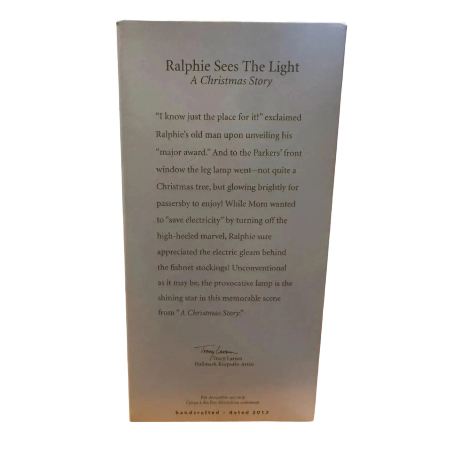 Spotlight Ralphie’s awestruck moment from A Christmas Story as he gazes at his dad’s glowing “major award” leg lamp through the crate window. This 2012 magic ornament features an LED light and sound module that plays iconic film clips when activated. Arriving mint‑in‑box with memory tag and hanging loop, it includes three LR44 batteries—ready to display straight out of the box.