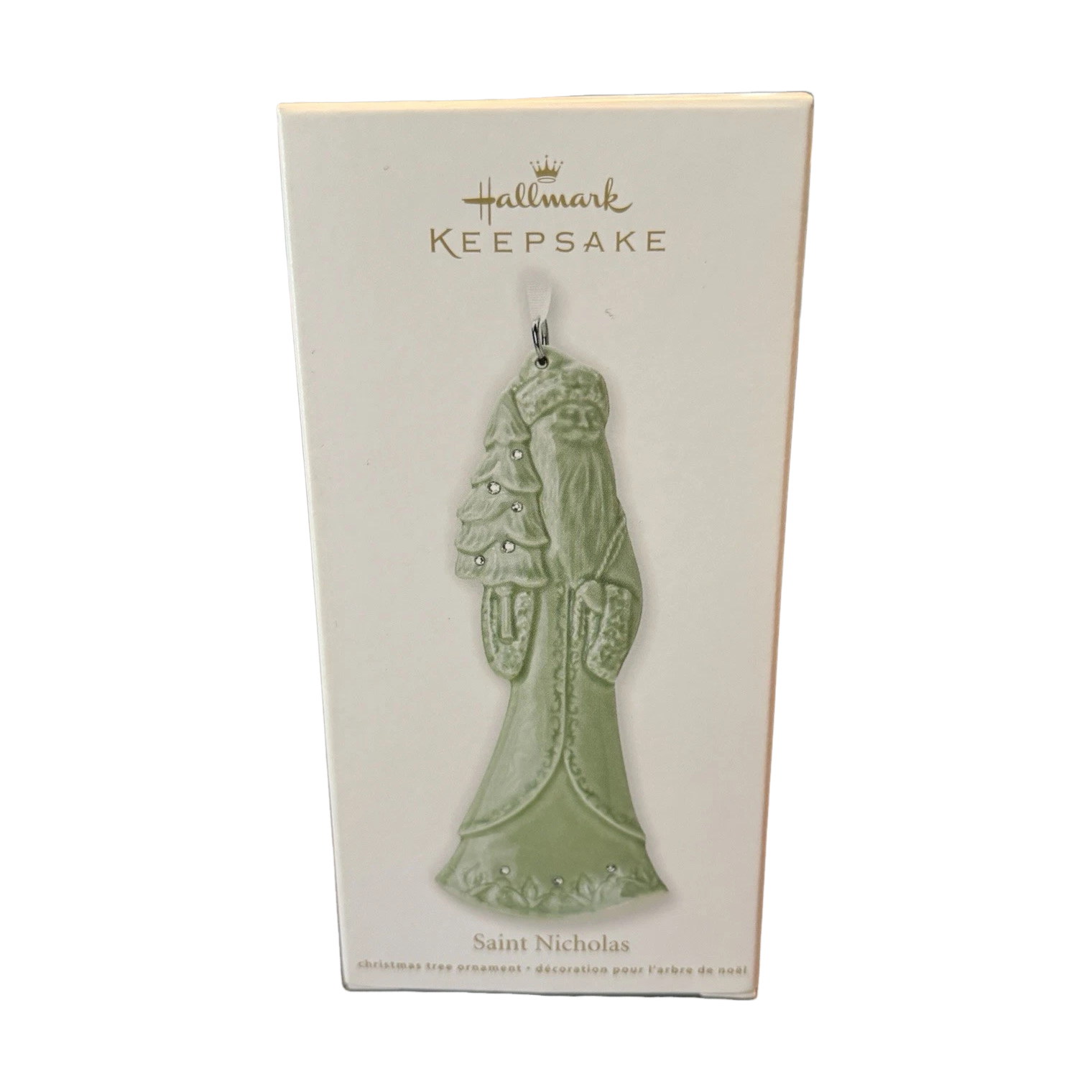 This ornament represents the traditional figure of Saint Nicholas (Santa Claus), rendered in a classic ceramic style. The design evokes a nostalgic, old-world holiday charm — a serene and elegant depiction meant to bring a timeless Christmas spirit to your tree. The ornament is part of the “Keepsake Ornament” line. When complete, the package includes the ceramic Saint Nicholas ornament and the original box. No batteries, cords, or lights are needed — it’s a simple hanging keepsake.