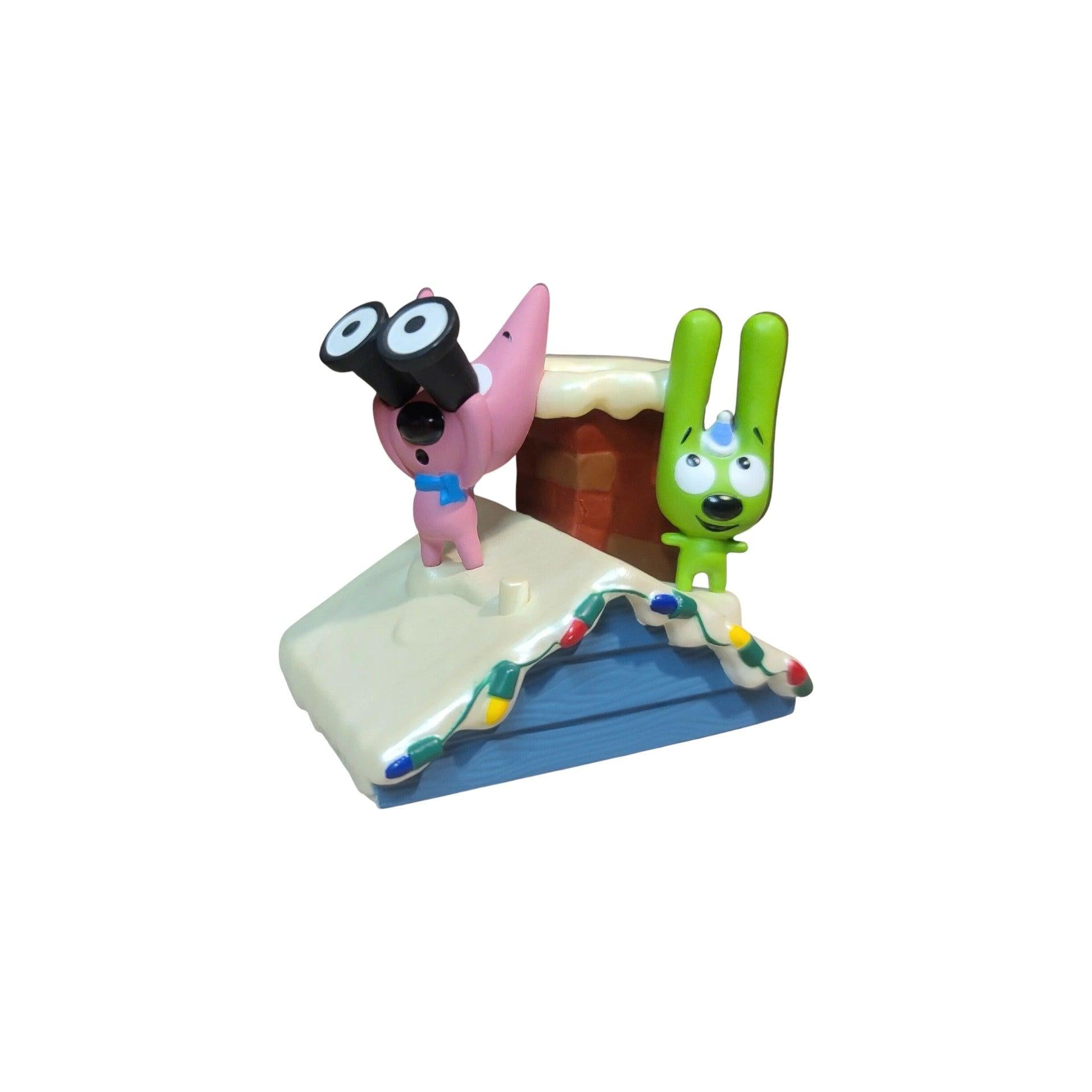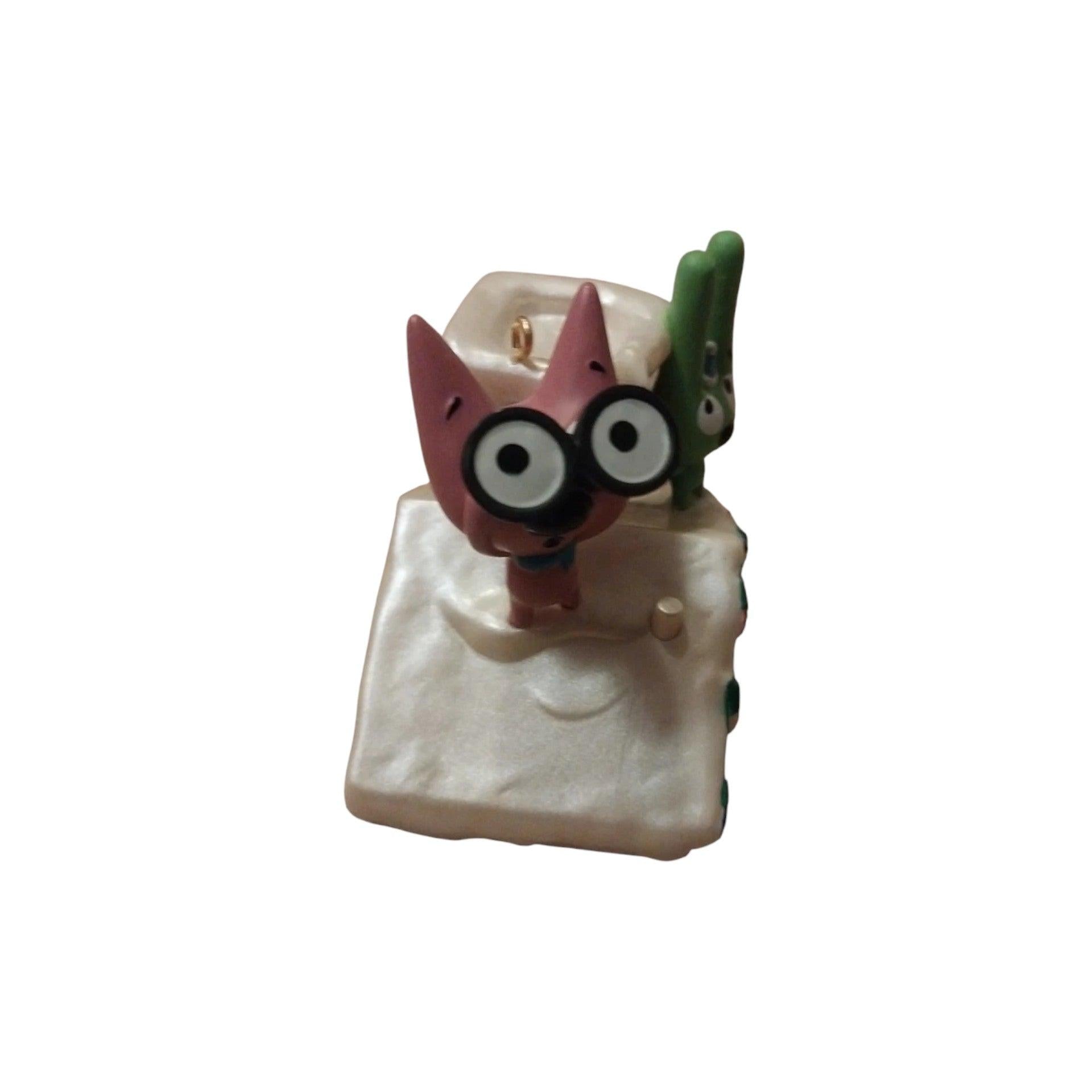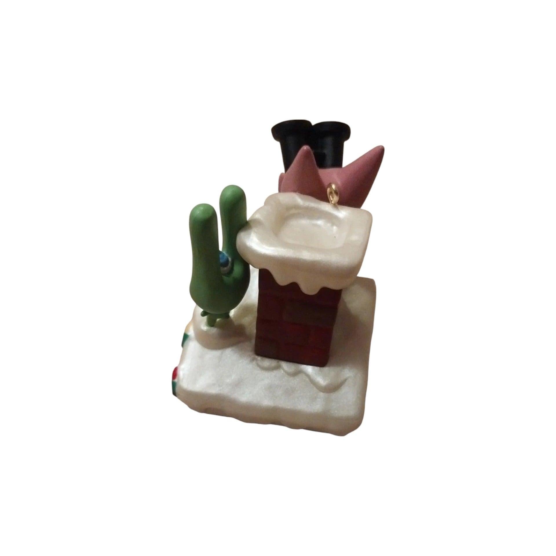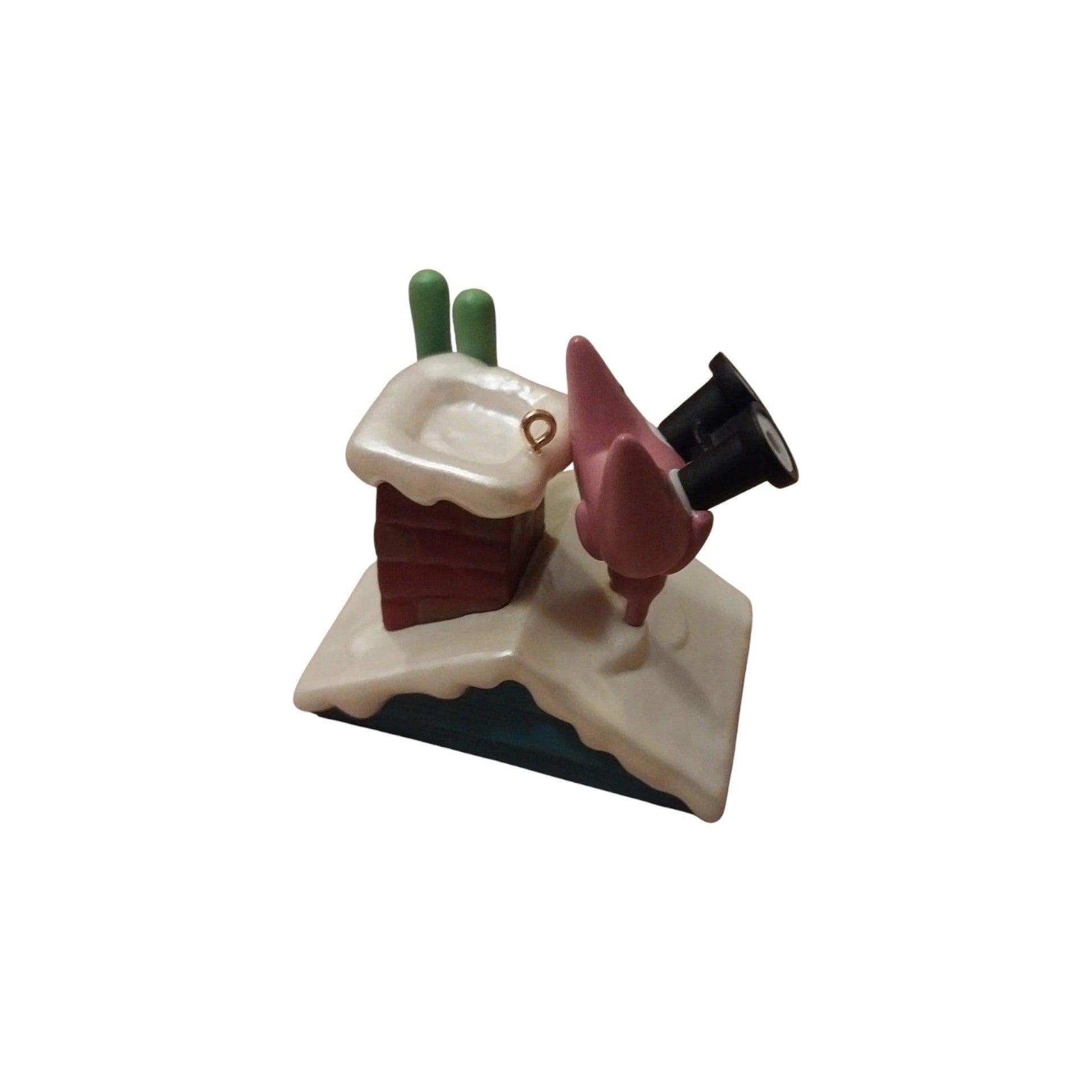 This playful “Magic” ornament from Hallmark features animated characters Hoops & Yoyo standing on a snowy rooftop with binoculars, excitedly waiting for the arrival of Santa Claus. Press the activation button and you’ll hear one of several silly phrases from the duo as they try to spot the jolly man in red. Cast in colorful resin and plastic, with fine detailing of the rooftop and snow scene, this interactive piece brings humor and holiday spirit to your tree or collection.