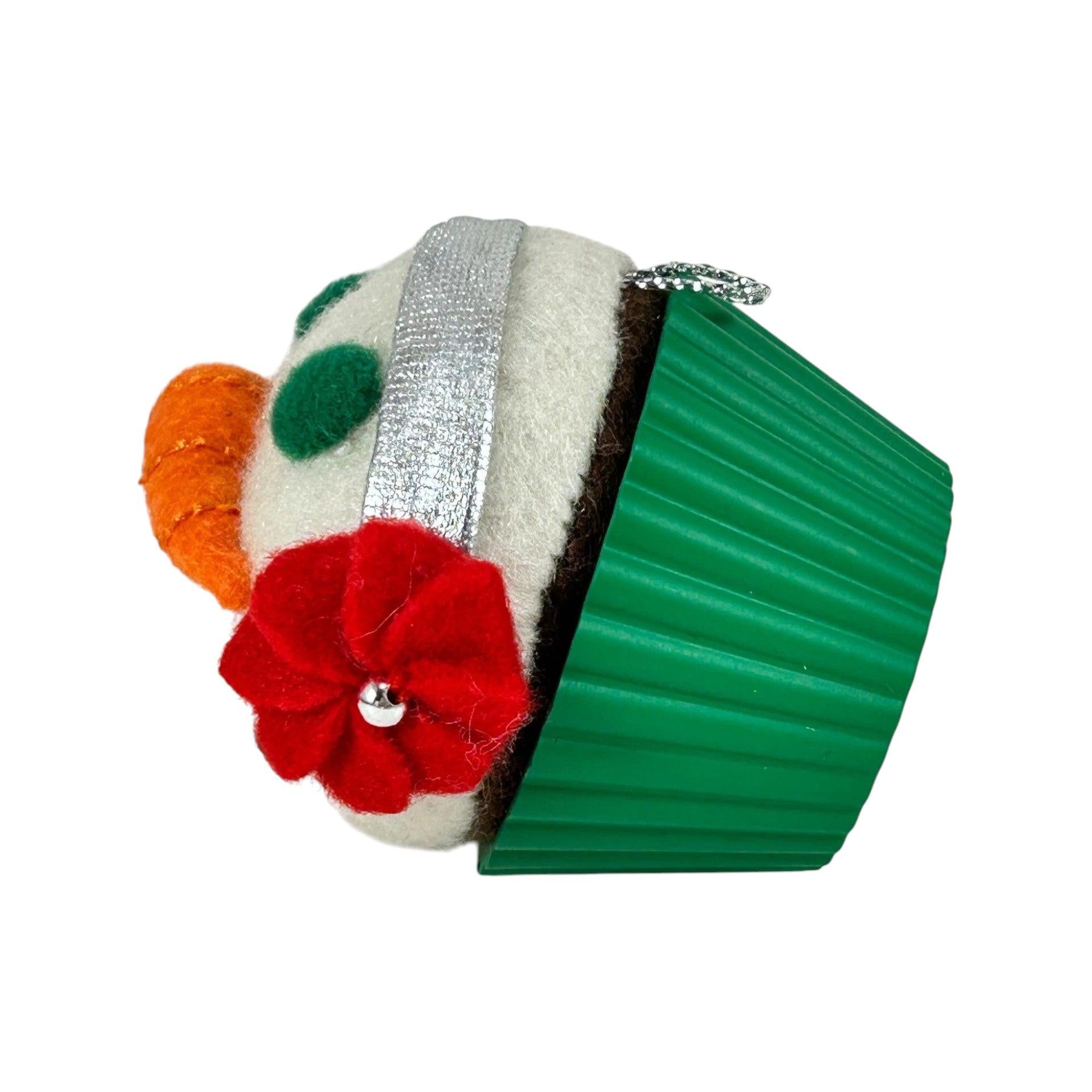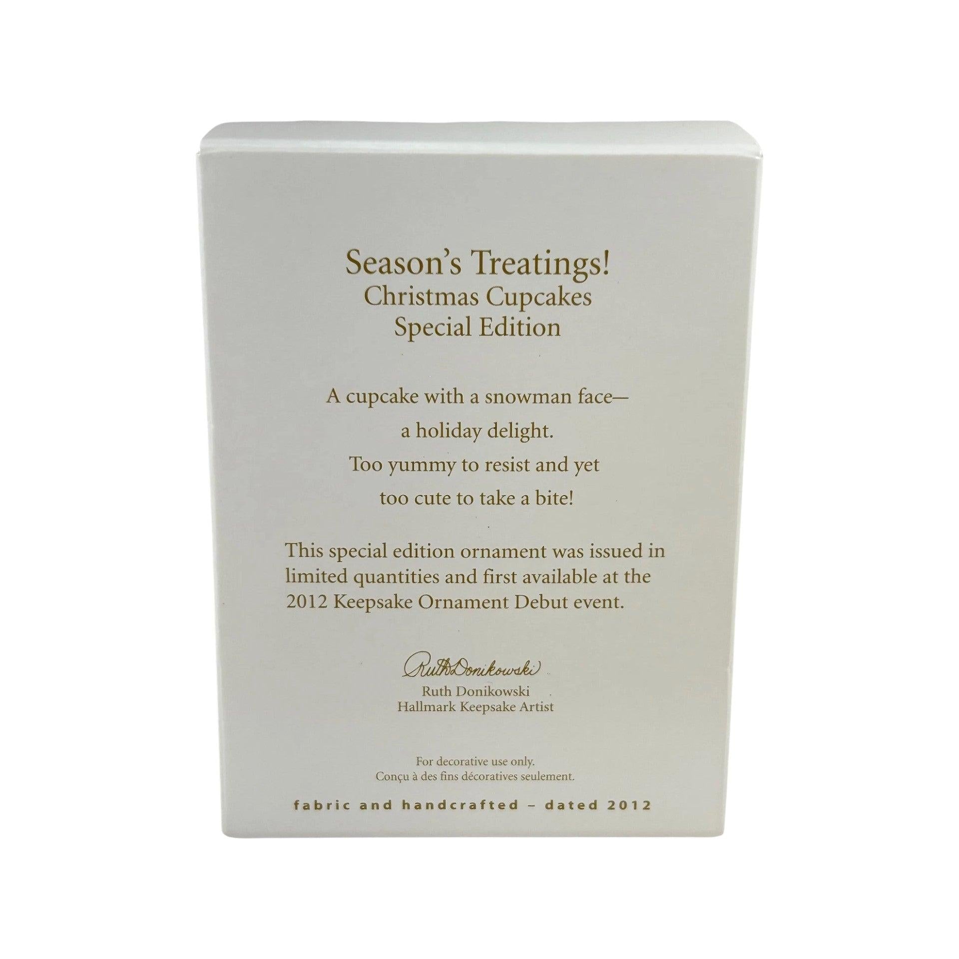 This festive 2012 Season’s Treatings (Christmas Cupcakes) ornament features a whimsical cupcake styled as a snowman—complete with white frosting, a carrot-nose, chocolate-dot mouth, green felt eyes, and red earmuffs. Part of a limited‑quantity debut in October 2012, the piece was hand‑crafted using mixed materials including fabric, felt, and plastic. Designed by artist Ruth Donikowski, it comes with its original box and tag. With a size of roughly 2½″ W × 2¼″ H, this collectible requires No Power Needed—perfect for immediate tree-hanging or display.