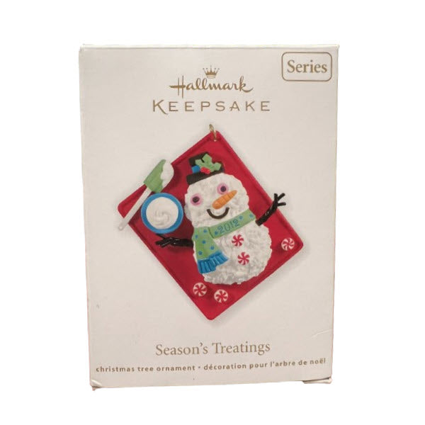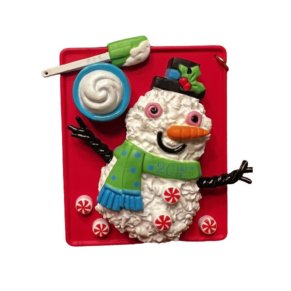 This delightful ornament showcases a snowman cake resting on a festive cookie sheet. The cheerful snowman sports a green scarf stamped “2012”, candy‑button accents, and a spatula in hand layered with frosting. As the fourth release in the Season’s Treatings series (a Gold Crown exclusive), it arrives in its original collector’s box (dated “2012”) and typically includes the hang tag. There’s no power needed—just hang and enjoy its whimsical baking charm.