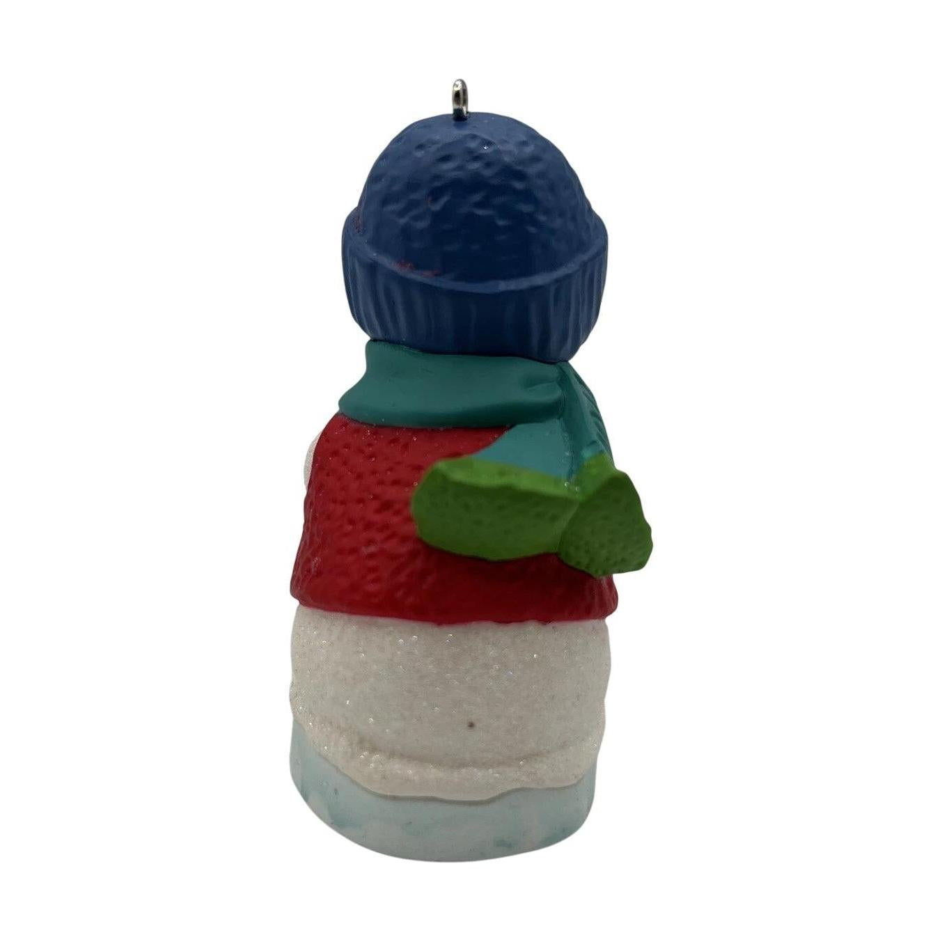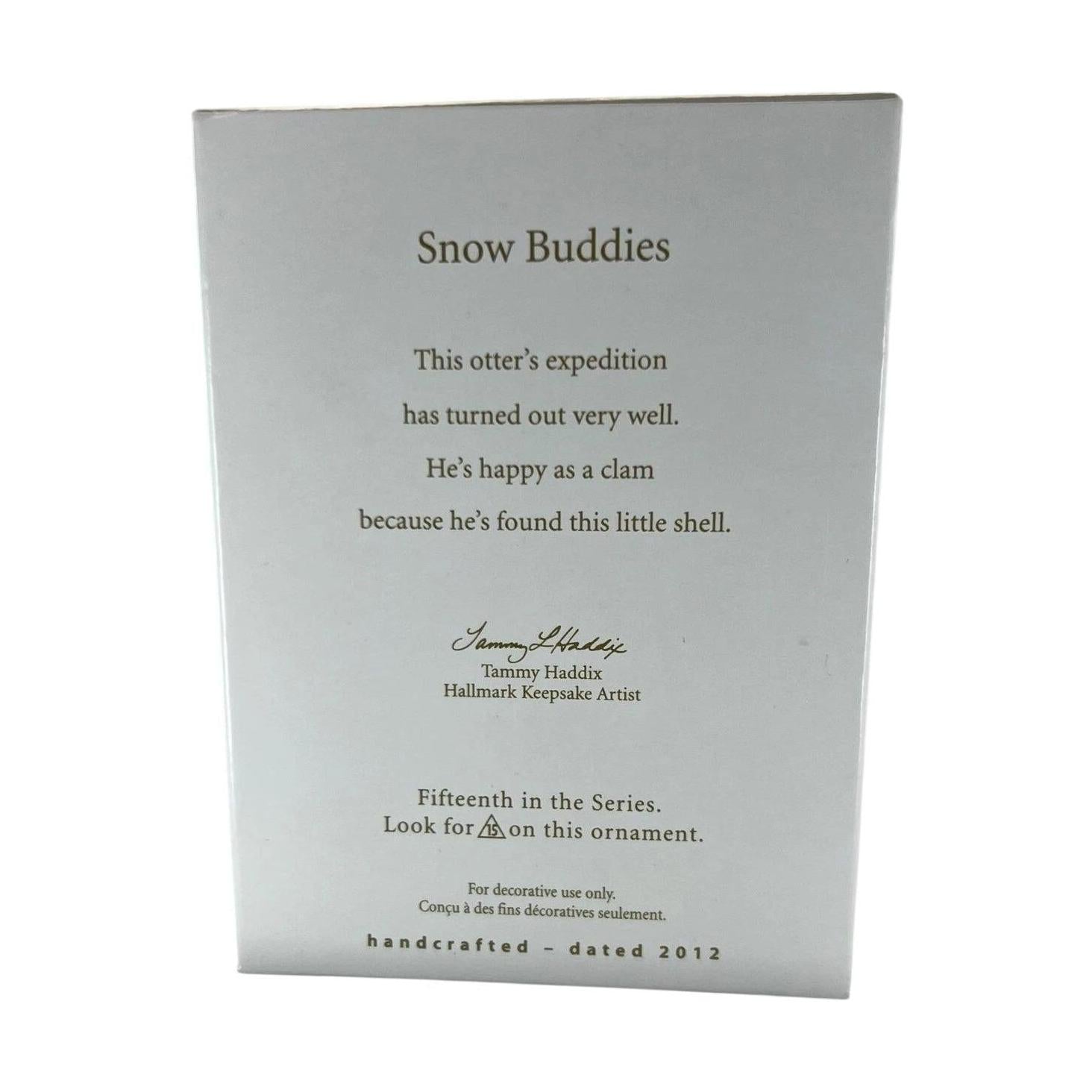 This 2012 ornament, the 15th in the Snow Buddies series, features a friendly snowman wearing a red vest and blue stocking cap and scarf (with "2012" inscribed), leaning down to greet his playful otter friend who pops up through the ice with a seashell. Designed by Tammy Haddix and made of resin with glitter highlights, this keepsake arrives with its original Hallmark box, tag, and memory card. It requires No Power Needed—no lights, sound, or motion, just holiday-ready charm.