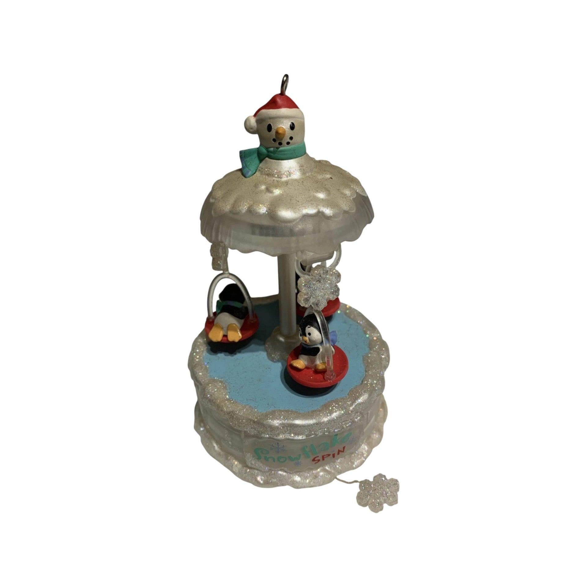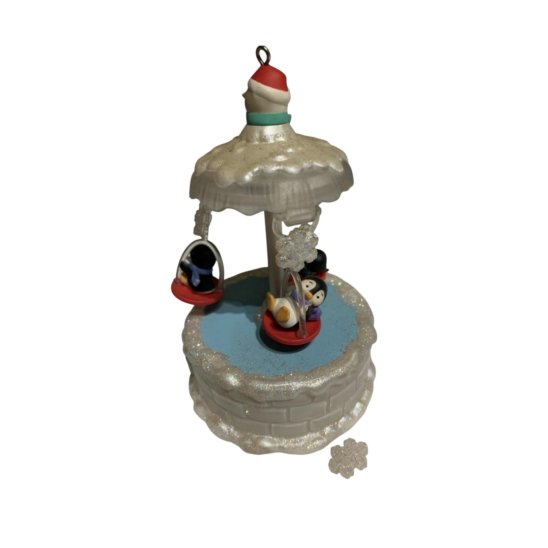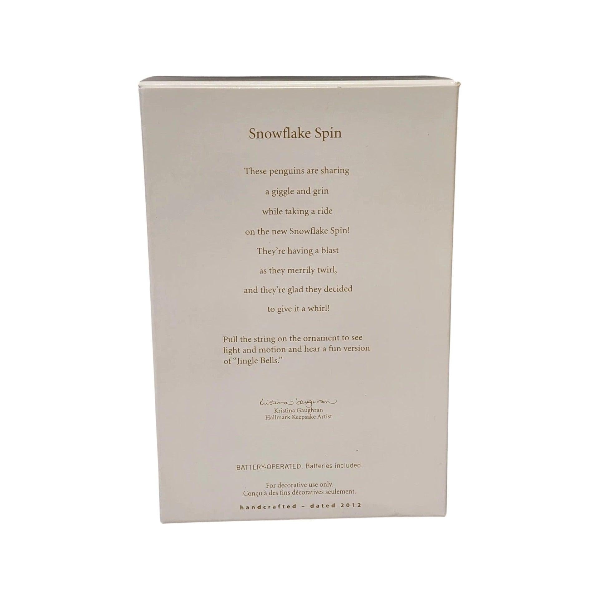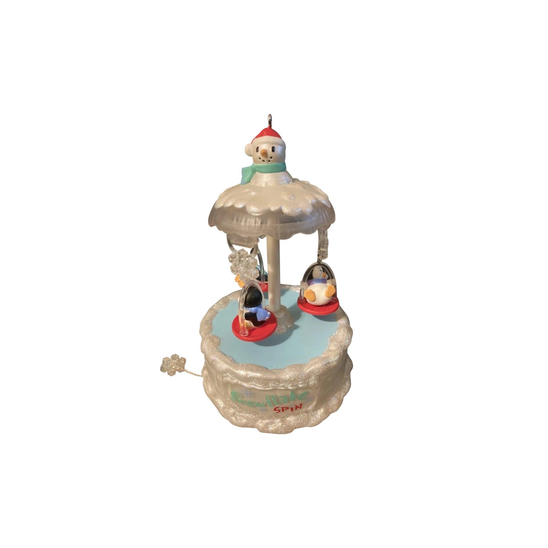 Delight in the whimsy of winter with 2012 Snowflake Spin, a magical “Reveal” ornament from Hallmark’s beloved Kris’ Penguins collection. Designed by Kristina Gaughran, this animated masterpiece brings merriment to life—simply pull the string to see three penguins twirl on a snowflake carousel as the base illuminates, and a festive rendition of “Jingle Bells” fills the air. Powered by three LR44 batteries (included), it arrives Mint-in-Box, ready to enchant any holiday décor.