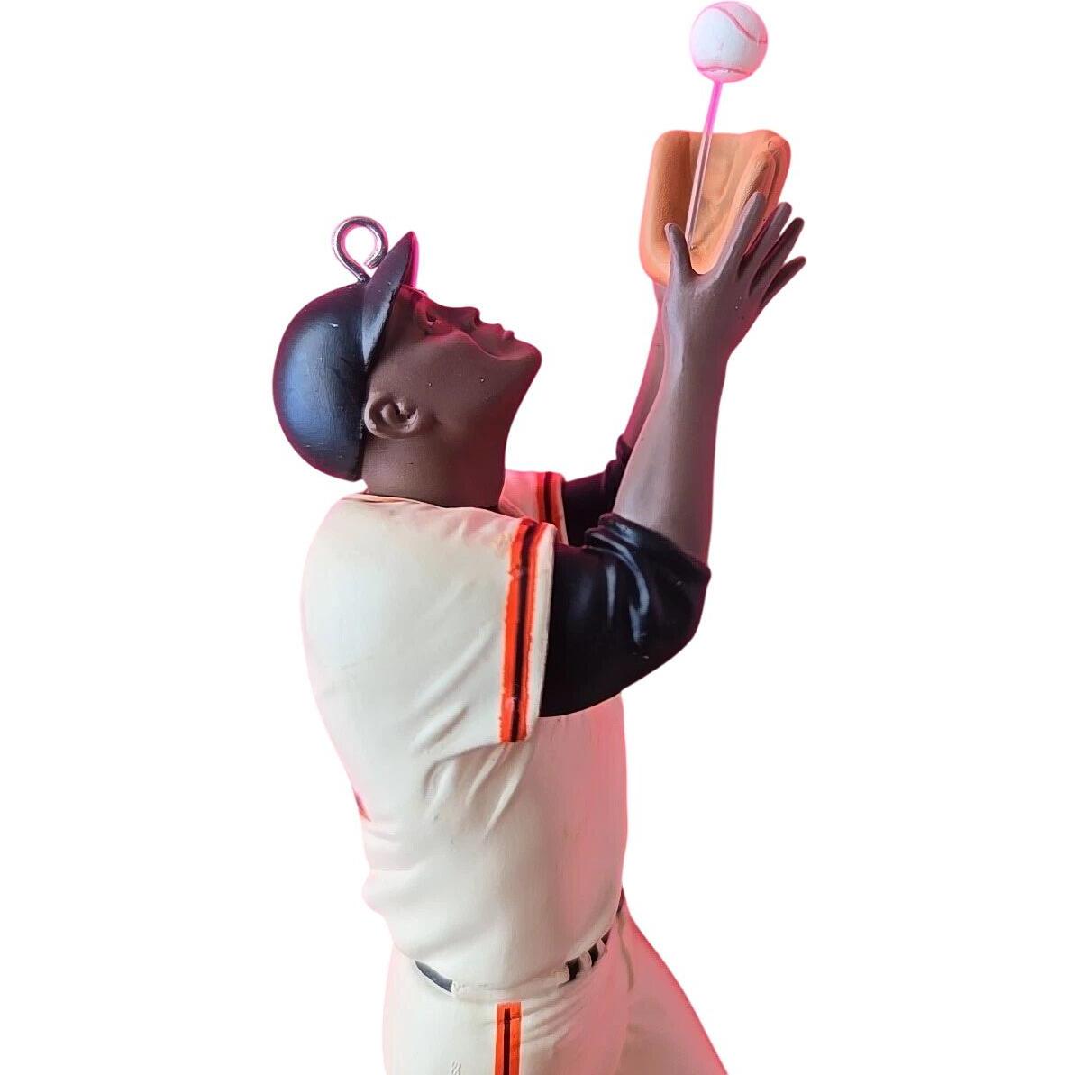 Celebrate a legendary moment in baseball history with 2012 The Catch — Willie Mays (At the Ballpark), a Hallmark Keepsake ornament that captures his iconic over-the-shoulder grab during the 1954 World Series. The ornament shows Mays in mid-leap, poised at full stretch, with finely detailed sculpting to evoke motion and athletic grace. Released as a Gold Crown exclusive, this keepsake comes with its original packaging when available, complete with memory card insert and hanger loop.