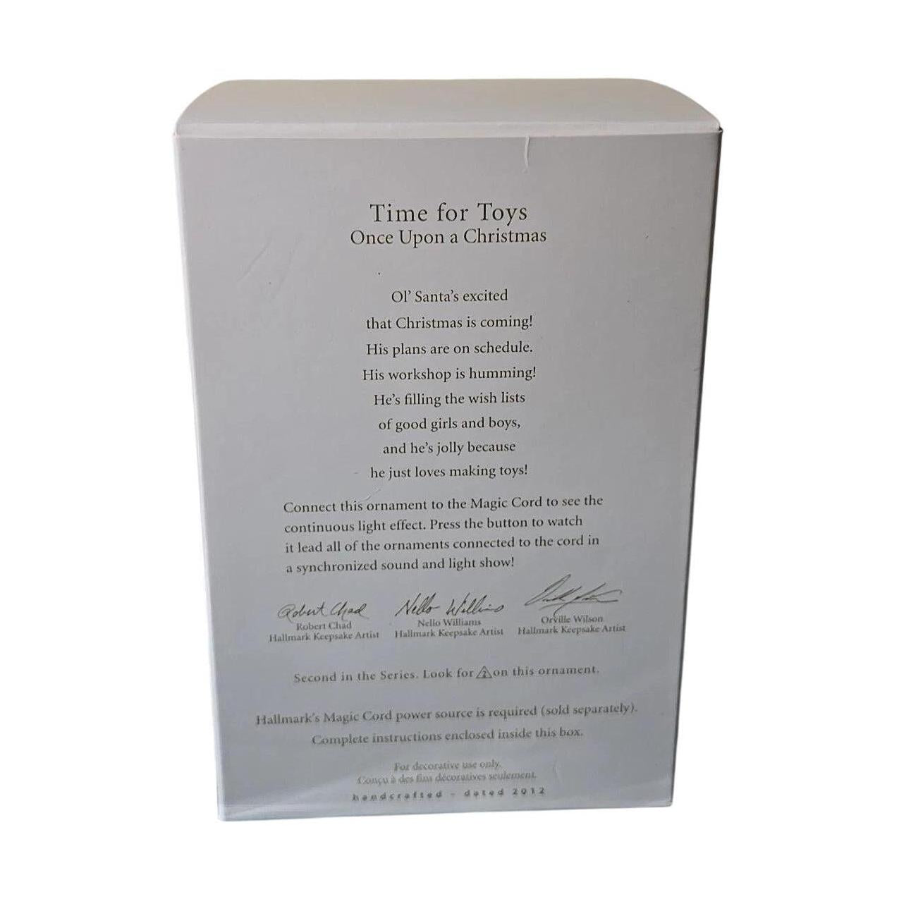 Crafted with festive charm, the 2012 Time for Toys ornament brings Santa into his workshop surrounded by classic toys—a train set, duck, robot, and more. This captivating scene includes warm integrated lighting within the toys and sound storytelling, creating a cozy holiday vignette.