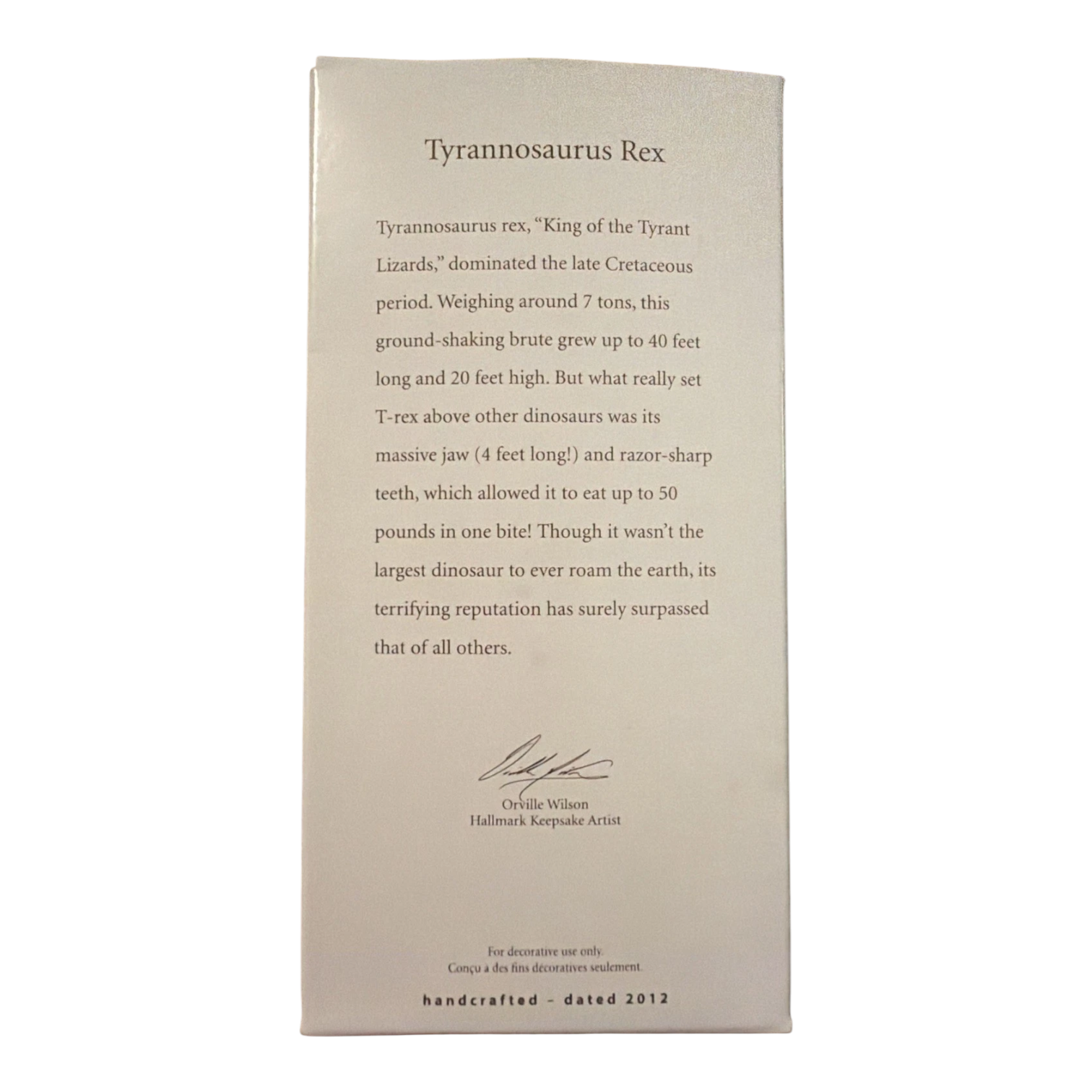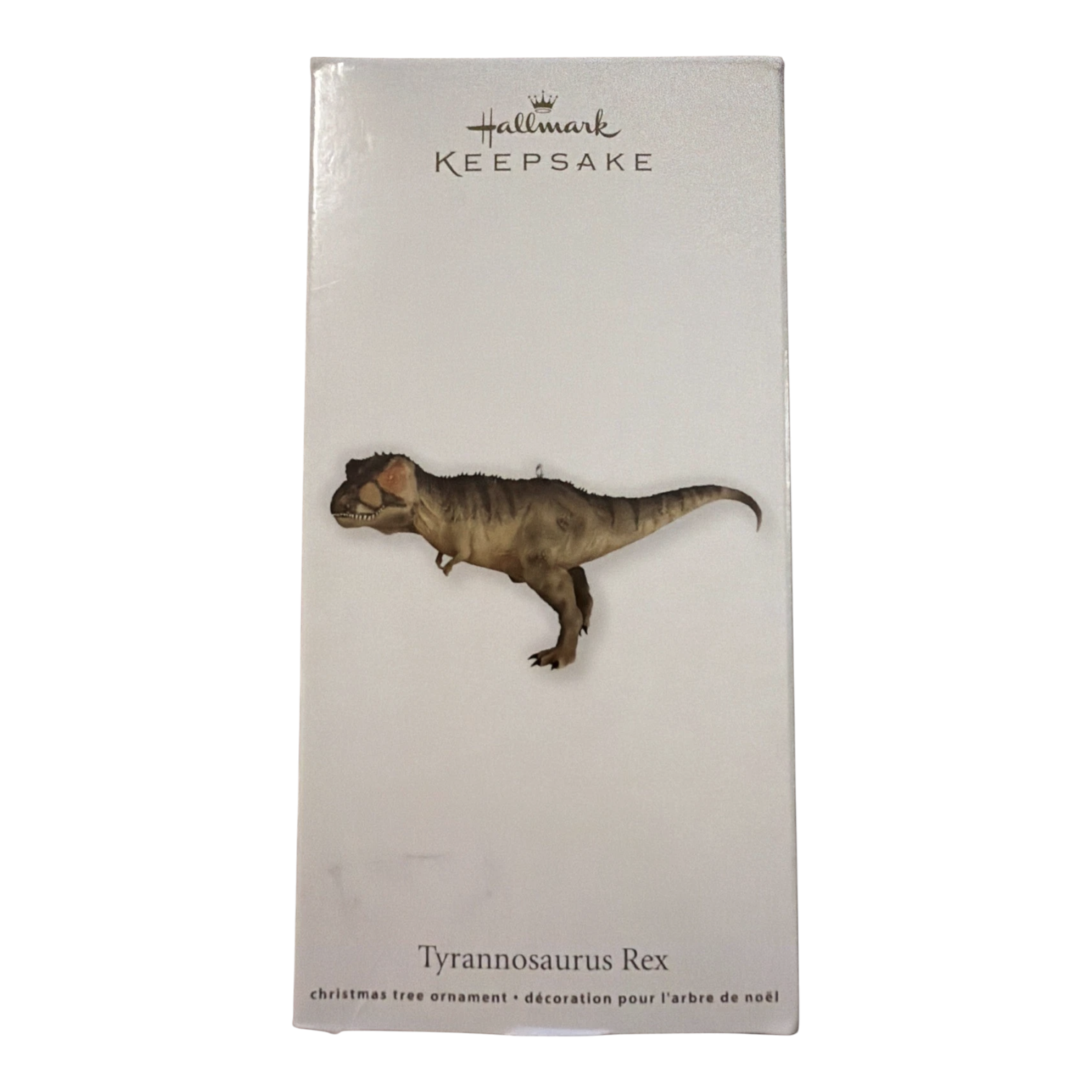 This 2012 Keepsake ornament features a sculpted representation of the mighty Tyrannosaurus Rex, capturing the iconic “king of the tyrant lizards” in holiday décor form. The design by artist Orville Wilson presents the dinosaur in a mid-stride pose with painted details that highlight texture and form. It is ideal both for dinosaur enthusiasts and ornament collectors who enjoy bold, non-traditional holiday themes. As part of Hallmark’s 2012 year line, it stands out for its size and novelty—making it a fun focal piece on a tree or a distinctive collectible addition to a themed display.