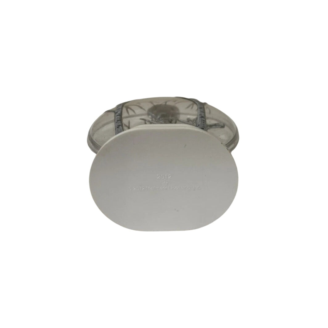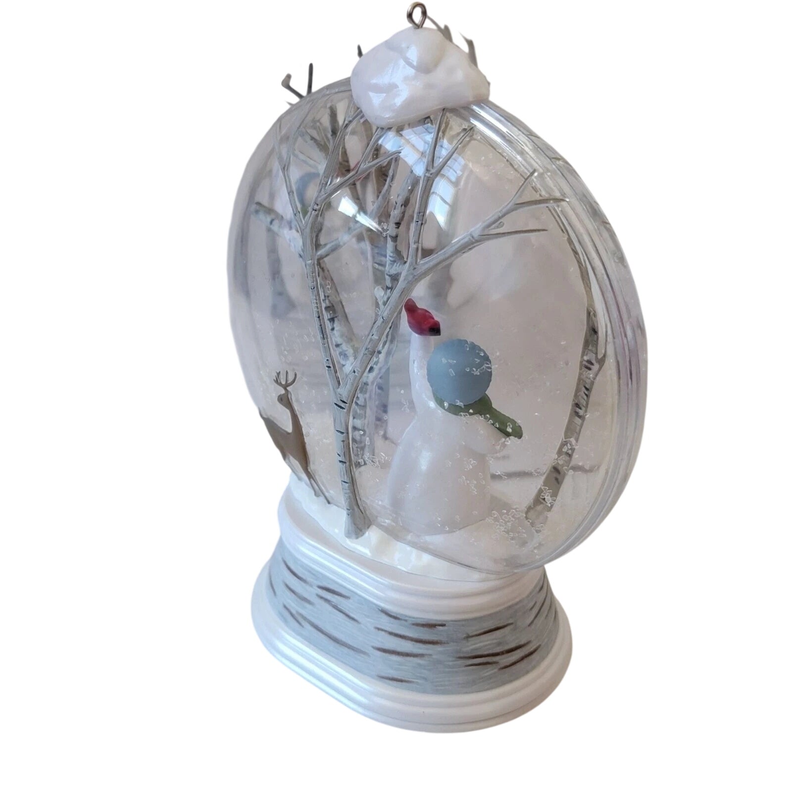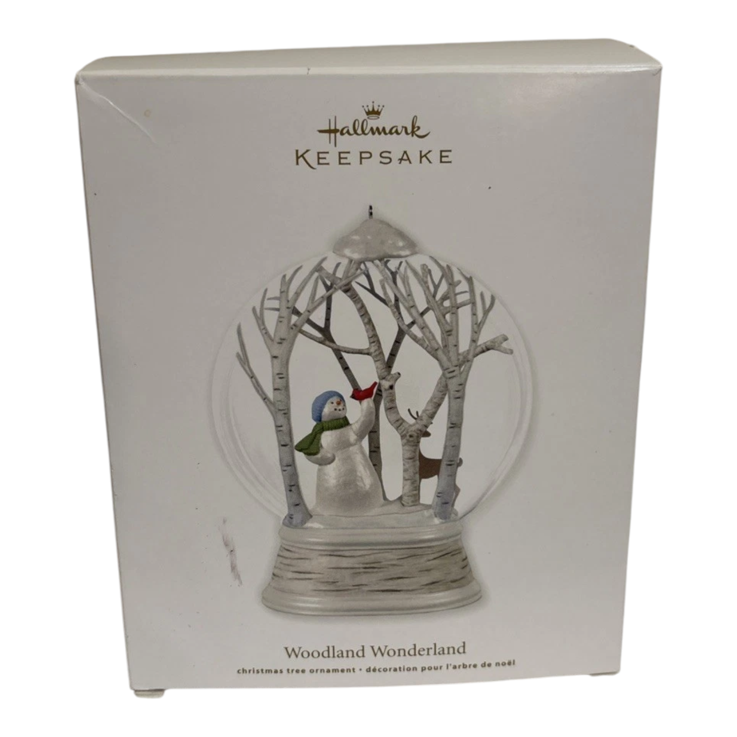 This 2012 Keepsake ornament features a charming winter woodland scene: a snowman wearing a green scarf and blue stocking hat, holding a cardinal, with a deer at his side, all set among birch trees dusted with snow. With its tranquil forest motif and attention to seasonal detail, it appeals to collectors of snowmen, woodland themes, and Gold Crown exclusives alike.