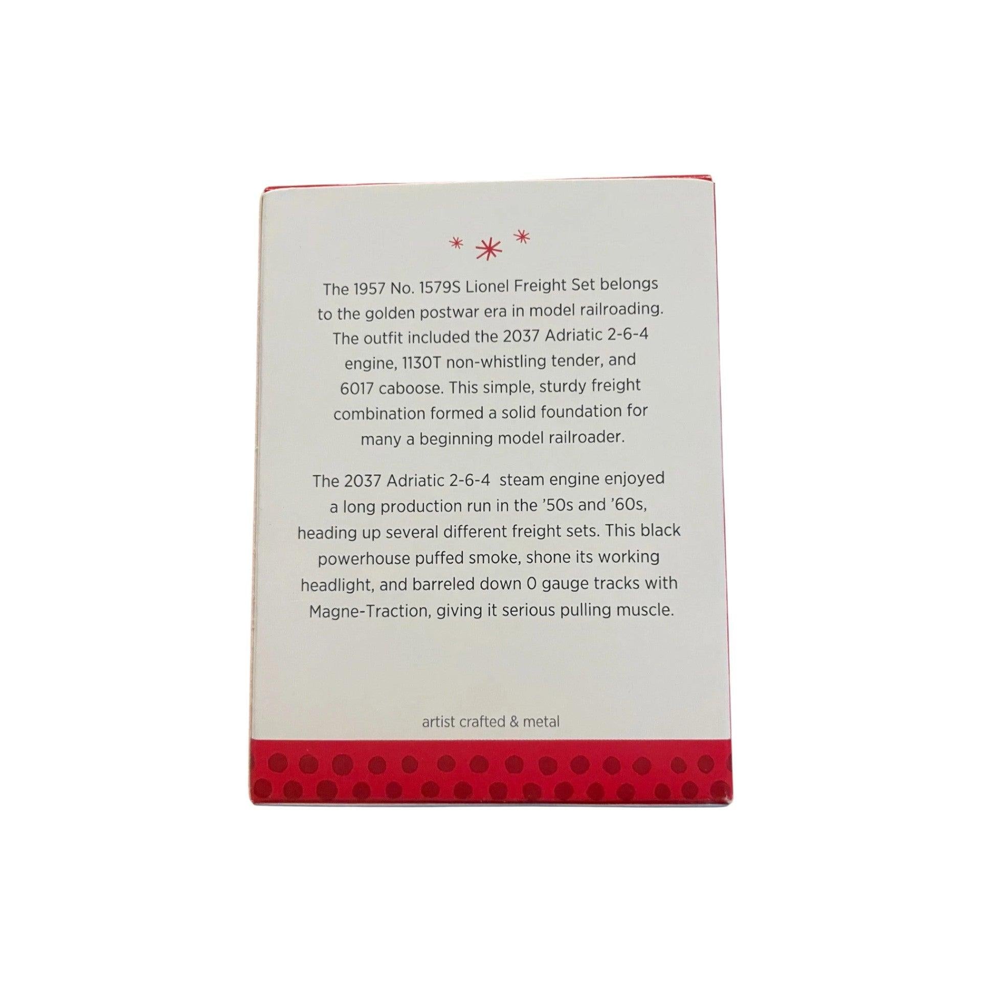 Celebrate the nostalgia of Lionel’s postwar era with this repainted edition of the 2037 steam locomotive. Originally introduced in the early 1950s, the 2037 was known as a dependable and well-loved locomotive in countless train sets across America. Hallmark’s 2013 Keepsake edition honors that tradition with a fresh repaint, crafted in die-cast metal with finely detailed styling and functional turning wheels.