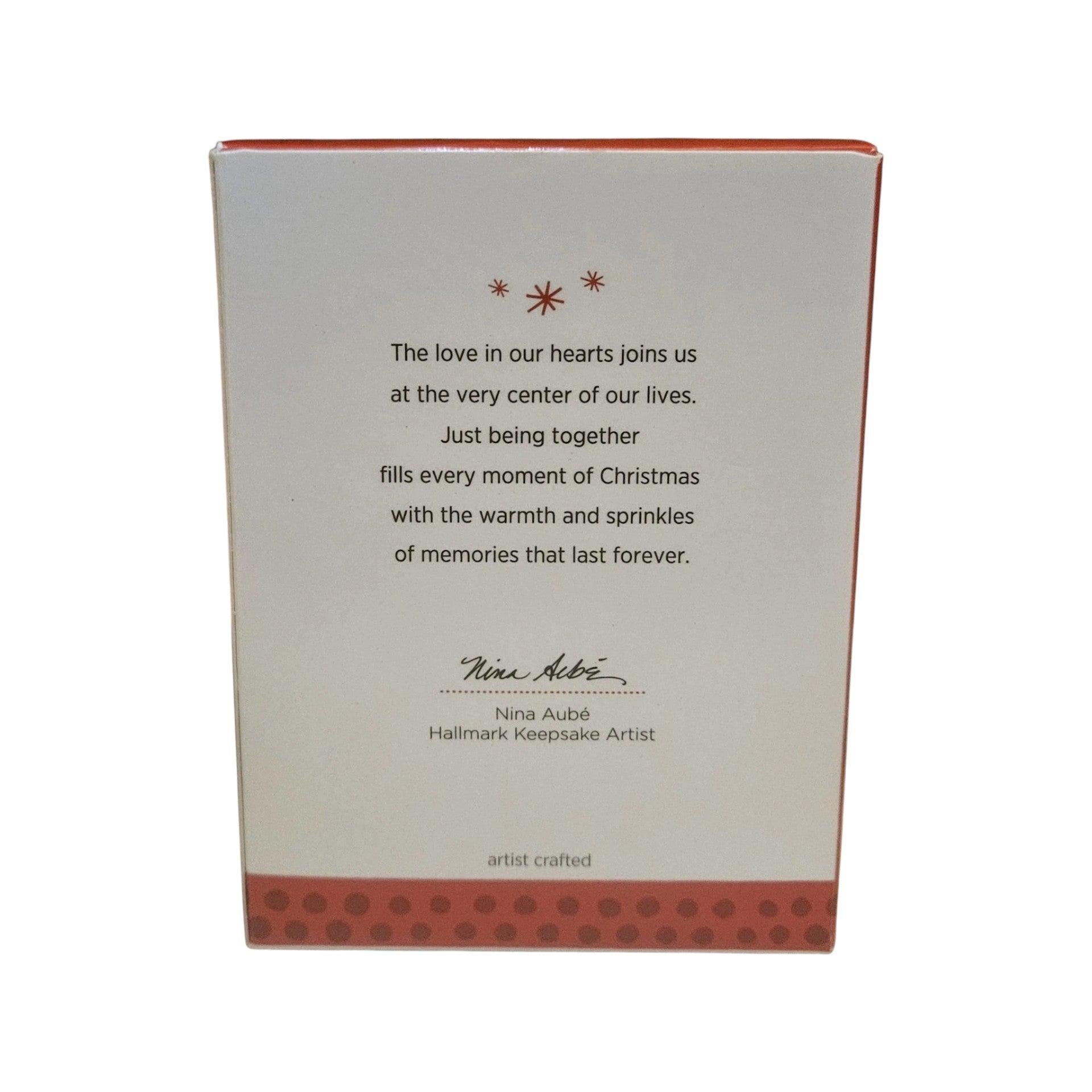 This collectible ornament features two festive, smiling holiday-cupcakes adorned with peppermint-swirl frosting, sprinkles, and a “Luv Ya Sweetie” conversation-heart accent, capturing a light-hearted “sweet couple” holiday theme. Designed by Nina Aubé and released in 2013, the sculpt is sized to hang on a Christmas tree and appeals both to collectors of fun seasonal motifs and gift-givers celebrating couples or anniversaries. The charming dessert imagery and cheerful detailing make this ornament an engaging addition for both décor and collector display.