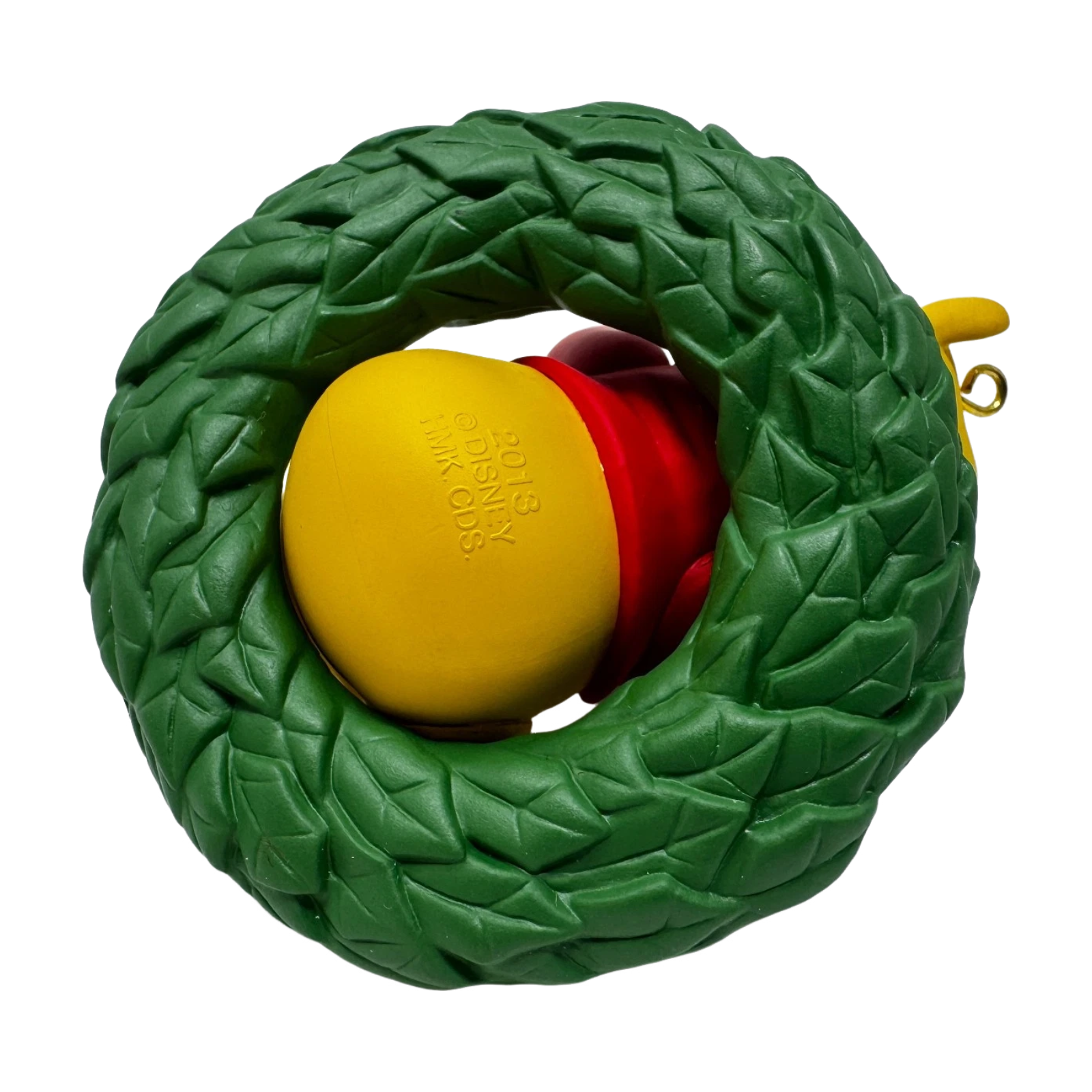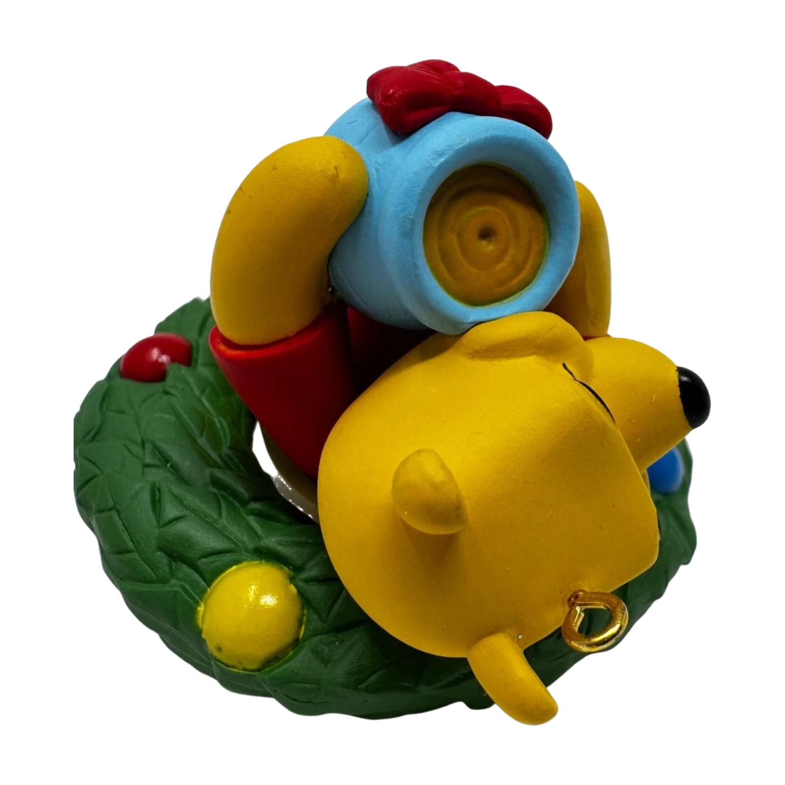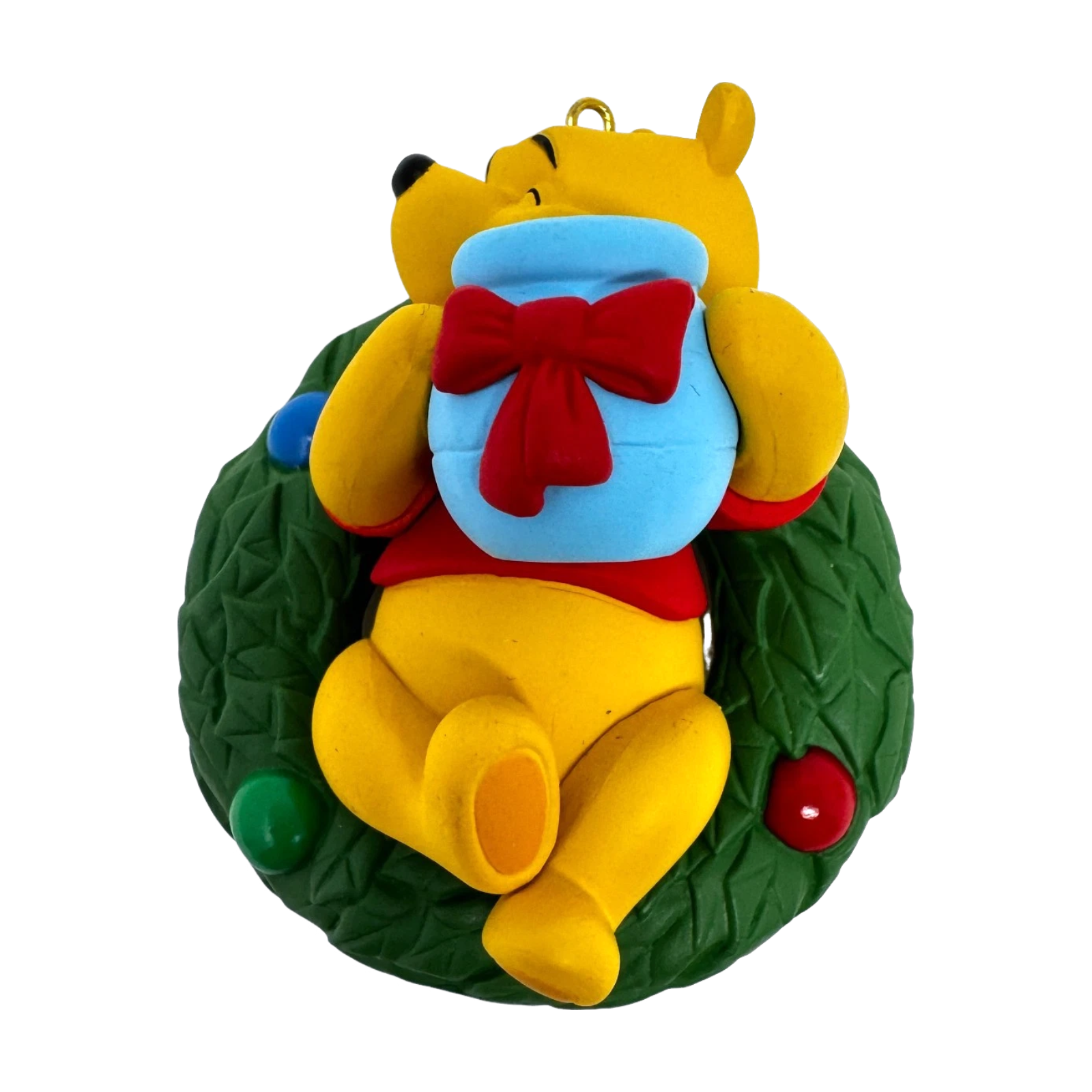 Celebrate the sweetest kind of Christmas with 2013 A Hunny of a Holiday! (Winnie the Pooh). This adorable ornament shows Pooh nestled in a festive evergreen wreath, holding a honey pot wrapped with a bright red bow — a warm tribute to his favorite treat and holiday joy. The design exudes cheer and charm, perfect for collectors and Pooh fans alike.