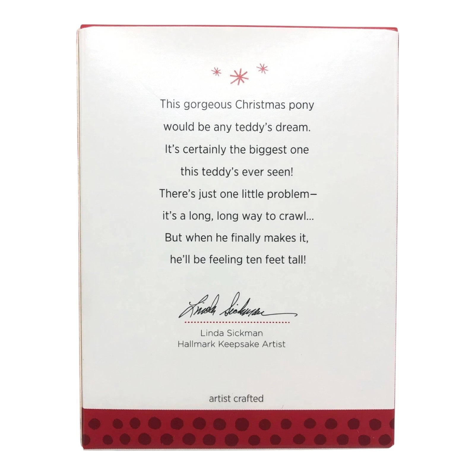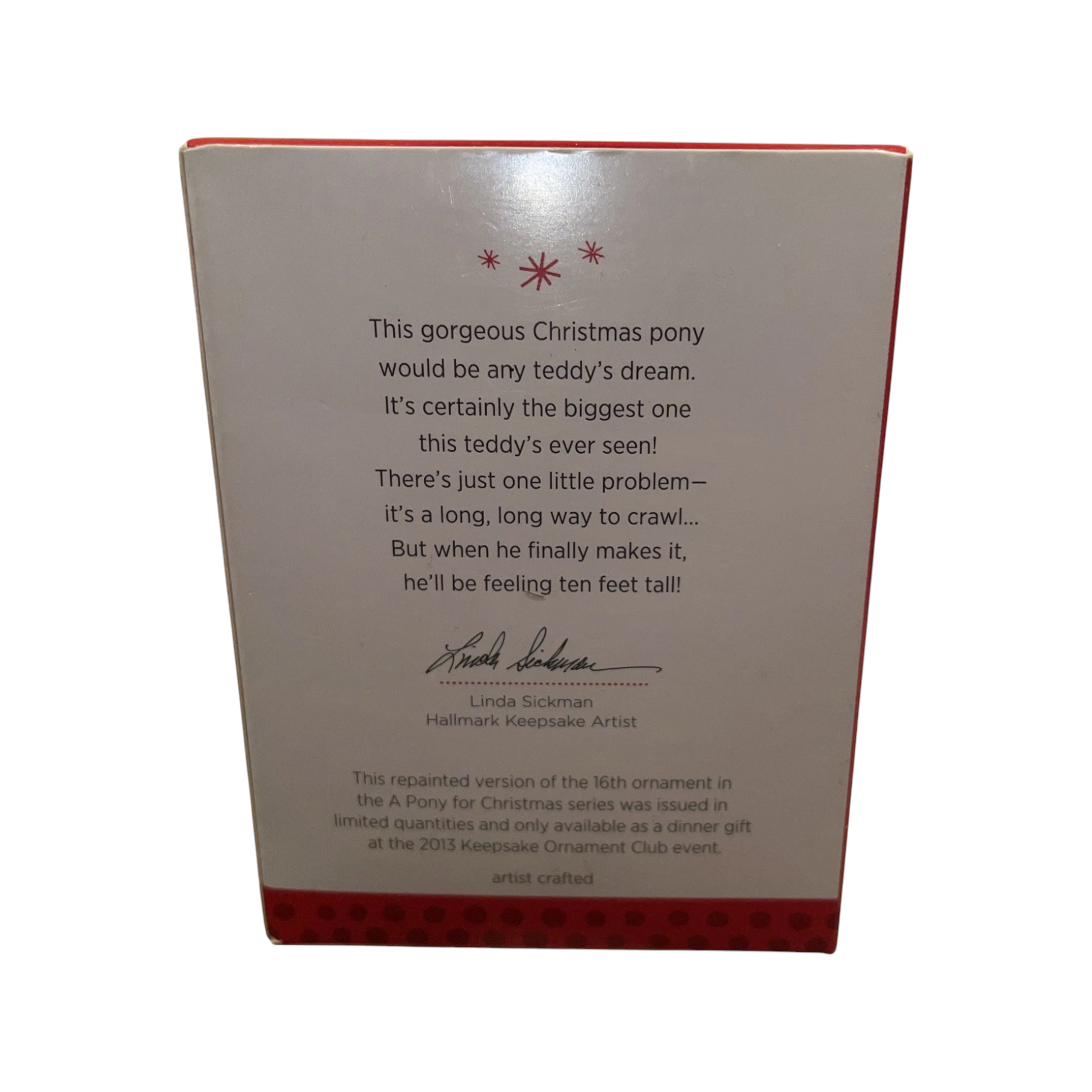 This 2013 ornament from the Hallmark Keepsake A Pony for Christmas series (#16) is an exclusive “Event Repaint” version designed by artist Linda Sickman. The design features a beautifully styled pony and sleigh scene, refined in an alternate color palette, and was released only at the Keepsake Ornament Club Event. The piece measures approximately 4.375″ W × 3.5″ H × 1.5″ D.