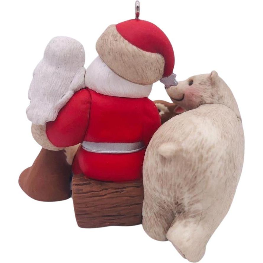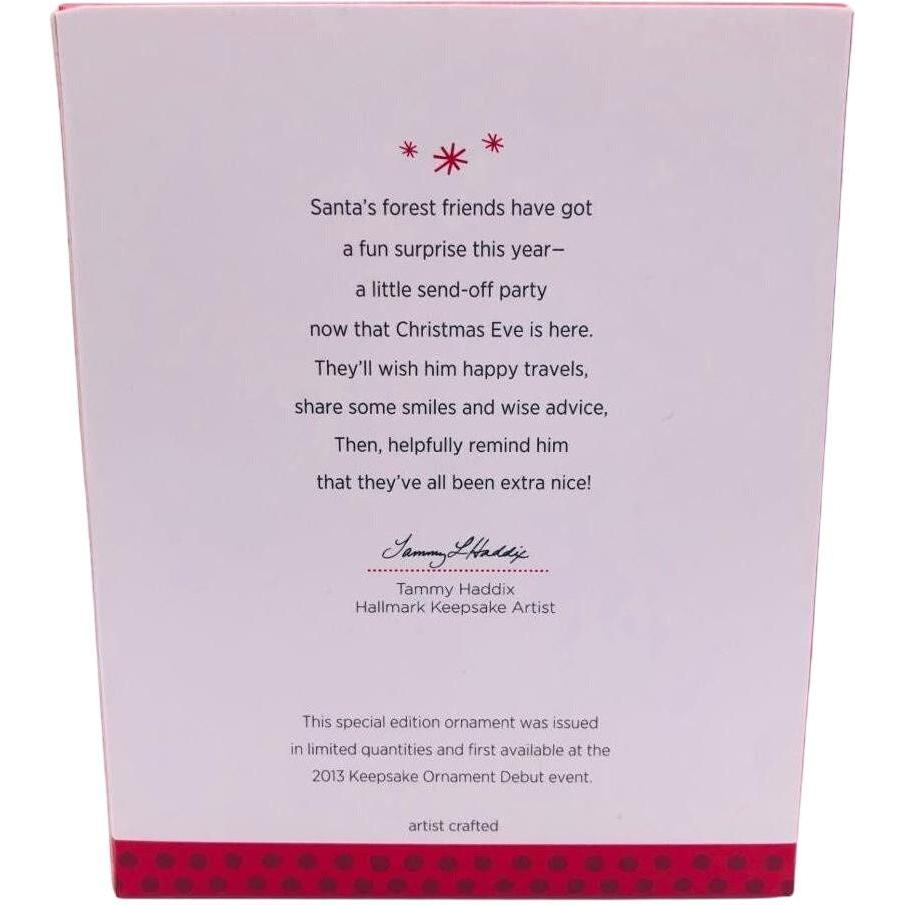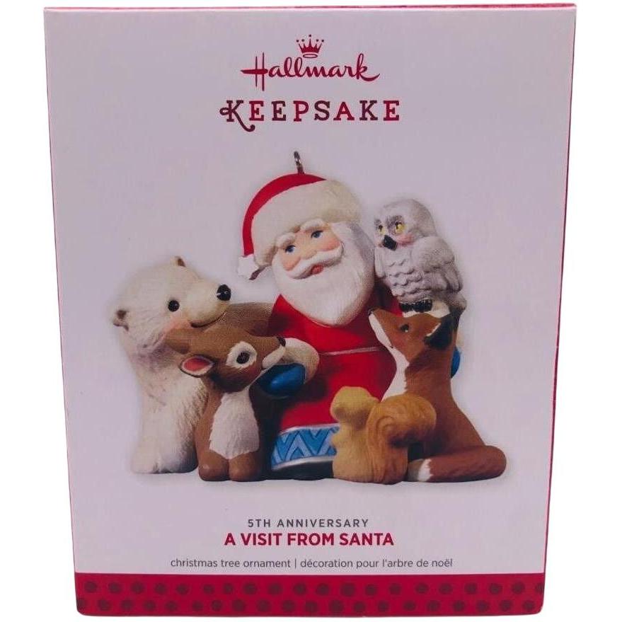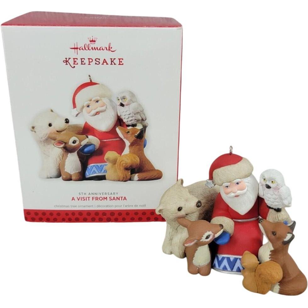 Celebrate a milestone in holiday memories with the 2013 A Visit From Santa (5th Anniversary) Keepsake ornament. Released as a Limited Quantity event piece, it honors five years of the “A Visit From Santa” series by featuring all five of the animals that have appeared to date in the series — the fawn, fox, squirrel, owl, and polar bear — gathered around Santa. Crafted by artist Tammy Haddix, it’s approximately 3.375″ wide × 2.625″ high × 2.750″ deep. Boxed as a special edition, this ornament was originally offered at the Hallmark Ornament Debut event in October 2013. It includes the ornament itself and original packaging when available.