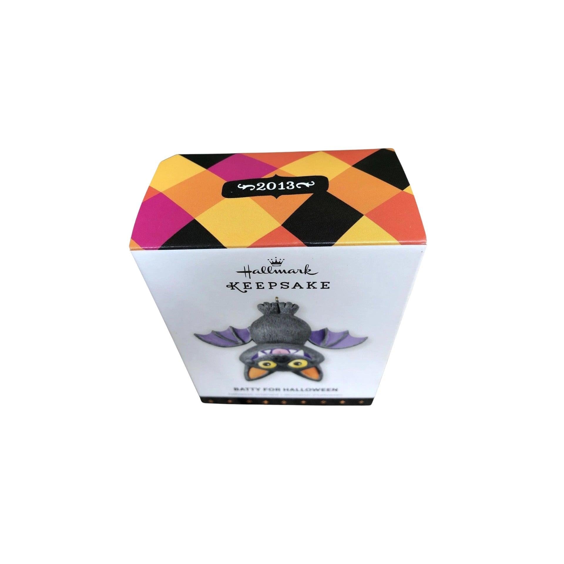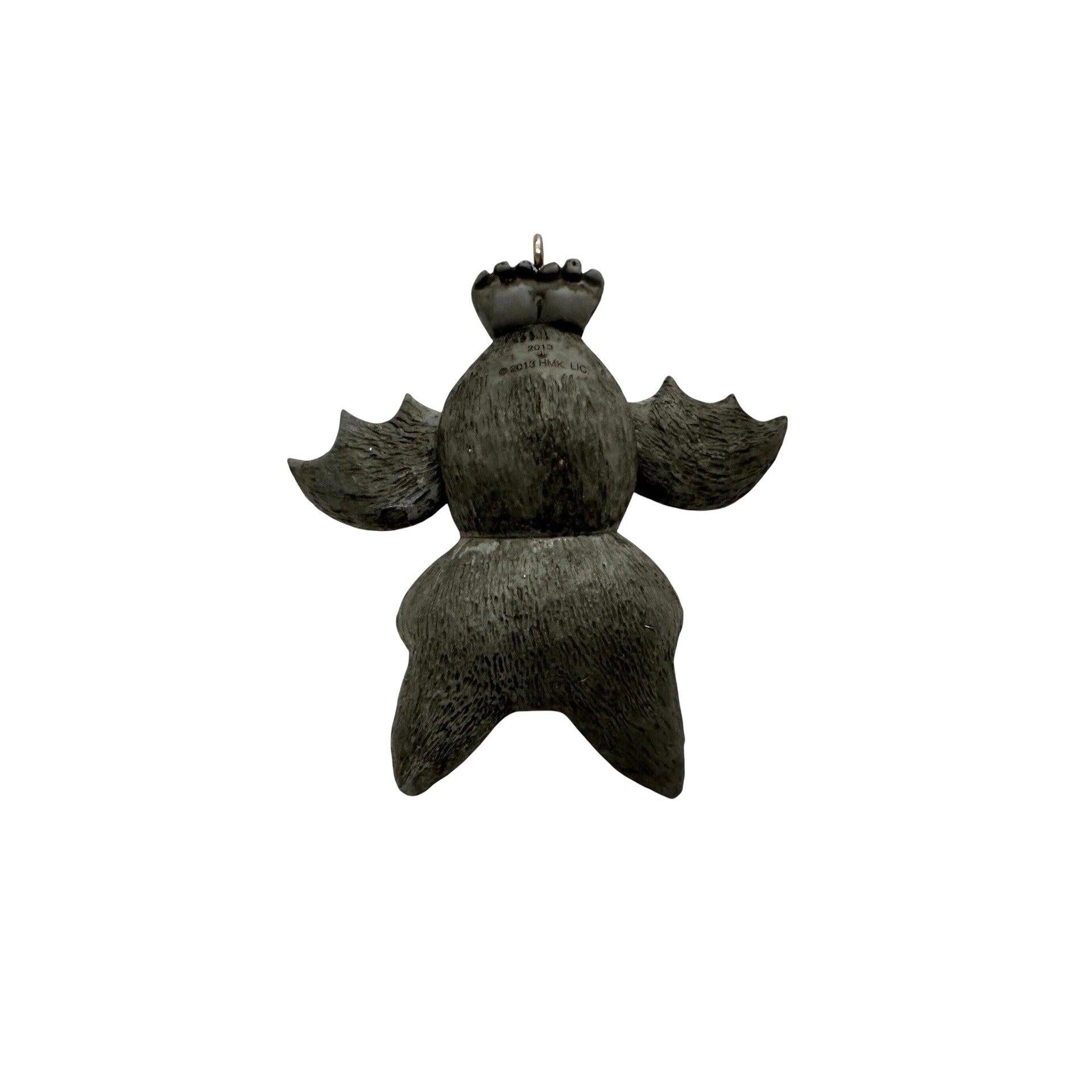 Get ready for some spooky seasonal fun with the 2013 “Batty for Halloween” ornament by Hallmark (item number QFO5215). This whimsical Gold Crown Exclusive features an upside-down bat with moving wings and a mischievous toothy grin—perfect for hanging on your Halloween tree or as a quirky addition to your décor. Packaged in its original box and ready to display, it requires no batteries, cords or light strings—just hang and enjoy the playful Halloween vibe.