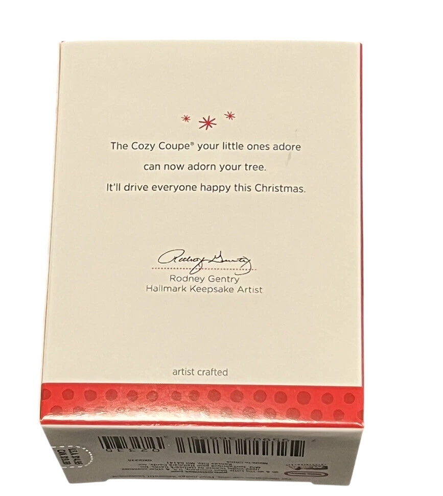 This ornament celebrates the iconic Little Tikes Cozy Coupe in miniature, reflecting a beloved childhood staple that evokes memories of first rides and playful drive-around adventures. It features a detailed sculpt of the classic red-and-yellow coupe, scaled for tree display and produced by Hallmark as part of its Keepsake line. Designed by artist Rodney Gentry, the piece blends nostalgia for the toy with holiday decorative appeal. With its compact size and childhood-favorite motif, it makes a meaningful addition for toy-afficionado collectors, families remembering early years, or themed décor around children’s play and memories.