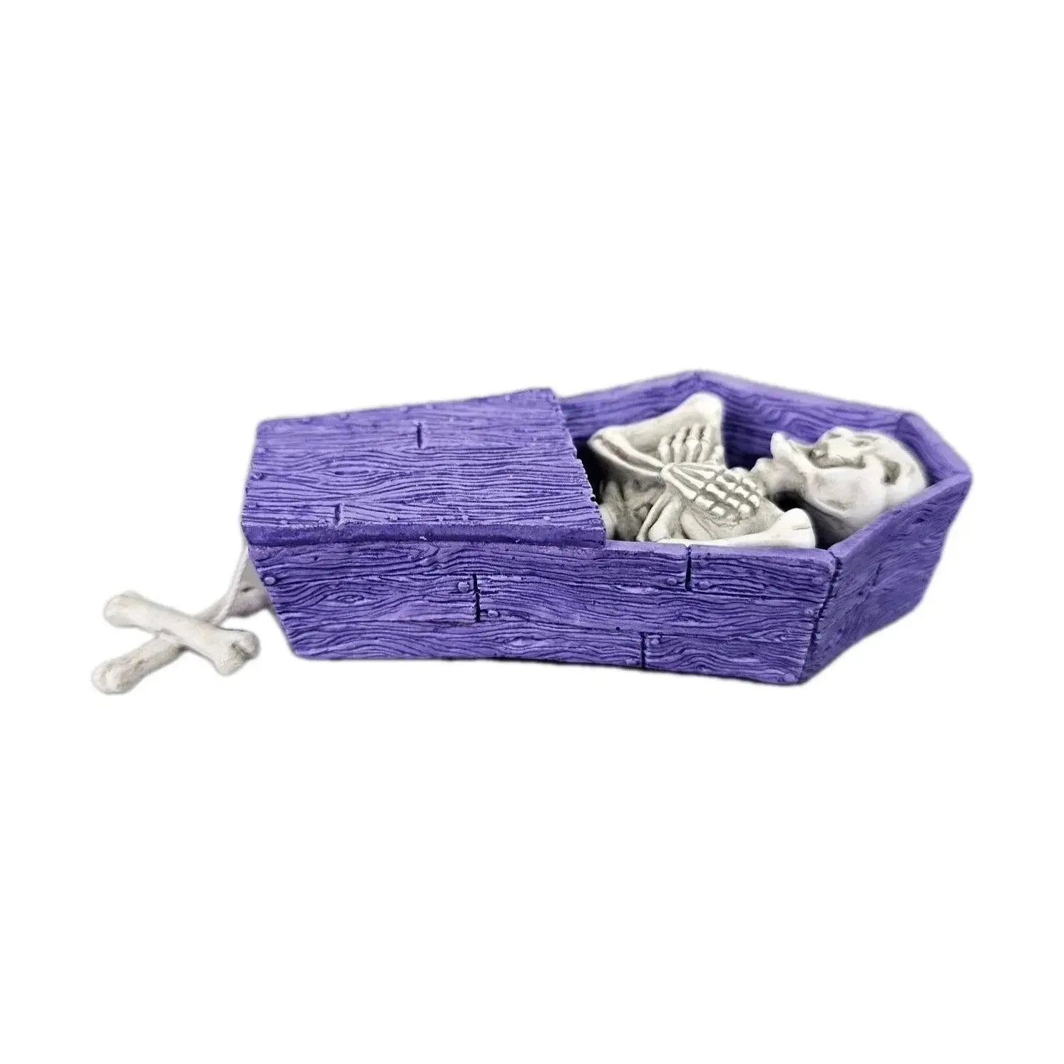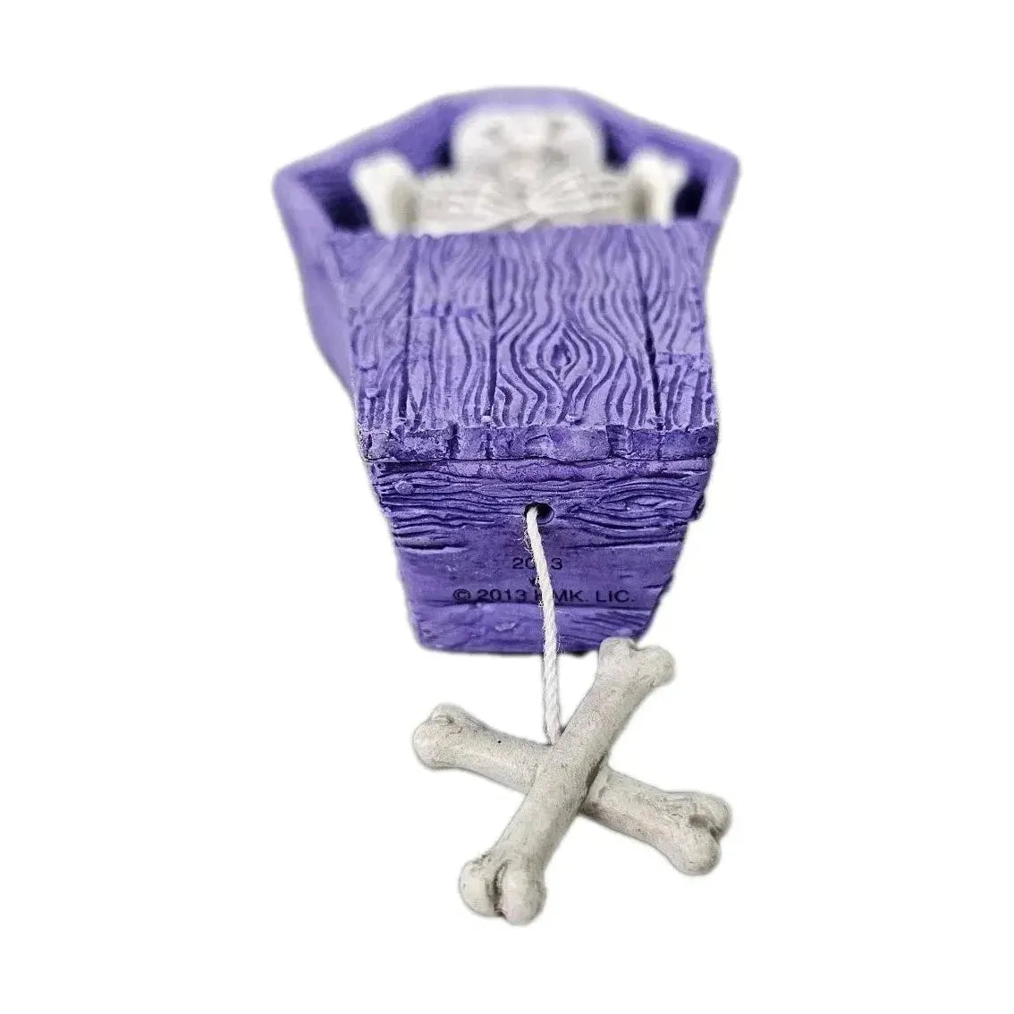 This 2013 Keepsake ornament from Hallmark (item QFO5222) is a spooky, fun piece: styled as a purple coffin, it features a skeleton inside with a pull-string mechanism that makes the skeleton rattle and move when you tug it. As a Gold Crown exclusive, designed by artist Robert Chad, it holds special appeal for collectors of Halloween or off-beat holiday ornaments. The dramatic height (~5″) gives it presence on a tree or display shelf.