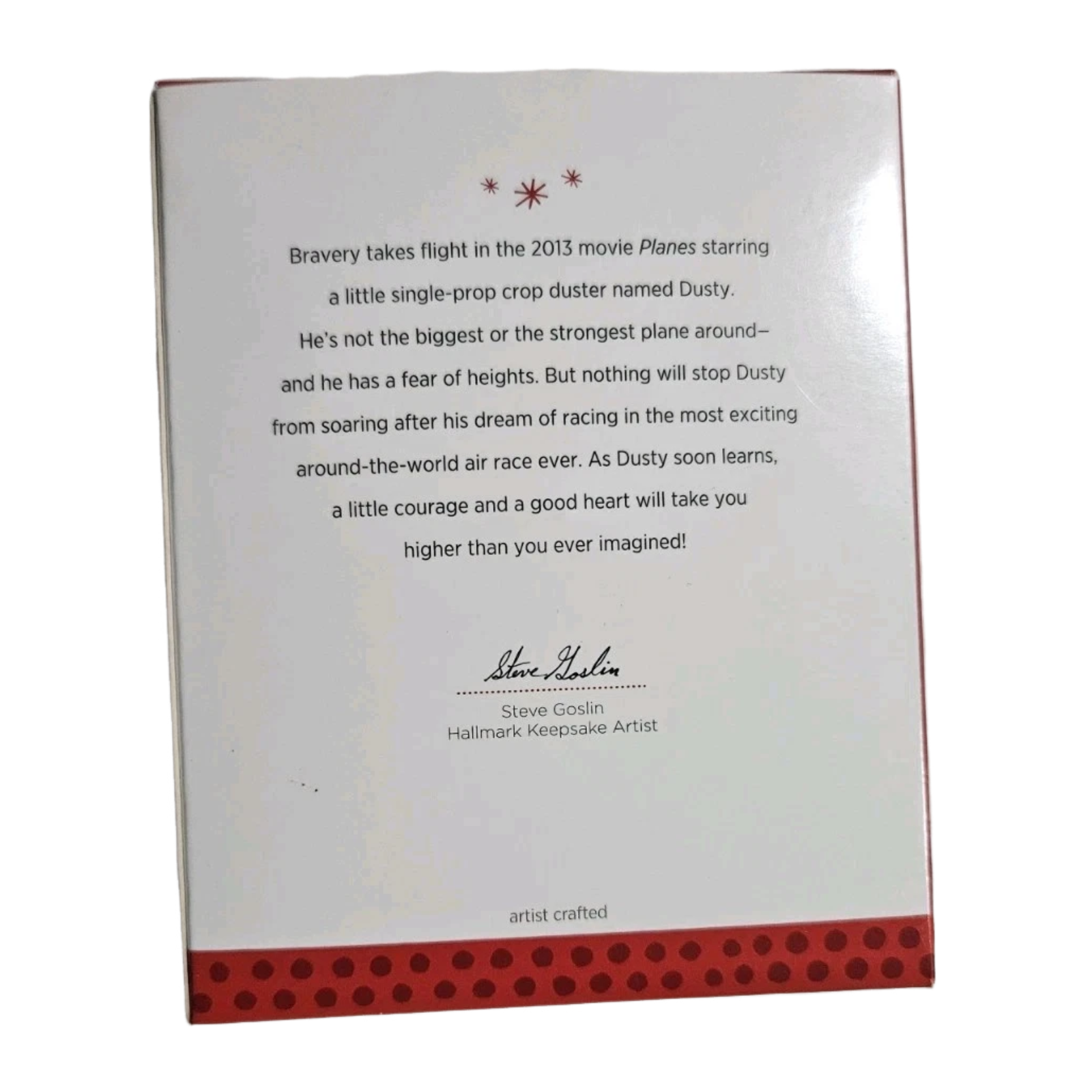 Take flight with holiday courage and charm through the 2013 Dusty (Disney – Planes) Keepsake ornament. This dynamic ornament, designed by Steve Goslin, features Dusty Crophopper—the determined crop-duster from Disney’s Planes—with a propeller that really turns and trees that rotate in the base design, bringing motion to your holiday décor. Rendered in vibrant orange and white, it's crafted from sturdy mixed materials, boxed, and hang-ready—no batteries required.