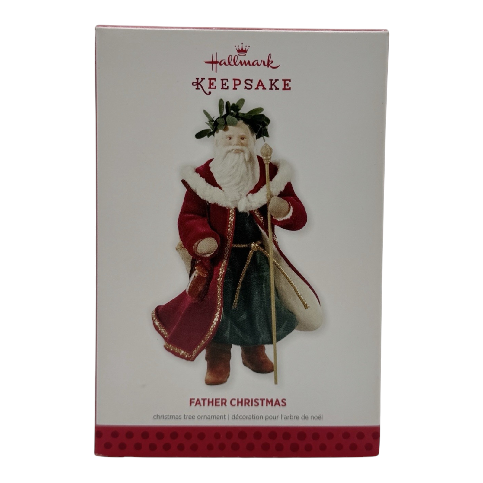 This 2013 release from the Hallmark Keepsake line is a special Event Colorway version of the beloved “Father Christmas” series, designed by artist Joanne Eschrich. Instead of the traditional red robe, this variant features Father Christmas in a white and gold color scheme, lending it an elegant and collectible appeal. Standing at approximately 5.25″ tall, the ornament retains the classic pose of Father Christmas holding his staff and bag of presents, yet the unique coloration makes it a standout piece for serious collectors.