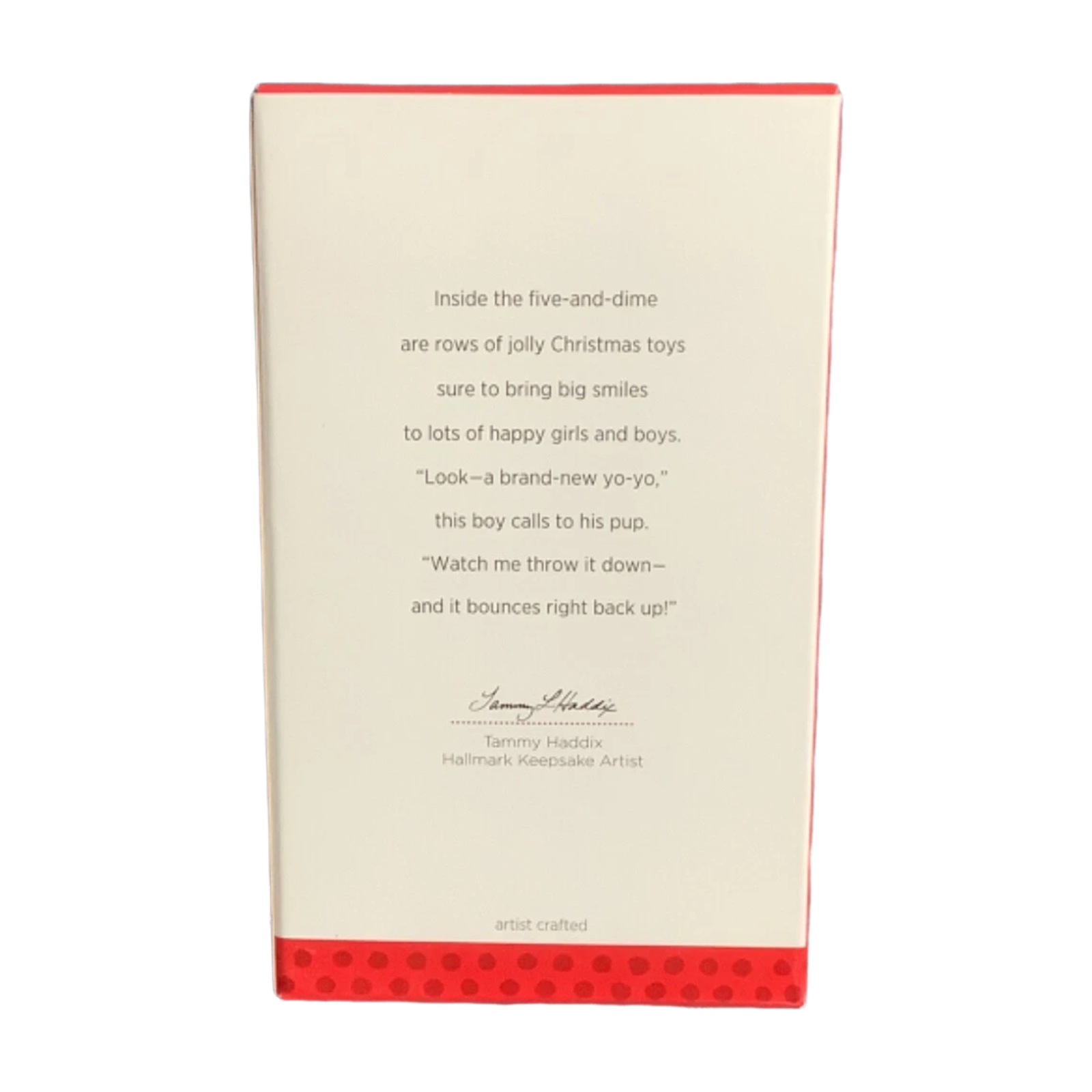 Step into the nostalgic charm of the holidays with Five & Dime Store, the eleventh installment in Hallmark’s enchanting Christmas Window Keepsake Ornament Club series, released in 2013. This whimsical vignette captures a young boy and his curious puppy gazing into a festive storefront, tempted by a sign reading “Visit with Santa and get a free yo‑yo.” Crafted with heartwarming detail by Tammy Haddix, this keepsake arrives mint‑in‑box, dated 2013, and requires no power—simply hang and let its story unfold in your collection.