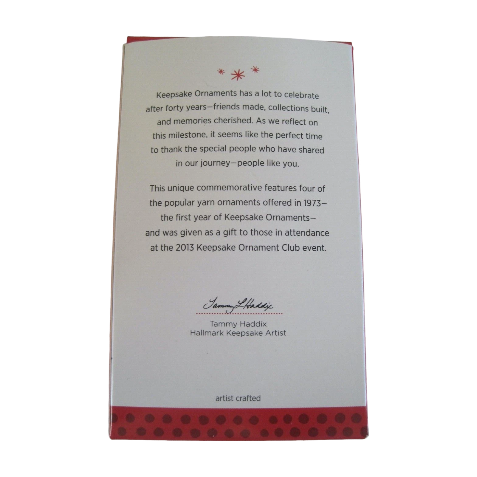 The 2013 Forty Years of Memories Hallmark Keepsake Ornament is a special event exclusive commemorating four decades of Hallmark Keepsake ornaments, celebrating the company’s 40th anniversary (1973–2013) with a nostalgic seasonal design. Released as an exclusive for the 2013 Keepsake Ornament Club “Hangin’ With Your Buddies” event, this collectible features a festive scene with Santa Claus, Mrs. Claus, a snowman, and an angel—each inspired by early yarn ornament styles from 1973. Its multicolored detail and commemorative theme make it a meaningful addition to any Hallmark collection, especially for longtime ornament enthusiasts who appreciate anniversary exclusives. A wonderful piece for collectors seeking depth and history in their holiday décor.