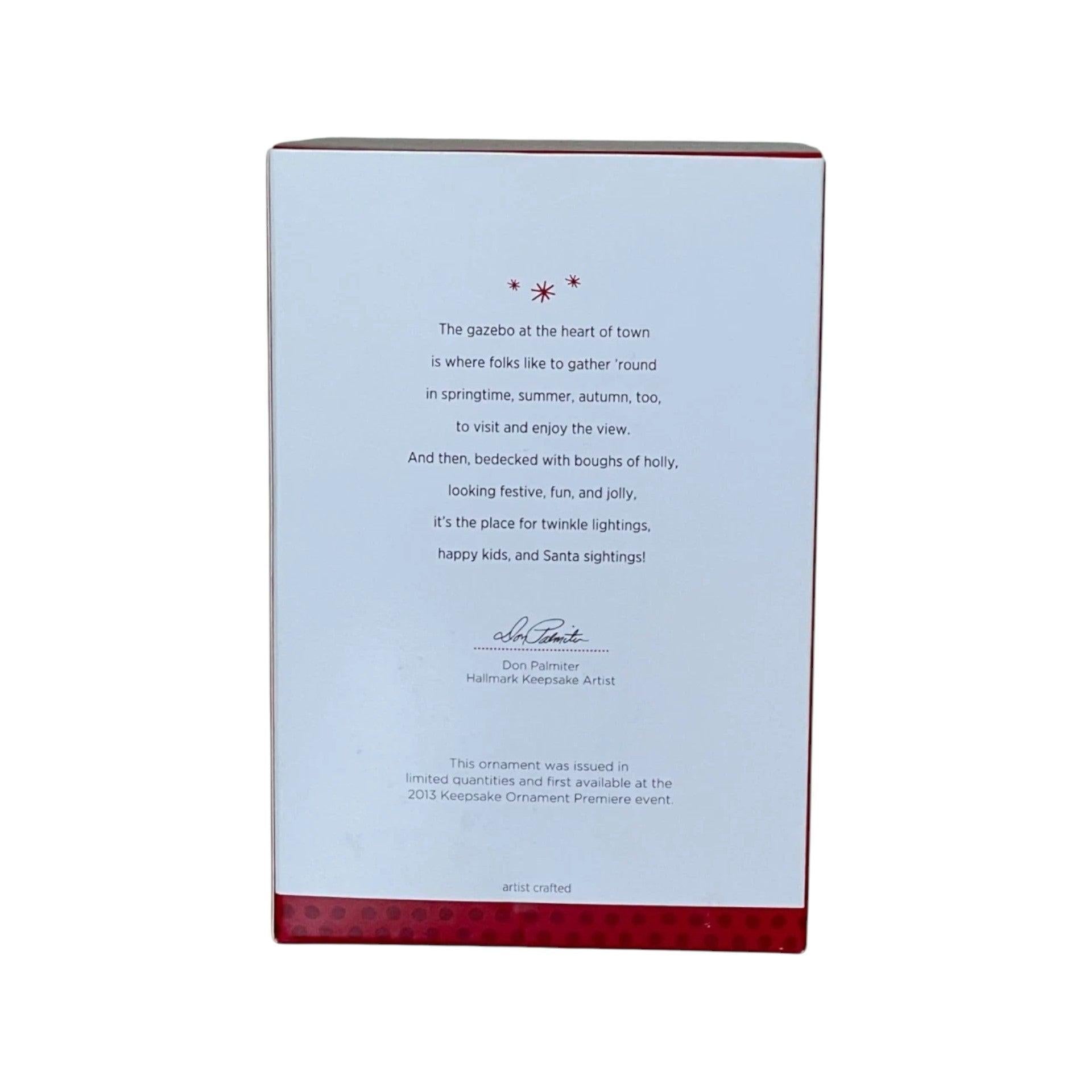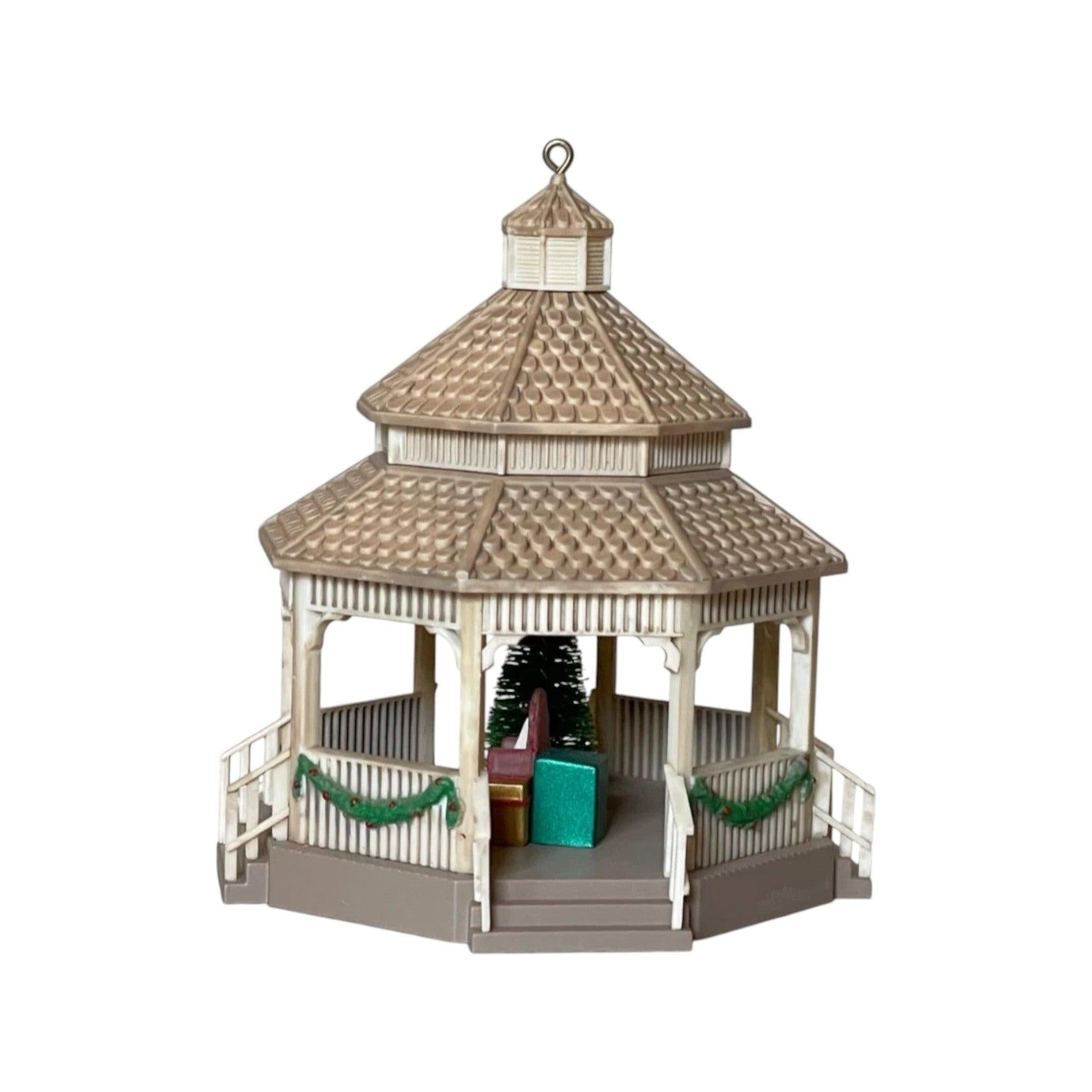 This detailed 2013 Gazebo ornament, part of Hallmark’s Nostalgic Houses and Shops series, showcases a charming Christmas gazebo beautifully adorned with garland and a festive tree. Inside, a plush red chair sits beside a sign that reads “Santa Back Soon,” perfect for a heartwarming holiday display. Crafted of durable plastic, this limited‑edition ornament arrives mint‑in‑box with its original packaging and tag, and requires No Power Needed—no batteries, lights, or cords involved.