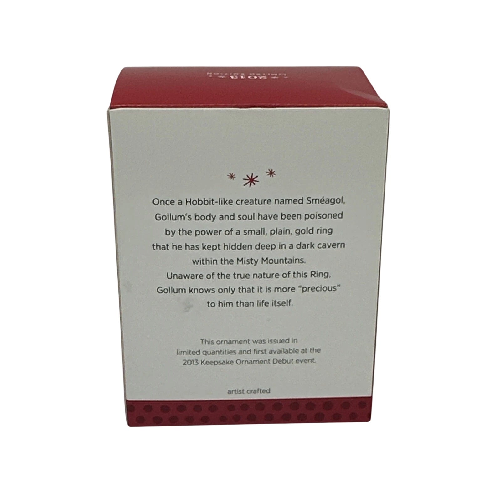 Slip into the shadowy world of Middle-earth with the 2013 Gollum (The Hobbit – Limited Quantity) Keepsake ornament by Hallmark. This striking collectible depicts Gollum in his iconic pose from The Hobbit: An Unexpected Journey, crouched and clutching “his precious” ring. Designed as one of six limited-quantity ornaments released at the 2013 Hallmark Ornament Debut Weekend Event, it features intricate sculpting and faithful attention to detail.