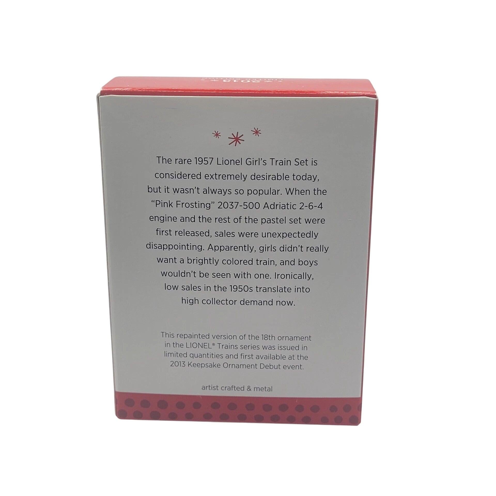 Celebrate a unique piece of Lionel Trains history with the 2013 Hallmark Keepsake Ornament featuring the 2037 Steam Locomotive in a special pink colorway. Originally introduced by Lionel to provide a distinctive engine for female railroad enthusiasts, this limited-edition ornament was released during the October Keepsake Ornament Premiere. Crafted with intricate detail, it showcases the classic 2037 model in a vibrant pink hue, making it a standout addition to any collection. The ornament comes in its original packaging, ensuring its mint condition.