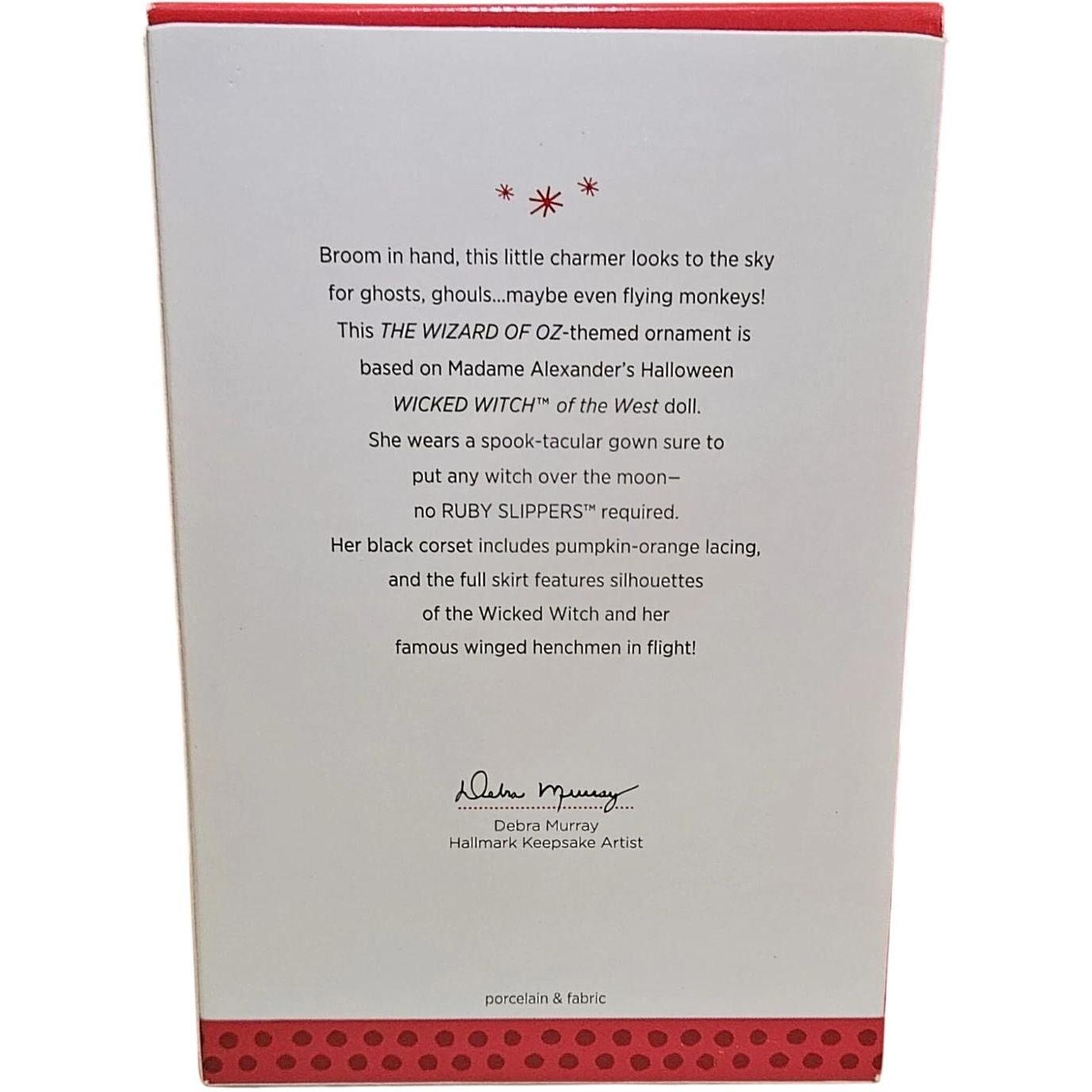 A hauntingly elegant addition to your holiday collection, this 2013 ornament features the Wicked Witch of the West as envisioned by Madame Alexander. She stands in a flowing porcelain gown with scalloped hem, a black corset laced with pumpkin-orange details, and a dramatic fabric cape. Her green face and pointed witch’s hat are signature, and she holds a broom topped with a torch-like flame. The packaging includes the original Keepsake Club box, and the hat is accented with a satin ribbon. No batteries, cords, or lights are required—it’s purely decorative.