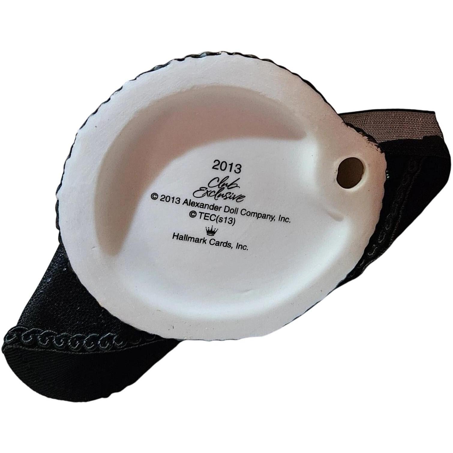 Materials: Porcelain body with fabric cape, satin ribbon around hat