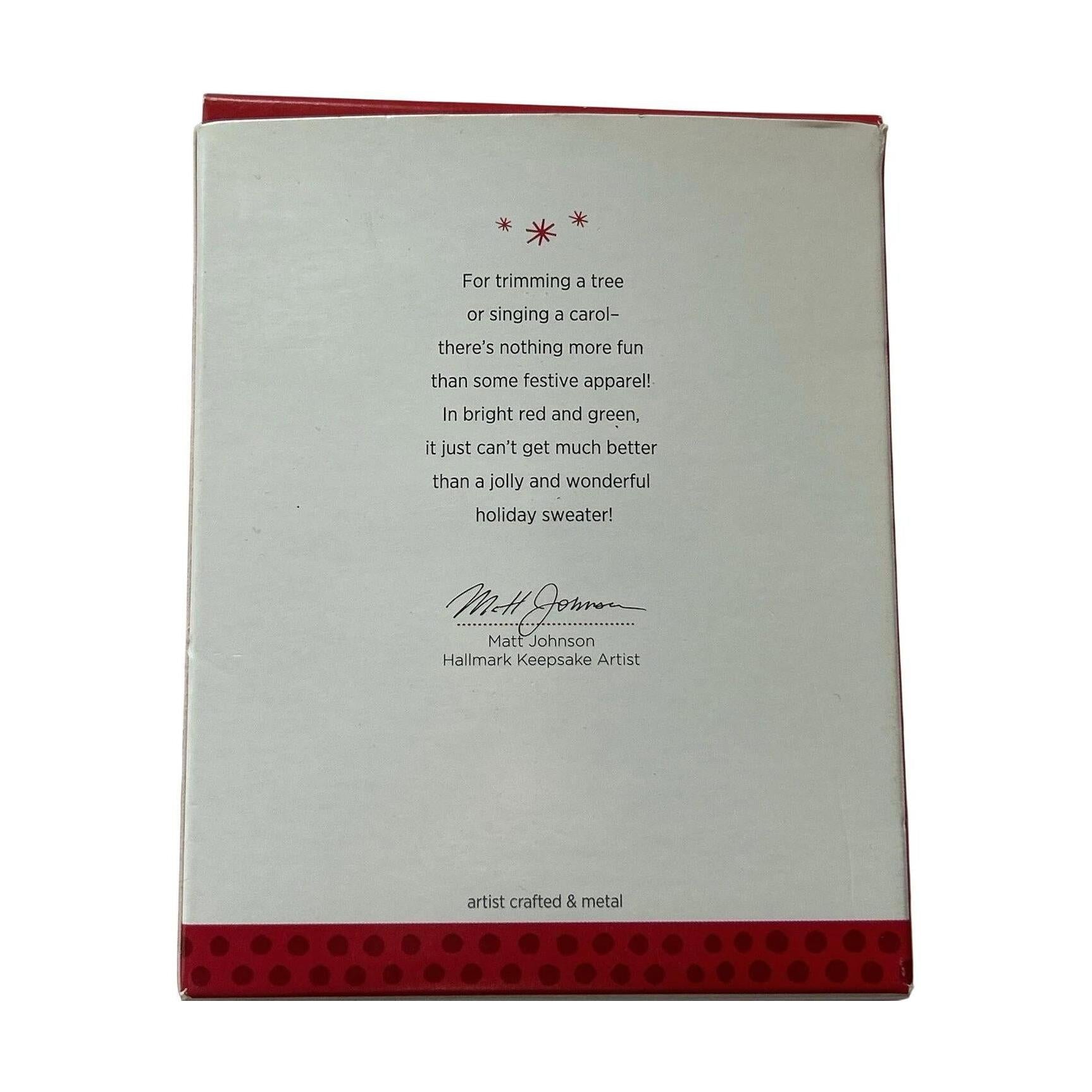 This ornament from 2013 features a vibrant “ugly holiday sweater” design fashioned into a tree-hanging keepsake. The sweater is bright red and decorated with blue and green ornaments and bells in orange and yellow—evoking the fun and nostalgia of the “ugly sweater” holiday trend. Designed by artist Matt Johnson, the piece stands approximately 3.75″ high and appeals to both festive-theme decorators and collectors of fun, pop-culture-inspired ornaments.