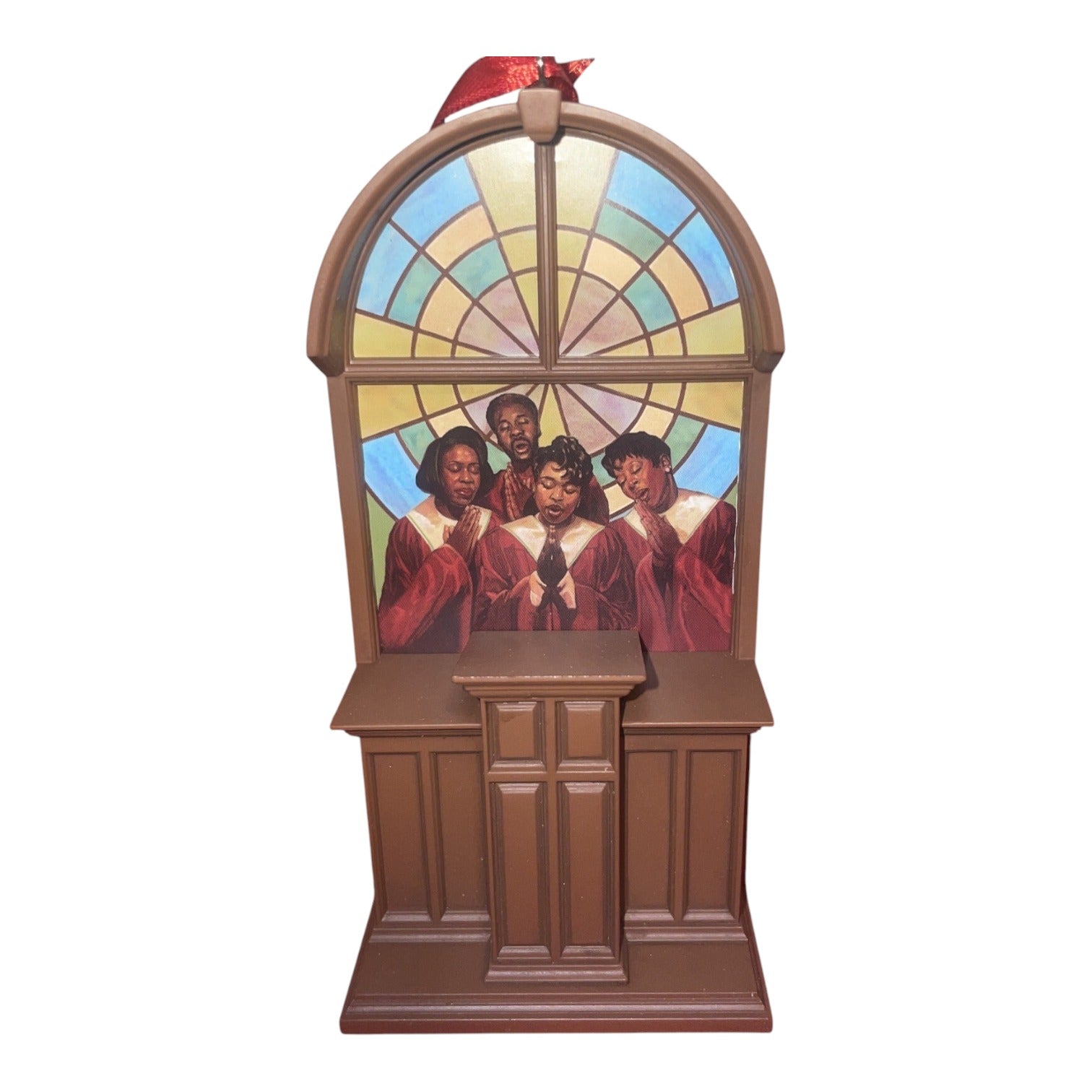 This collectible ornament features a gospel-choir scene: four African-American choir members dressed in burgundy robes stand in front of a round stained-glass window, capturing the spirit of faith and worship. The ornament is musical / “Magic”: when you press the button, the choir sings the hymn “I Will Trust in the Lord”. The design merges religious theme and holiday décor, making it ideal for faith-based collectors and those seeking a spiritually meaningful keepsake.
