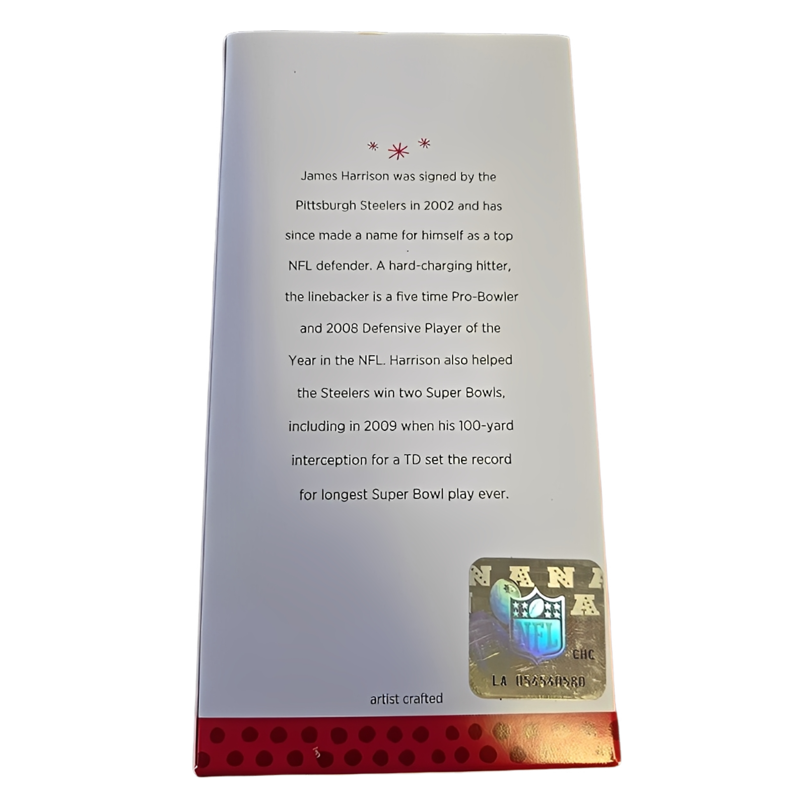 Celebrate the fierce defensive dominance of Steelers legend James Harrison with this 2013 Football Legends ornament. Posed in a powerful, running stance, this intricately sculpted resin-style keepsake captures Harrison in his Pittsburgh Steelers uniform. Originally released as a Gold Crown exclusive, the ornament stands approximately 5 inches tall and comes in its original box—ready to hang with no batteries or extra gear needed.