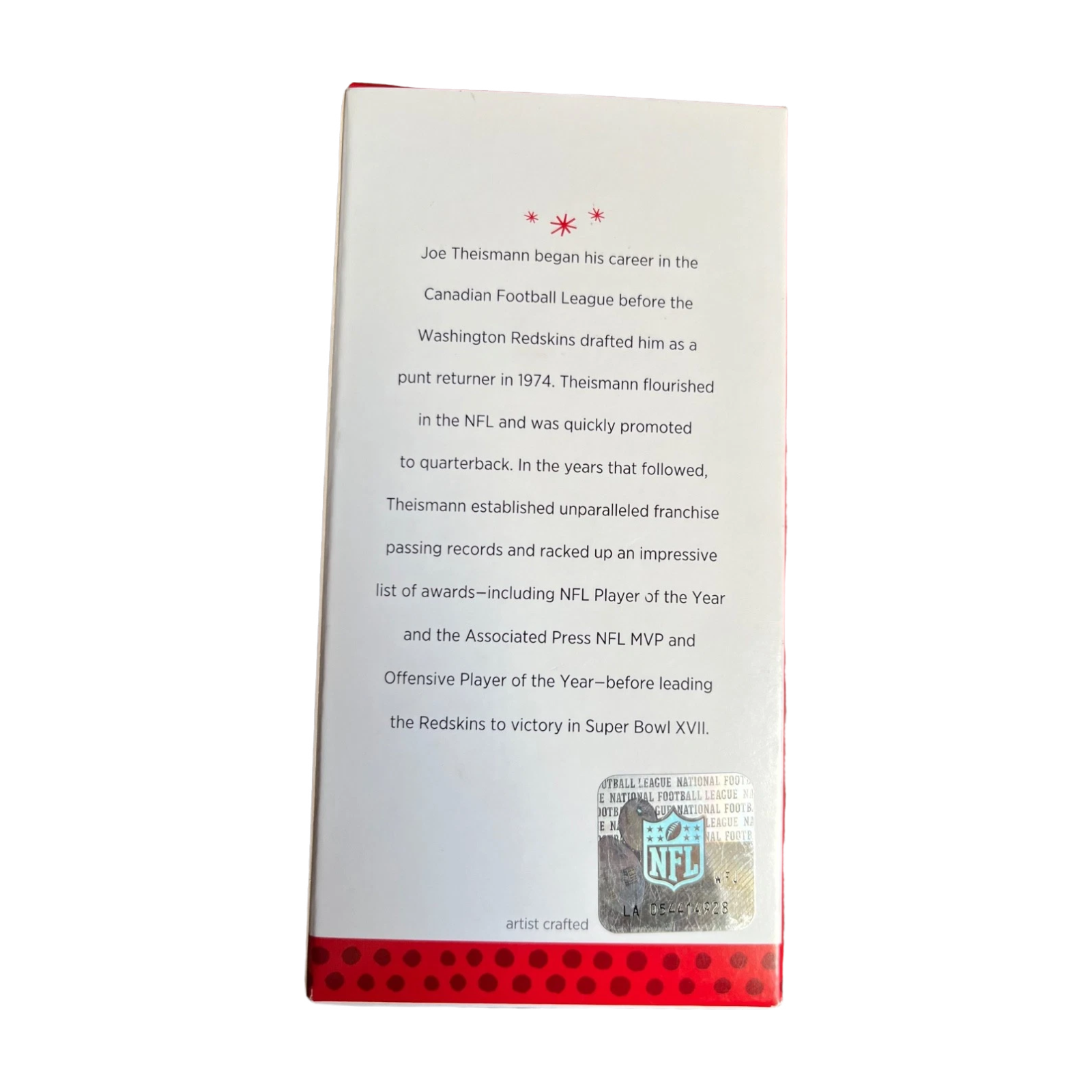Pay tribute to a football legend with this finely crafted Joe Theismann ornament, capturing the celebrated quarterback in full game-day action wearing his classic Washington uniform, number 7. This collectible piece gleams with realism and nostalgic detail, arriving mint in its original Hallmark Keepsake box—perfect for fans, collectors, or holiday displays. No batteries or lights are required—just timeless design and craftsmanship.
