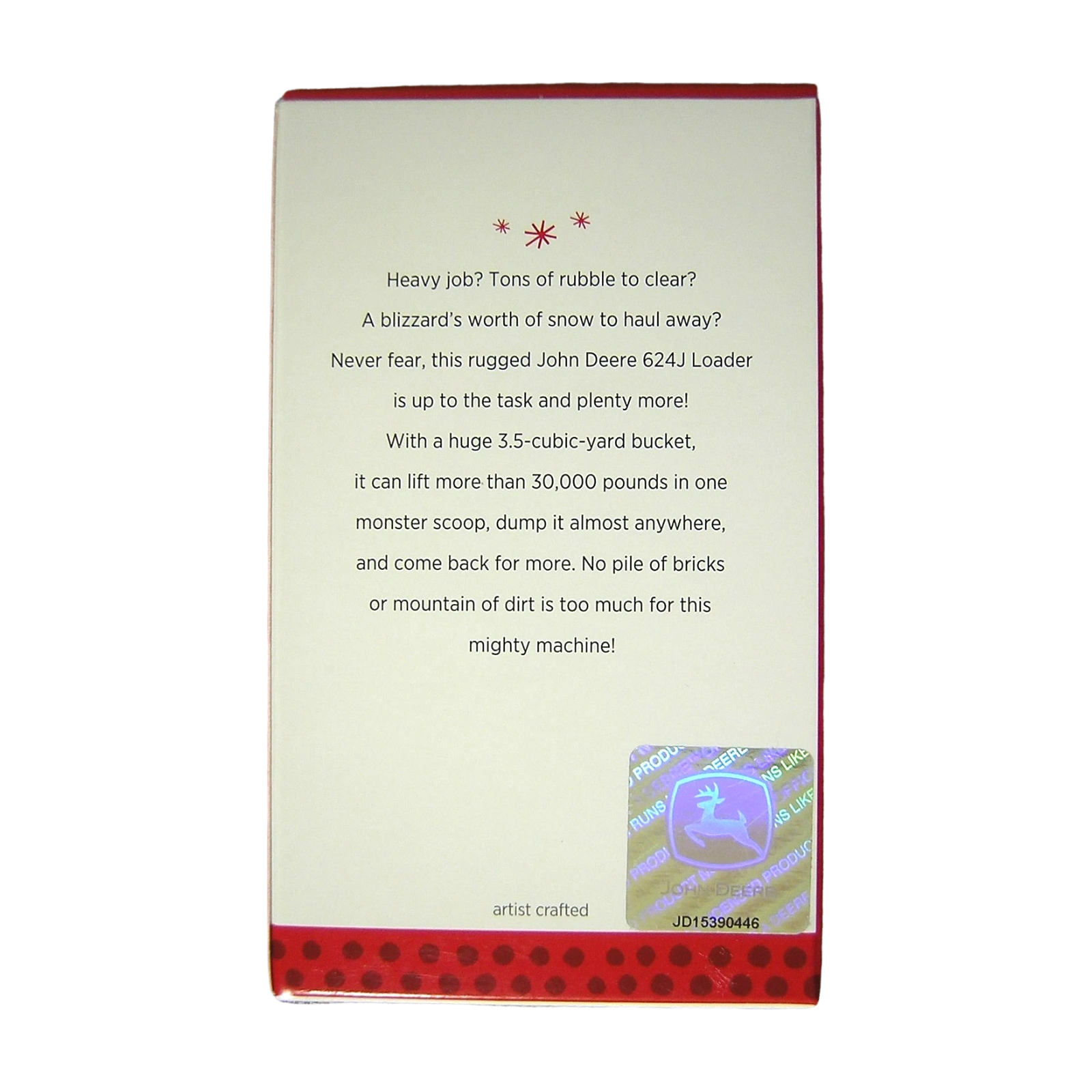 Bring rugged machinery charm to your holiday décor with the 2013 John Deere 624J Loader (John Deere) Hallmark Keepsake Ornament. This detailed miniature features rolling wheels, accurate loader bucket detail, and authentic John Deere green-and-yellow coloring. Part of the 2013 “Keepsake Secret Reveal” series, it arrives in original packaging with protective inserts—requiring no power or cords—ready to hang on your tree or display with pride