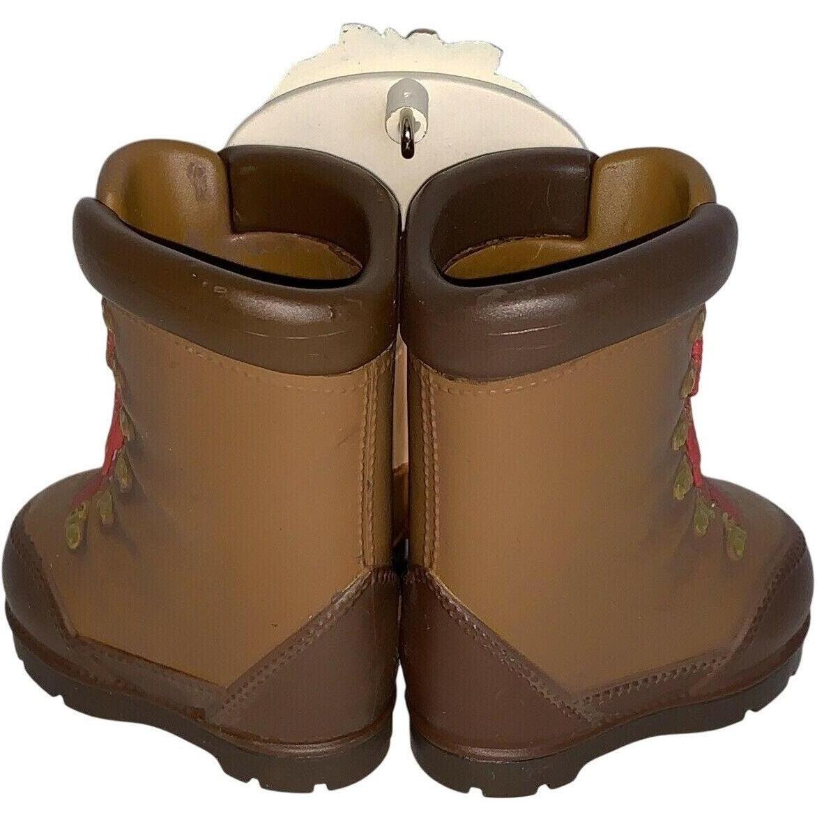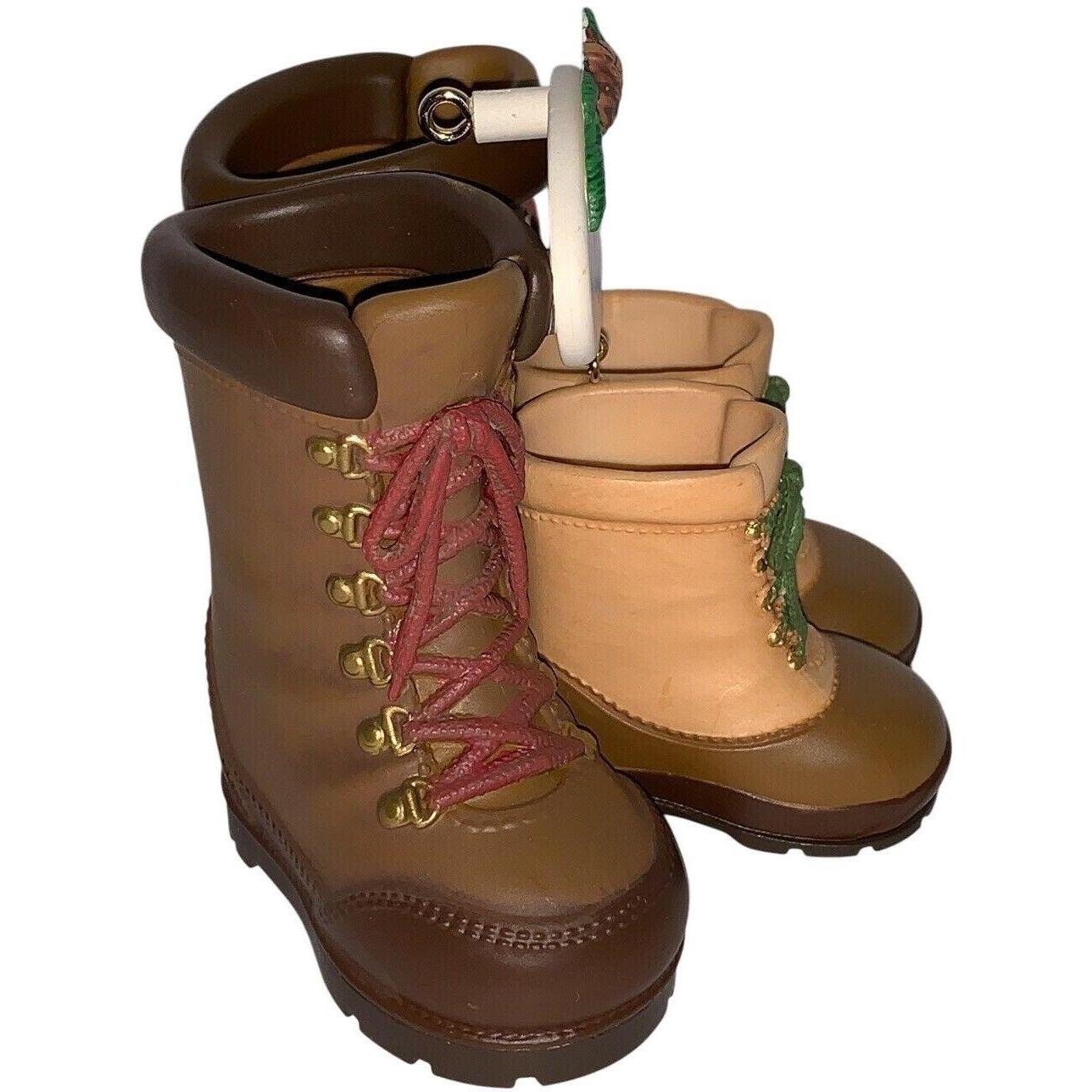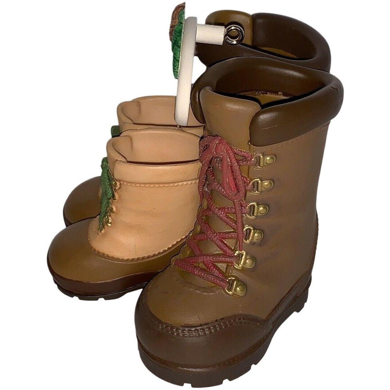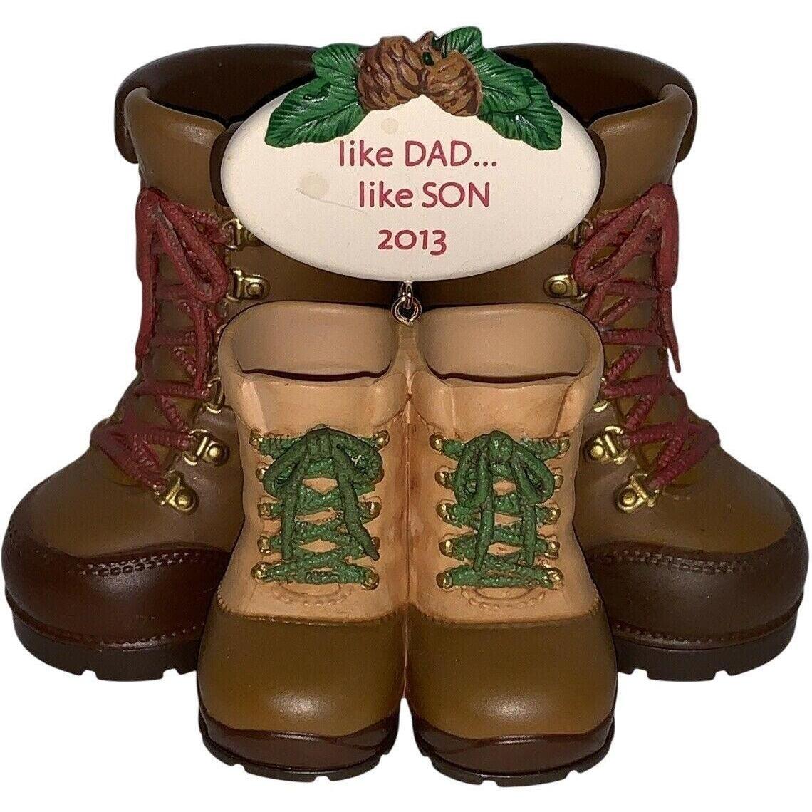 Celebrate the special bond between father and son with Like Dad, Like Son, a 2013 Hallmark Keepsake ornament. This charming piece features a pair of hiking boots—one large “Dad” boot with red laces, and a smaller “Son” boot with green laces—tied together by a festive tag that reads “like Dad … like Son 2013,” accented with pinecones and greenery. The ornament includes the resin hanging ornament itself, and often comes with the original box & tag.