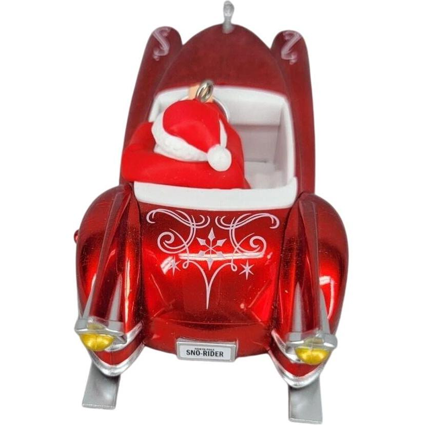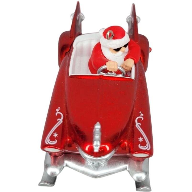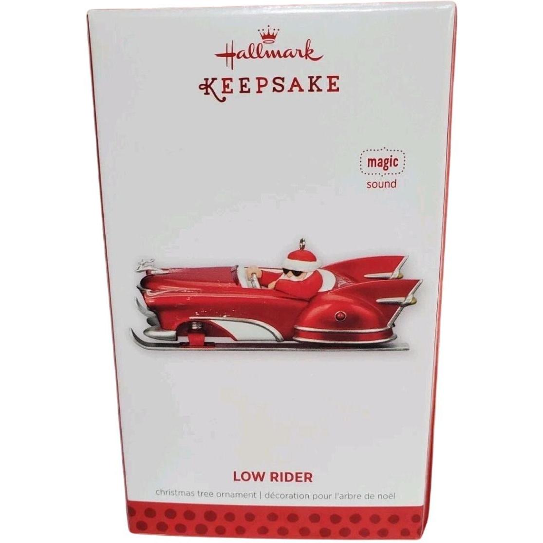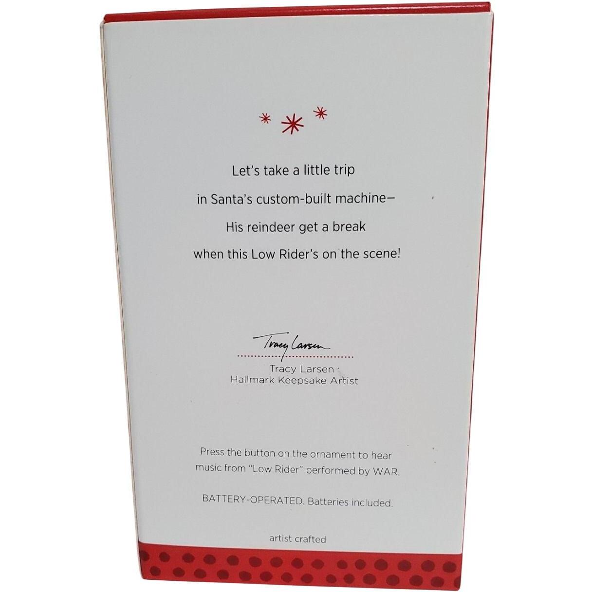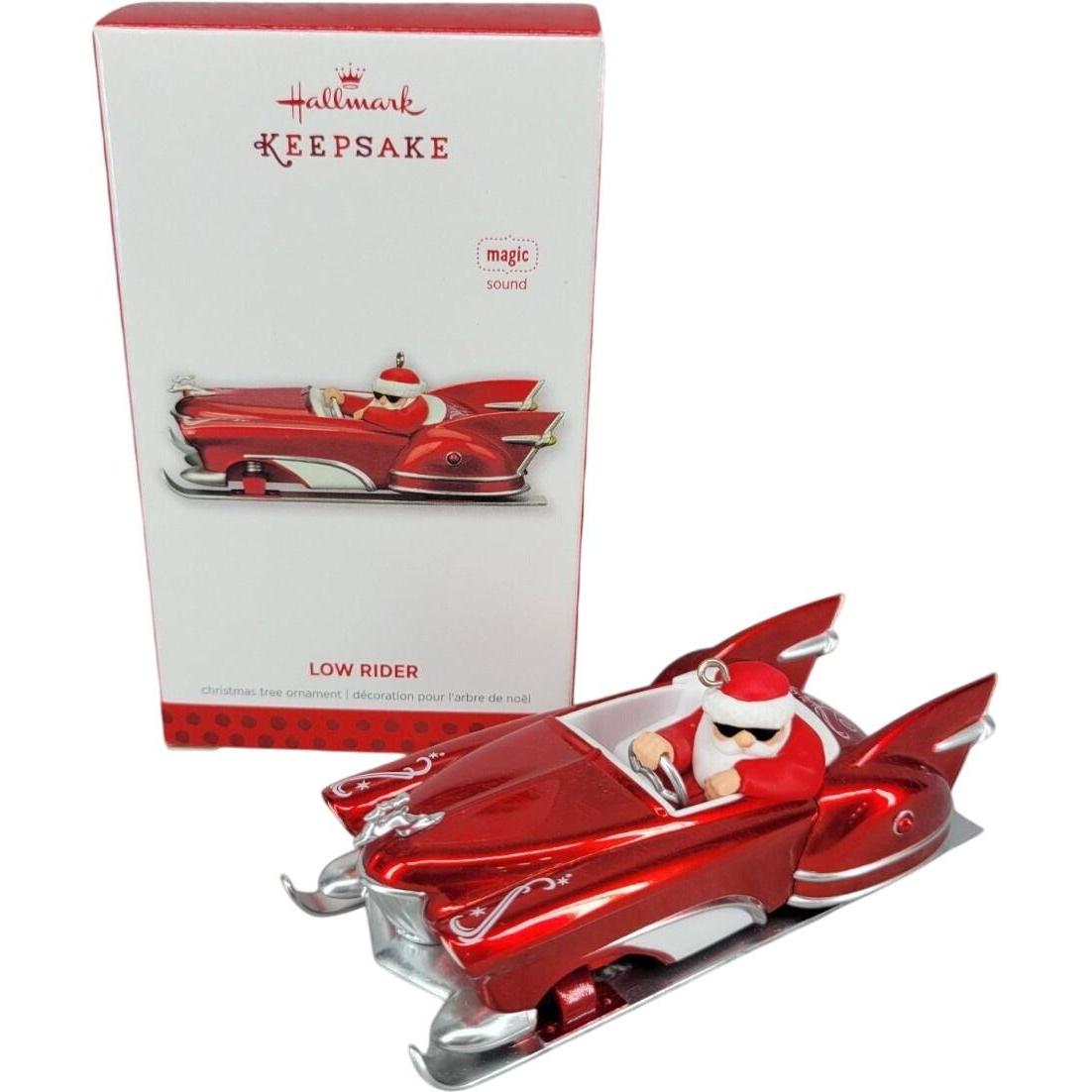 Santa trades in his sleigh for a candy-apple red lowrider on skis in this festive, fun ornament. Push the button and it plays “Low Rider” by WAR, while Santa takes a break from his reindeer—just imagine the look on your tree! The package includes the ornament in its original box and a hang tag. It comes battery-operated, using button cell batteries to power the sound feature.